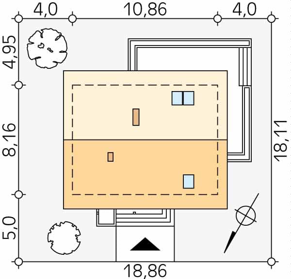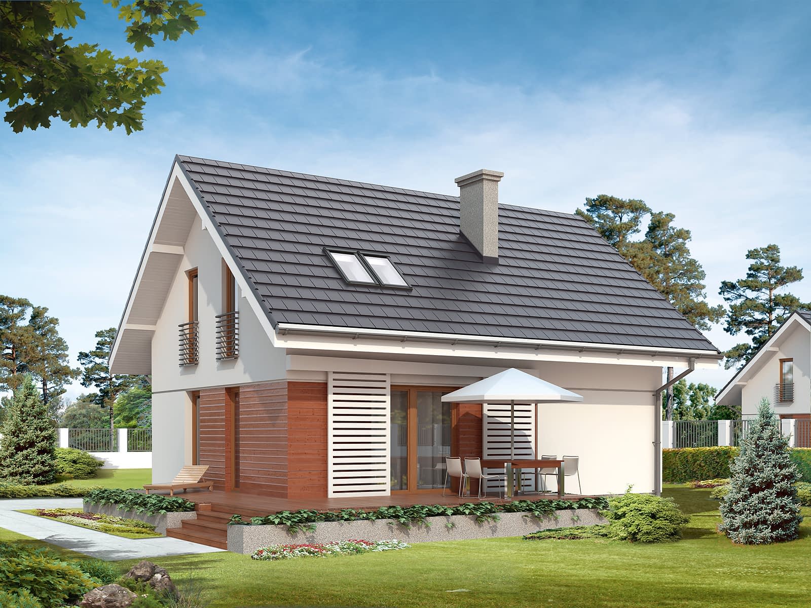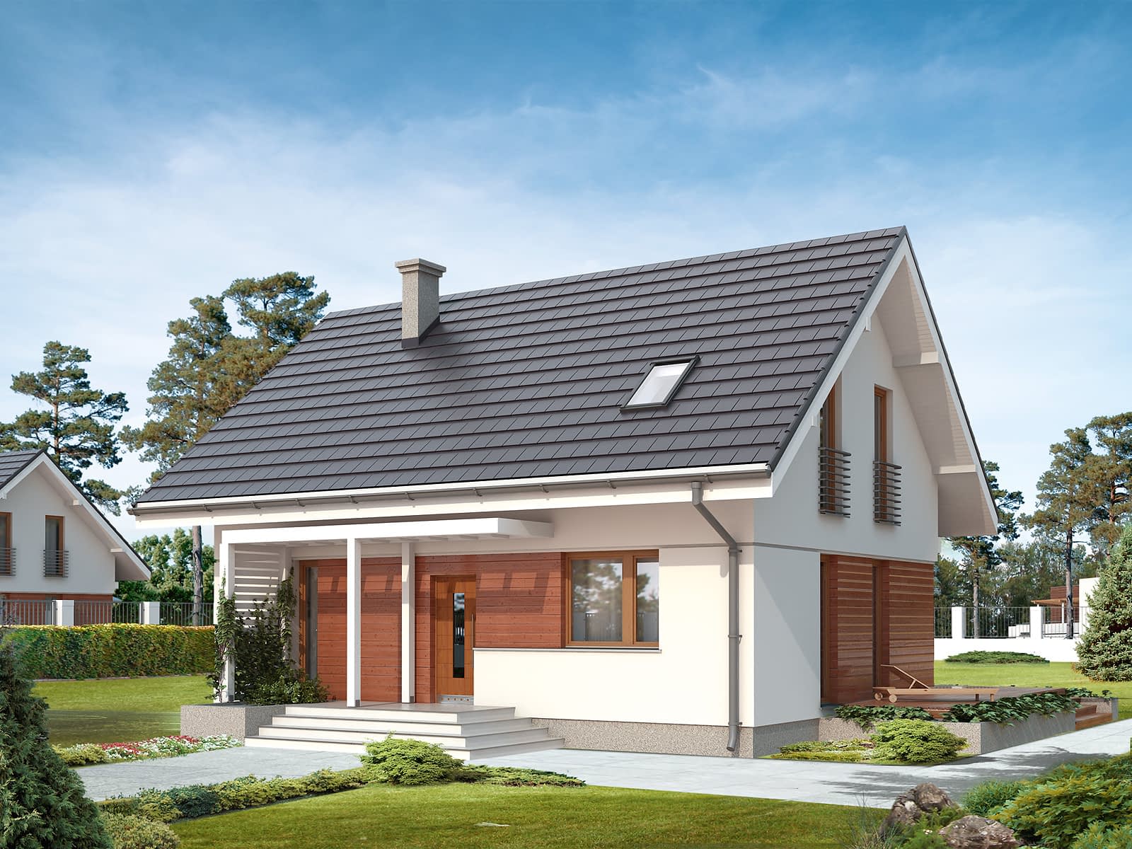 Jednorodzinny budynek mieszkalny, parterowy z użytkowym poddaszem. Niewielki dom łączący prostą bryłę i nowoczesne elewacje. Na parterze oprócz części dziennej przewidziano dodatkowy pokój oraz przestronną kotłownię.Konstrukcja