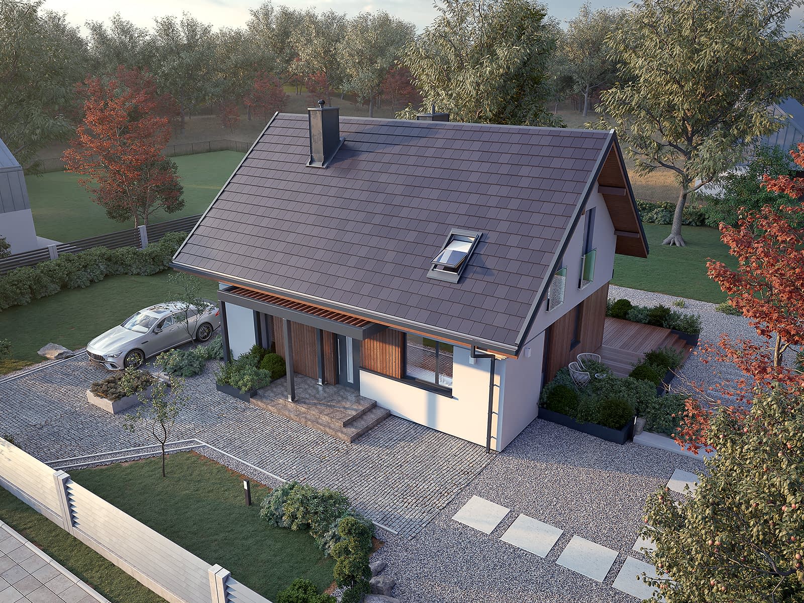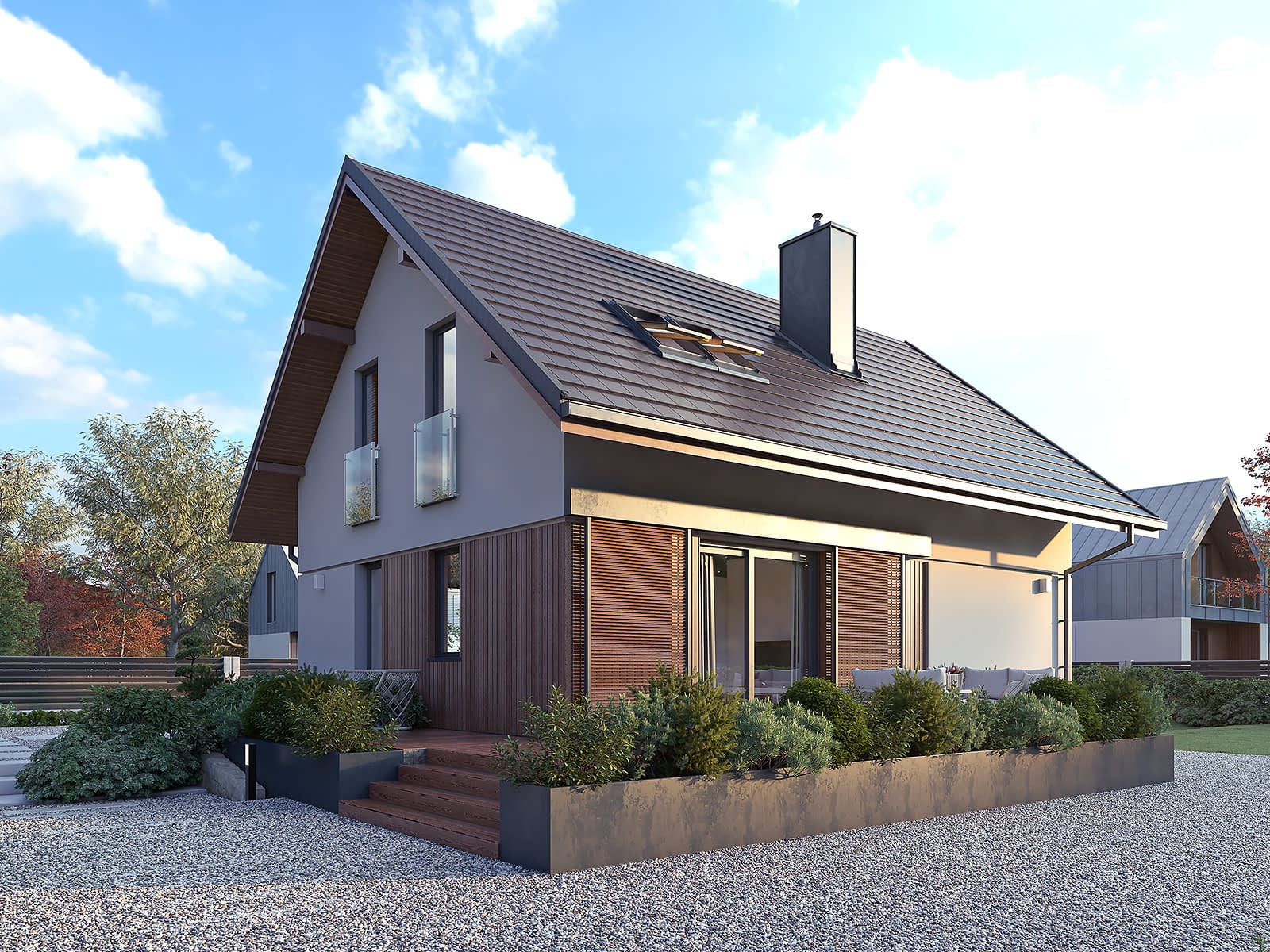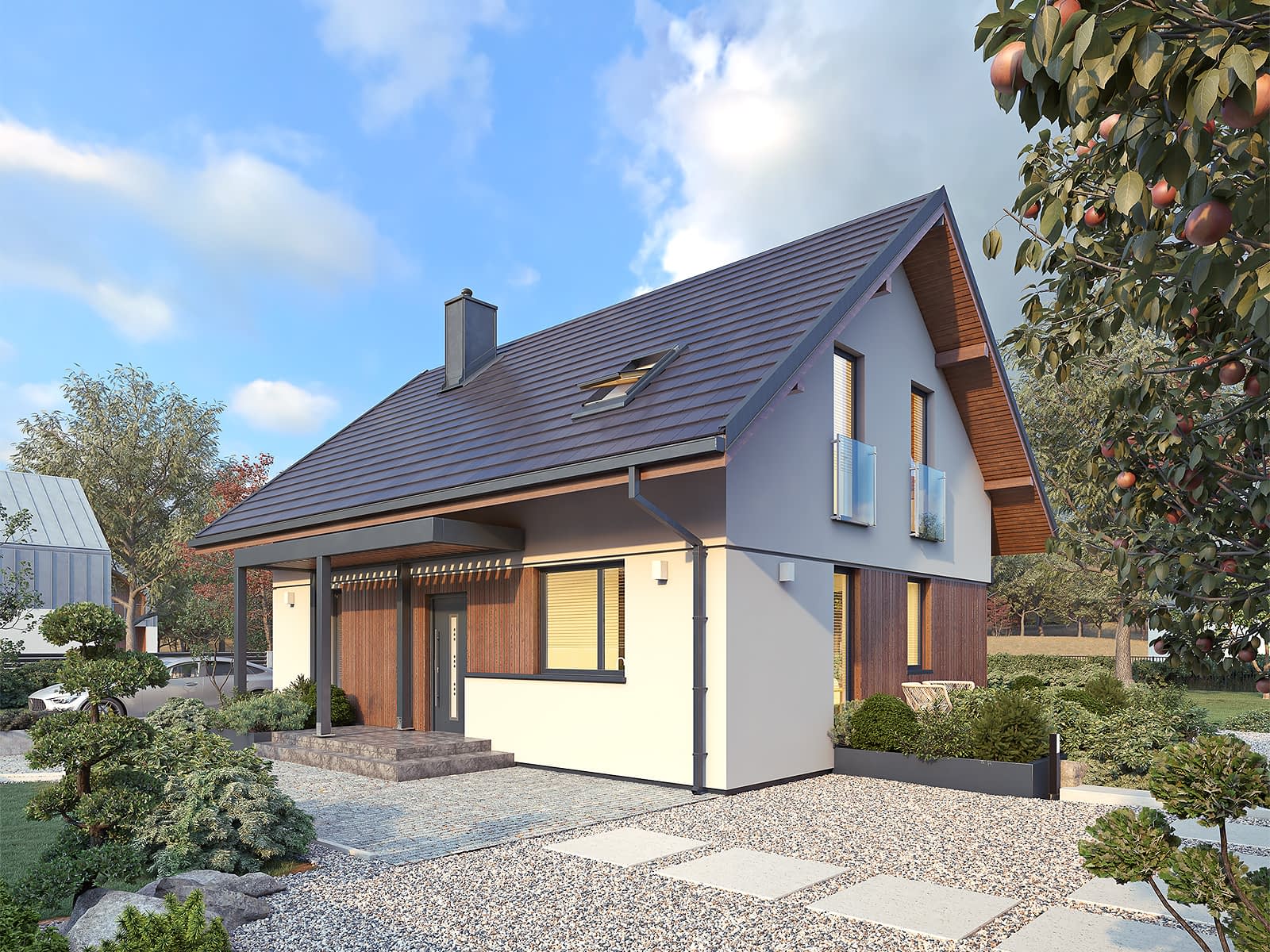Anka dr-ST to niewielki dom z użytkowym poddaszem o optymalnej powierzchni 115 m2. Projekt stworzony został w technologii szkieletu drewnianego. Klasyczna bryła przykryta została dwuspadowym dachem w grafitowym kolorze. Na elewacji pojawił się biały tynk oraz drewniana szalówka w kolorze naturalnego drewna. Strefa dzienna to przestronny salon z kominkiem, jadalnia oraz otwarta kuchnia. Strefa nocna to trzy wygodne sypialnie oraz rodzinna łazienka.Konstrukcja