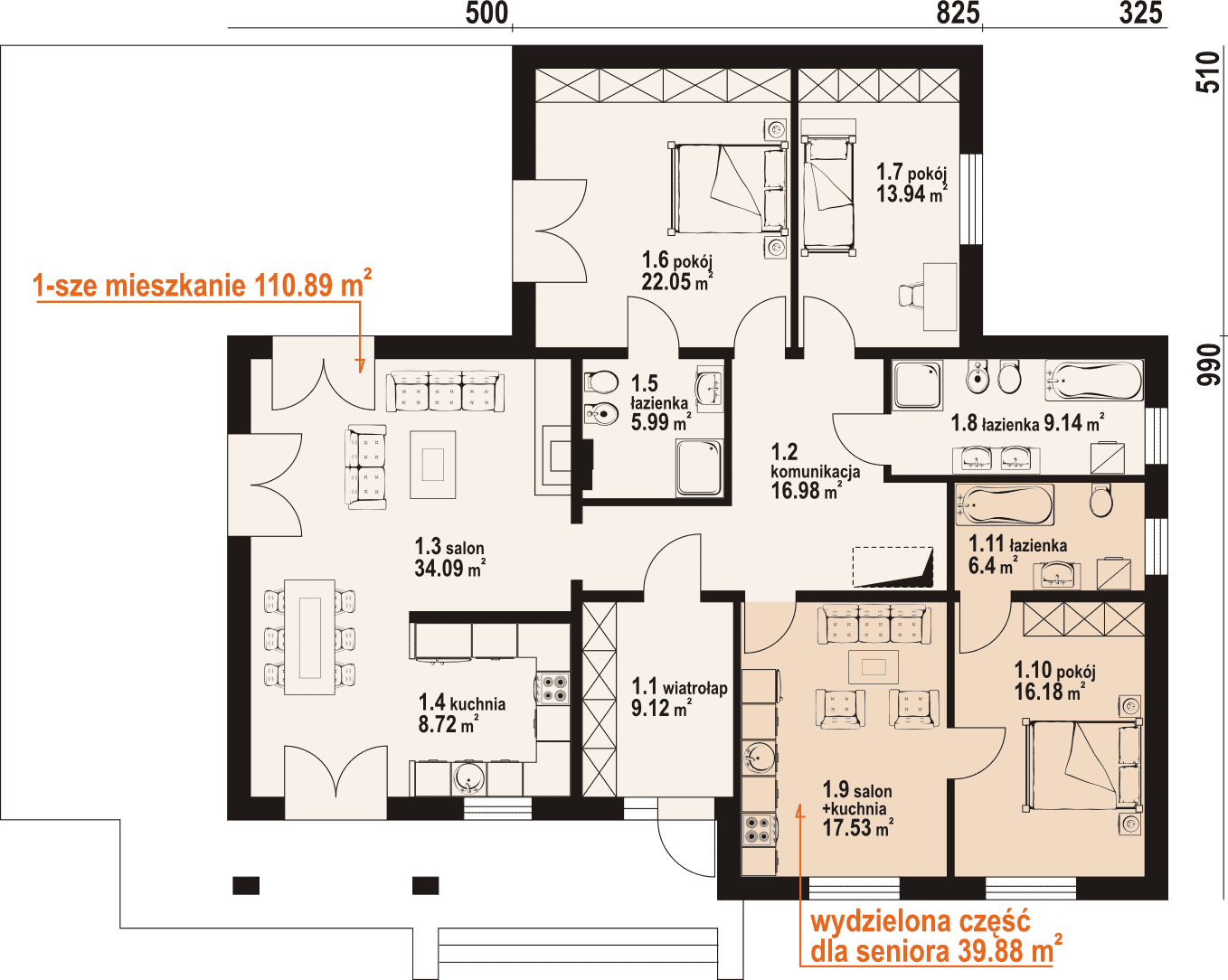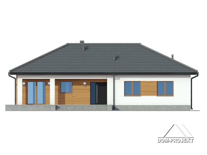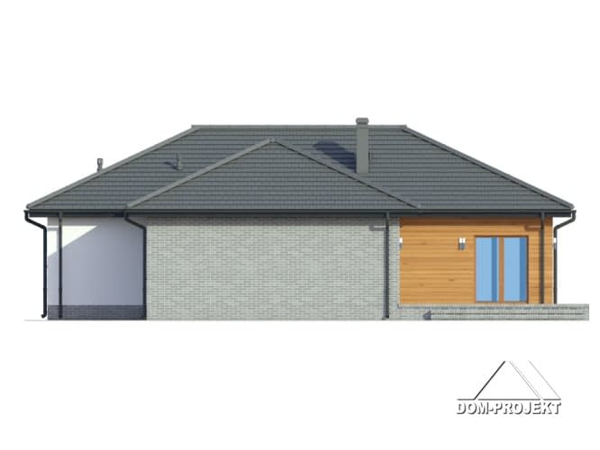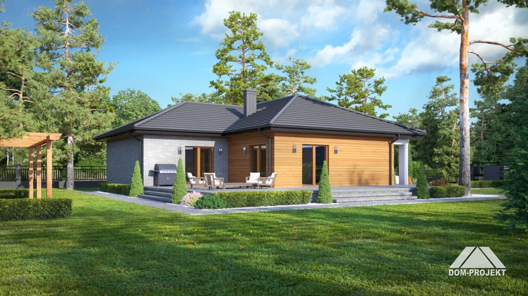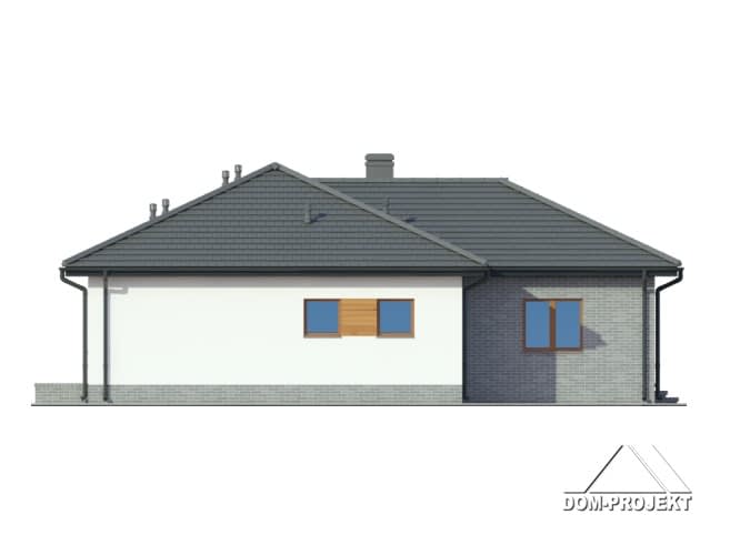 Dom parterowy z odrębną częścią dla seniora. Duży salon z aneksem kuchenny, kominkiem i wyjściami na taras. Dwa pokoje, dwie łazienki, wiatrołap i komunikacja. W części dla seniora salon z aneksem kuchennym, pokój i łazienka. Wyjście na poddasze schodami strychowymi rozkładanymi.Rzuty