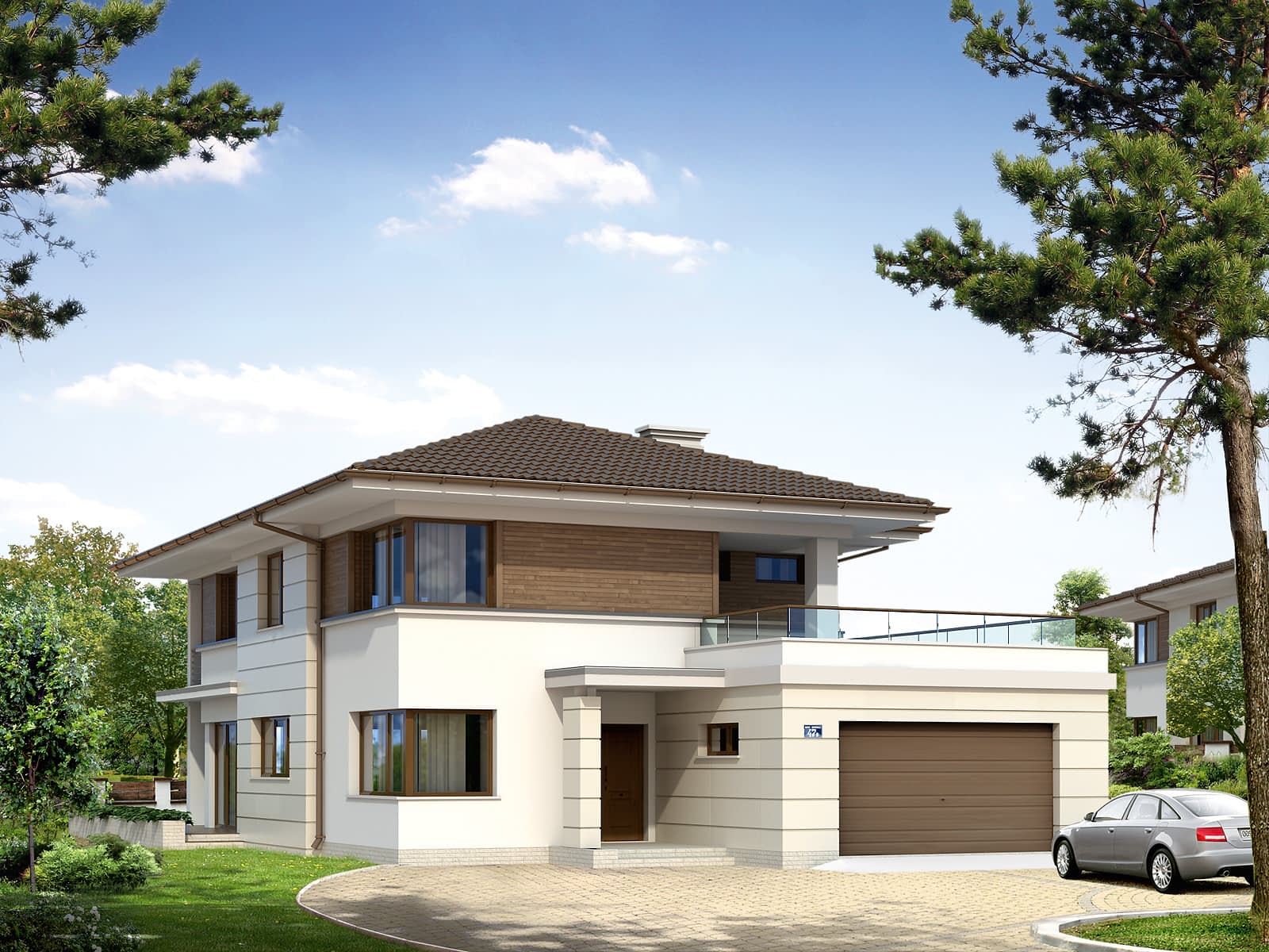 Dom jednorodzinny, piętrowy, niepodpiwniczony, z garażem dwustanowiskowym. Przeznaczony dla 5-osobowej rodziny. Posiada zadaszony taras w parterze oraz drugi, dostępny z sypialni na piętrze. Na parterze, oprócz pokoju dziennego, kuchni i jadalni, zaprojektowano dodatkowy pokój.Konstrukcja