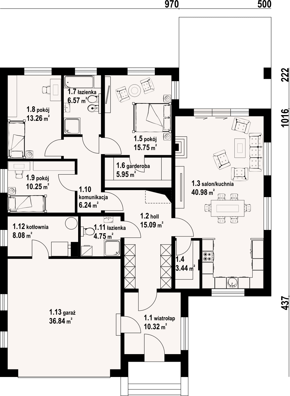 Dom parterowy. Duży salon z aneksem kuchennym i wyjściem na taras. Trzy pokoje, dwie łazienki, garderoba, spiżarka, holl, wiatrołap, garaż na dwa samochody i kotłownia. Poddasze nieużytkowe. Wyjście na poddasze schodami rozkładanymi z holu.Rzuty