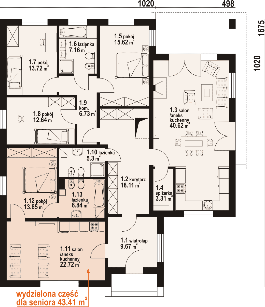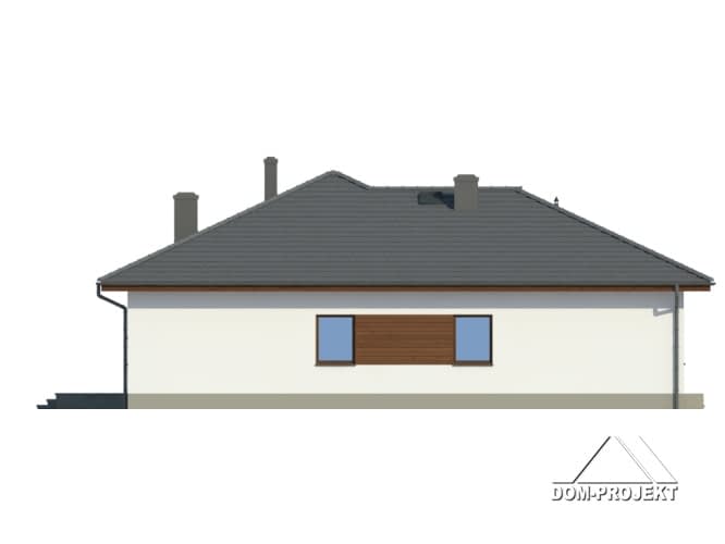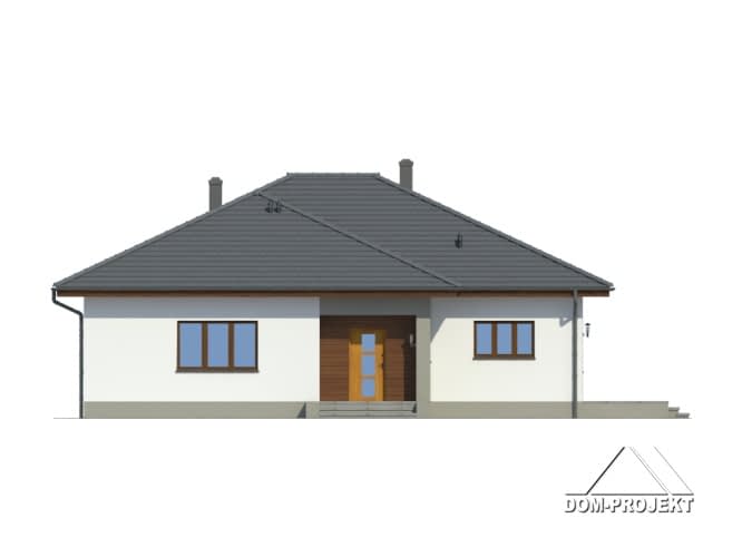 Dom parterowy z wydzieloną dodatkową częścią mieszkalną dla seniora . Duży salon z aneksem kuchennym, kominkiem i wyjściami na taras. Trzy pokoje, dwie łazienki, korytarz i wiatrołap oraz pomieszczenia dla seniora (salon z aneksem kuchennym, pokój, łazienka). Poddasze nieużytkowe z możliwością wykorzystania na strych lub cele gospodarcze.Rzuty