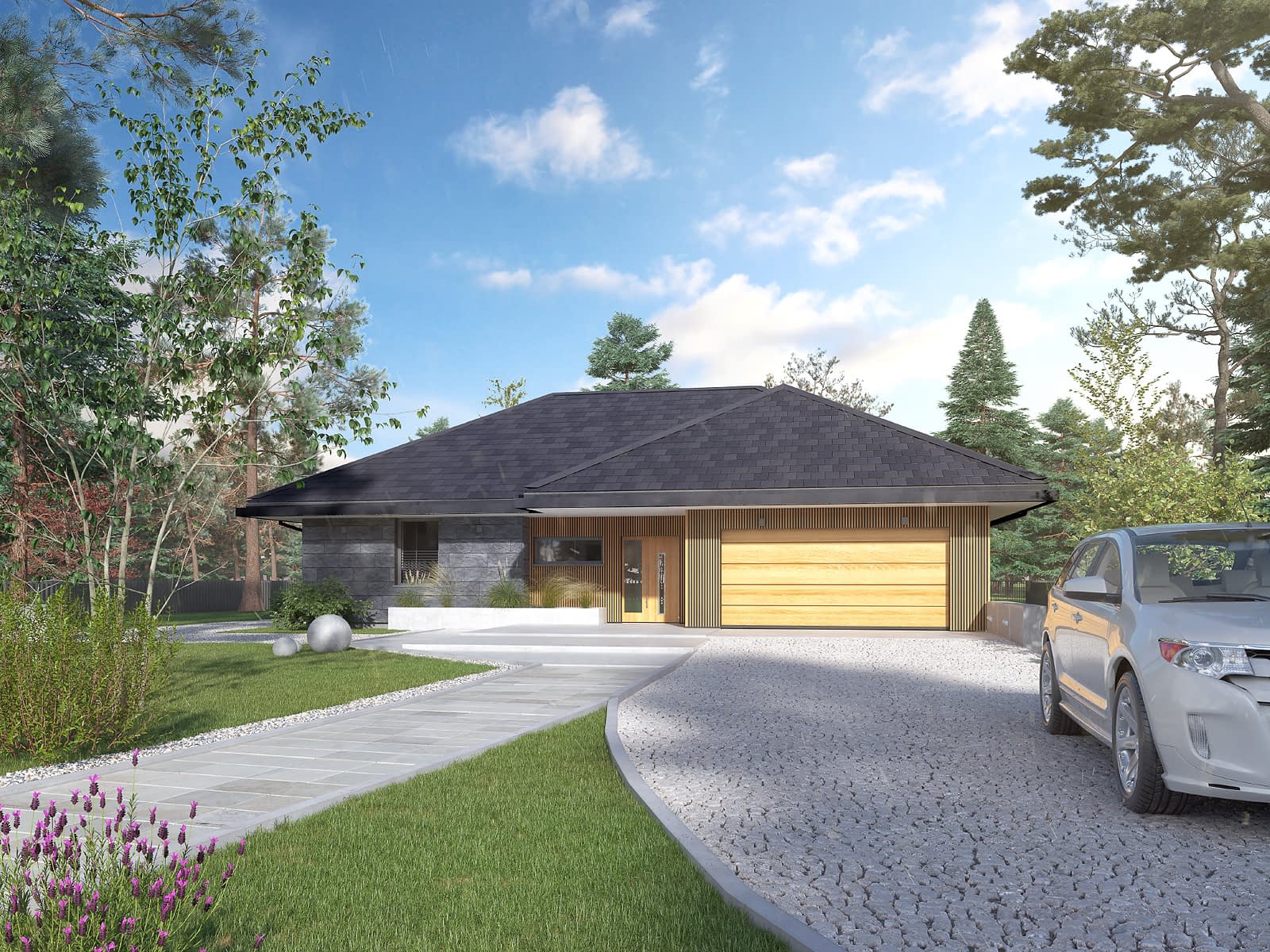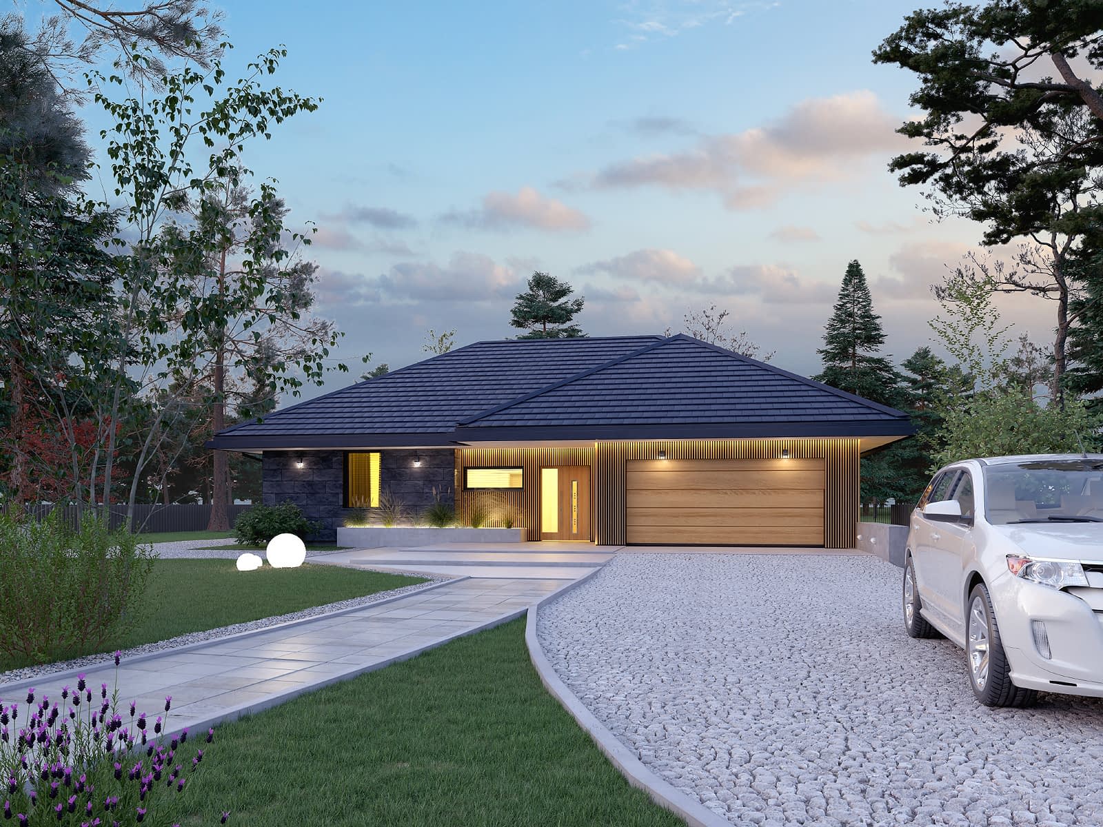 Projekt domu Ares to nowoczesny projekt domu parterowego, który wyróżnia się oryginalnym wykończeniem elewacji oraz funkcjonalnie zaplanowanym układem wnętrz. Zwarta bryła budynku została przykryta wielospadowym dachem pokrytym płaską dachówką ceramiczną. Na elewacji znajduje się kamień elewacyjny, który kolorystyką nawiązuje do grafitowego dachu oraz kontrastuje z pionowymi lamelami, którymi wykończono strefę wejściową oraz tarasową. Wnętrze zostało podzielone na strefę dzienną oraz nocną. Część dzienną tworzy otwarta przestrzeń składająca się z salonu, kuchni z wyspą oraz jadalni. Cechą charakterystyczną tej przestrzeni są panoramiczne przeszklenia otwierając wnętrze na otoczenie. Przy kuchni znajduje się pomieszczenie gospodarcze z funkcją spiżarni oraz pralni, które stanowi jednocześnie praktyczne przejście do garażu. W części nocnej wyróżniamy trzy sypialnie oraz ogólnodostępną łazienkę. Główna sypialnia tworzy prywatny apartament gospodarzy z garderobą, łazienką oraz bezpośrednim wyjściem na taras. Układ funkcjonalny domu uzupełnia dwustanowiskowy garaż z kotłownią.Konstrukcja