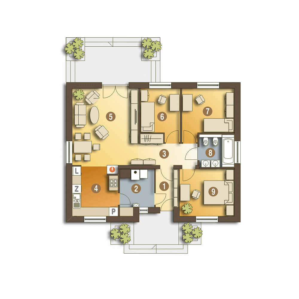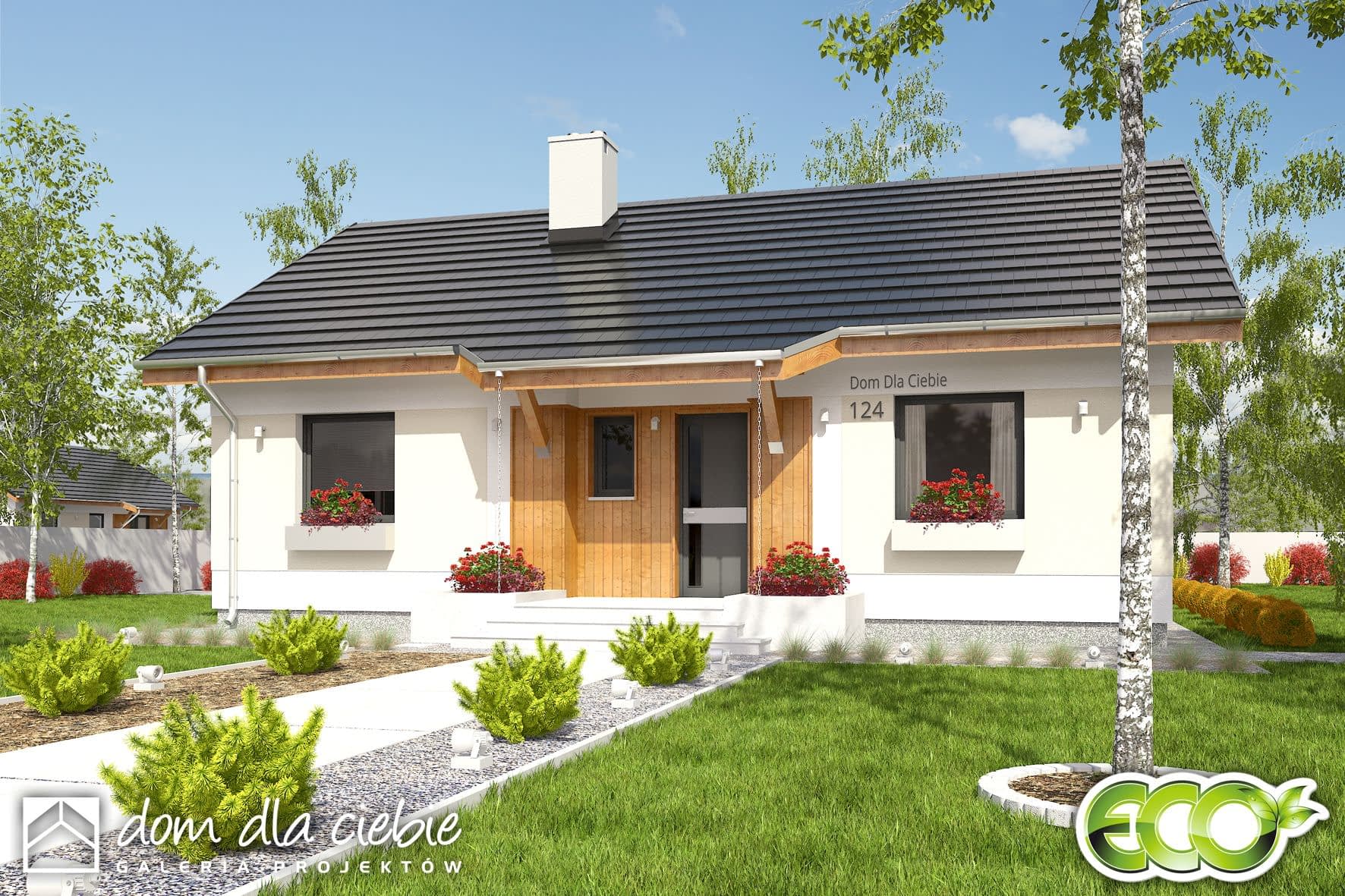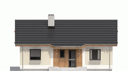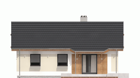 Nowoczesny projekt niedużego domu dla 4-ro osobowej rodziny. Funkcjonalnie rozdzielone strefy ogólnodostępna i prywatna - to podstawowa zaleta projektu. W części ogólnej mamy zaprojektowane wejście, z wygodnym holem z wnękową szafą, otwartą kuchnią oraz ustawnym salonem - tutaj będziemy zawsze czuć się swobodnie. Zwarte rozplanowanie sypialni z blisko położoną łazienką w strefie prywatnej, zapewni nam komfort i wygodę. Projekt przewiduje kotłownię z piecem na paliwo stałe, przez którą możemy dostać się np z wiatrołapu do kuchni.