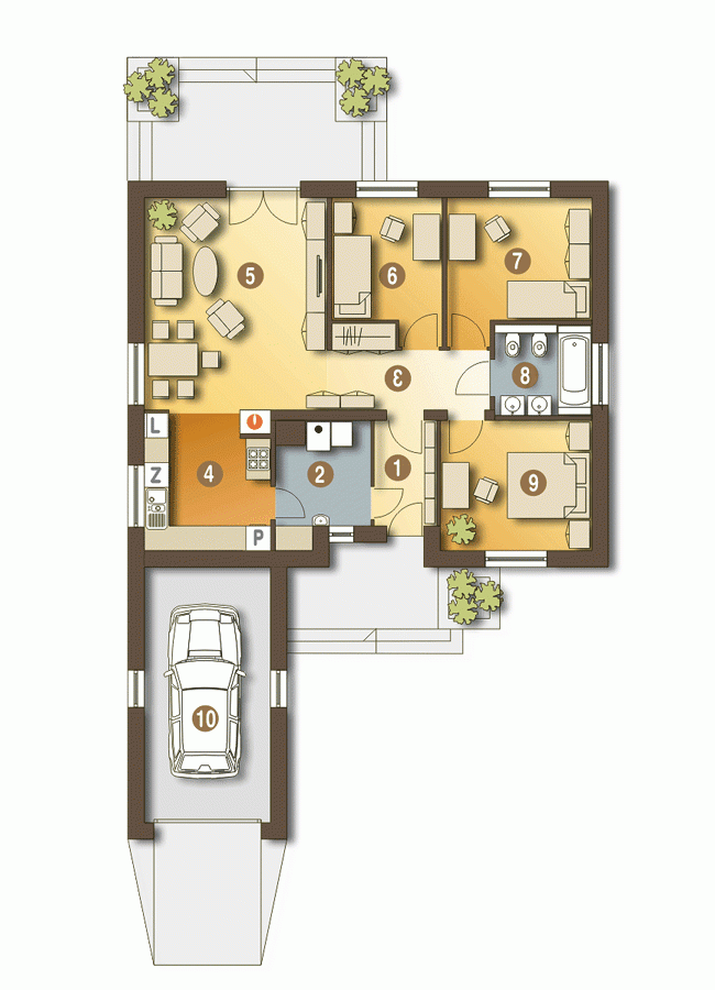 Nowoczesny projekt niedużego dom z garażem jednostanowiskowym, dla 4-ro osobowej rodziny. Funkcjonalny z wyraźne rozdzielonymi strefami ogólnodostępną i prywatną - to podstawowa zaleta projektu domu Ares trend. W części ogólnodostępnej, w której mamy zaprojektowane wejście, z wygodnym holem z wnękową szafą, otwartą kuchnią oraz ustawnym salonem będziemy zawsze czuć się swobodnie. Dzięki zaplanowaniu zwartego rozmieszczenia sypialni wokół łazienki w strefie prywatnej, będziemy mieć zapewnioną prywatność. W projekcie przewidziano wydzieloną kotłownię z piecem na paliwo stałe, przez którą możemy dostać się np z wiatrołapu do kuchni.