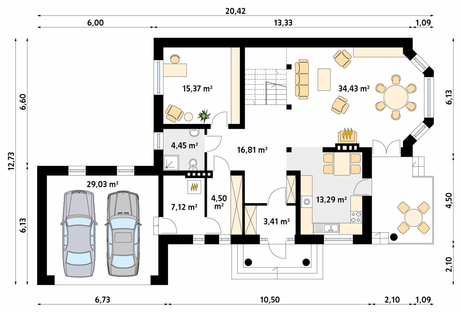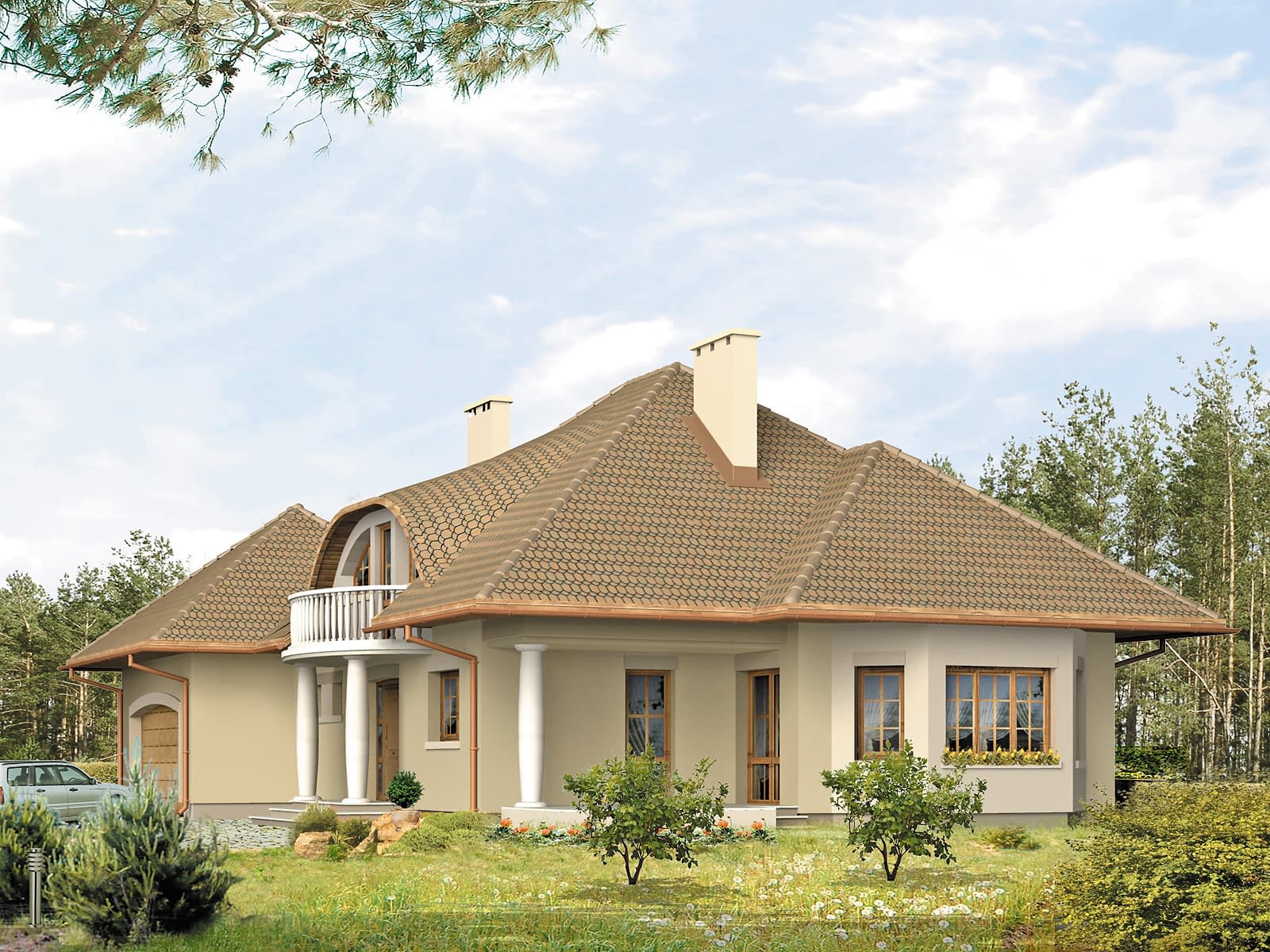 Dom jednorodzinny, parterowy z użytkowym poddaszem, wymagający dość szerokiej, ale płytkiej działki. Dom średniej wielkości z dodatkowym pokojem – gabinetem do pracy na parterze. Na poddaszu trzy sypialnie z łazienką i strych.Konstrukcja