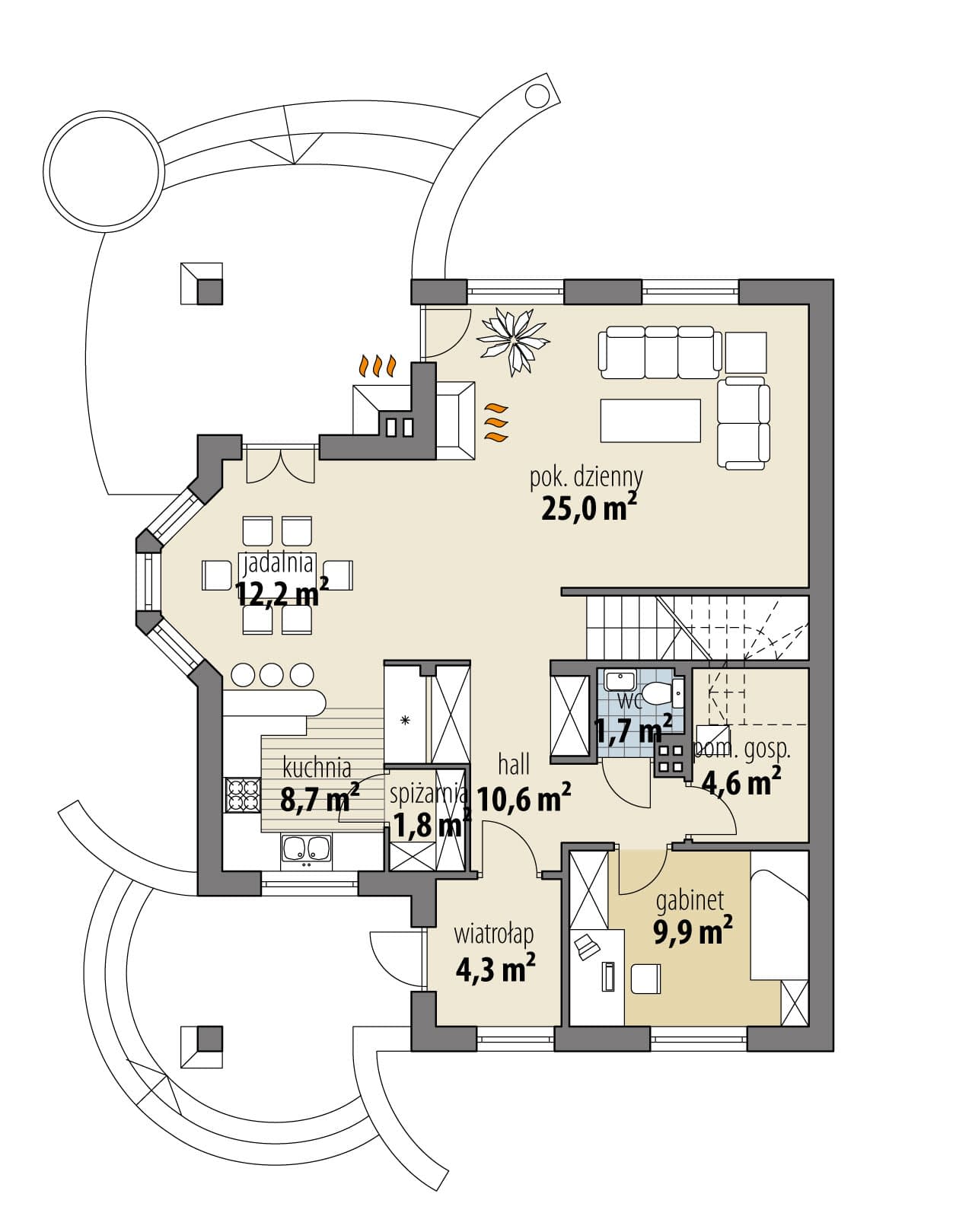 Dom z poddaszem użytkowym, niepodpiwniczony, przeznaczony dla 4-6 osobowej rodziny. Na parterze znajduje się część dzienna z obszernym salonem połączonym z jadalnią i kuchnią, gabinet oraz część gospodarcza. Na poddaszu zlokalizowano część nocną z trzema sypialniami(w tym jedna z własną garderobą) oraz ogólnodostępną łazienką. Projekt dostępny w wersji z garażem jednostanowiskowym - Aridela I oraz z garażem dwustanowiskowym - Aridela II.