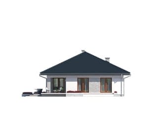 Jednorodzinny budynek mieszkalny, parterowy, przeznaczony dla 3 - 4-osobowej rodziny. W części dziennej przewidziano salon połączony z jadalnią, z którego prowadzi wyjście na zadaszony taras, oraz kuchnię ze spiżarnią. W części nocnej zaprojektowano dwie sypialnie i łazienkę. Część gospodarczą stanowi kotłownia na każdy rodzaj paliwa oraz jednostanowiskowy garaż.Konstrukcja