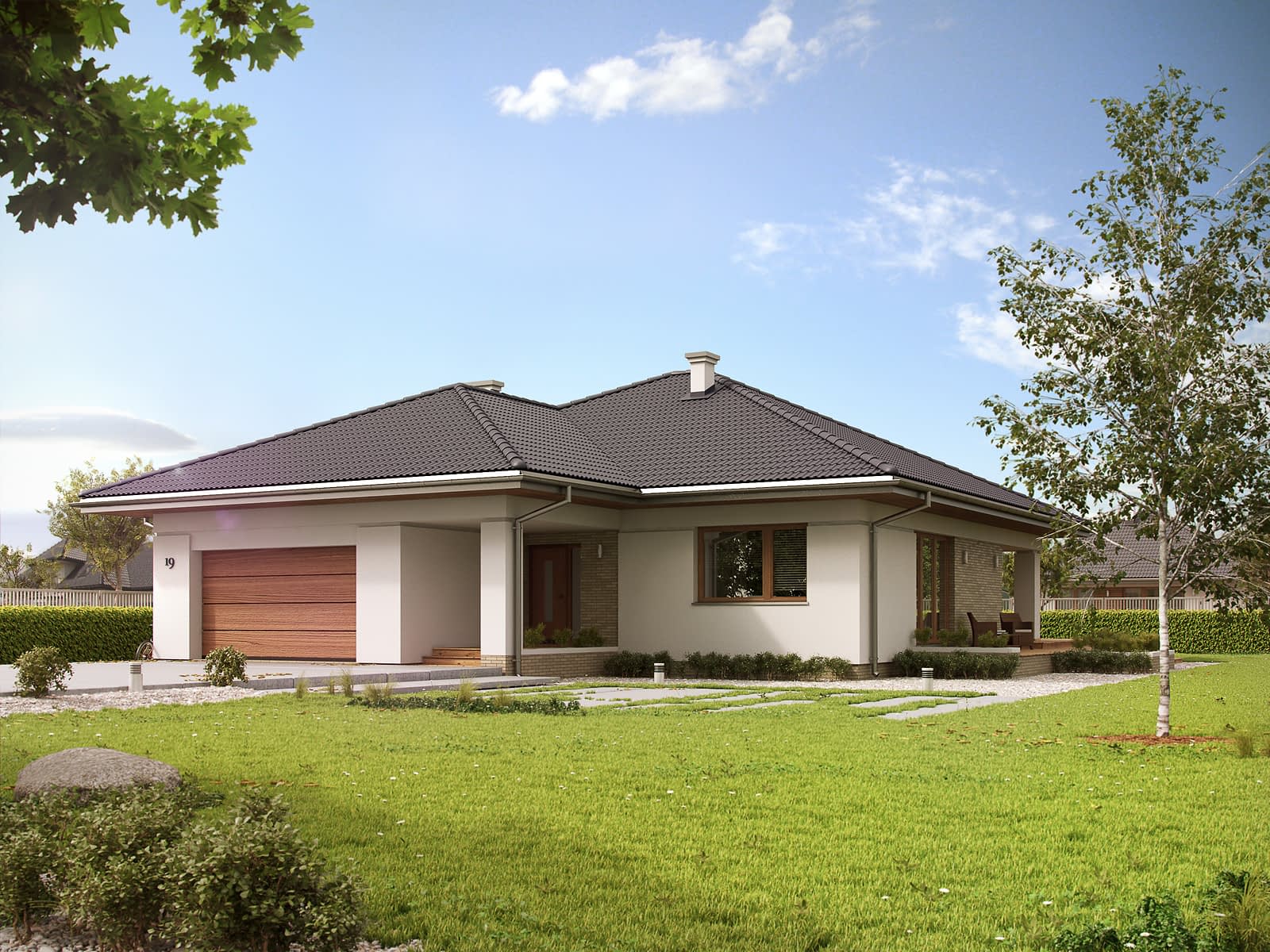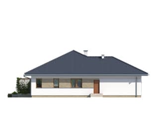 Kolejna wersja projektu Ariel, tym razem wzbogacona o piwnicę. Jednorodzinny budynek mieszkalny, parterowy, podpiwniczony, swoim pełnym programem funkcjonalnym zapewnia optymalny komfort 4-osobowej rodzinie. W części dziennej przewidziano salon z jadalnią, kuchnię ze spiżarnią oraz wc. W części nocnej zaprojektowano trzy sypialnie, z czego jedną z łazienką i garderobą, oraz łazienkę. Część gospodarcza została przeniesiona do piwnicy i składa się z kotłowni na każdy rodzaj paliwa oraz z pomieszczeń gospodarczych.Konstrukcja