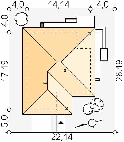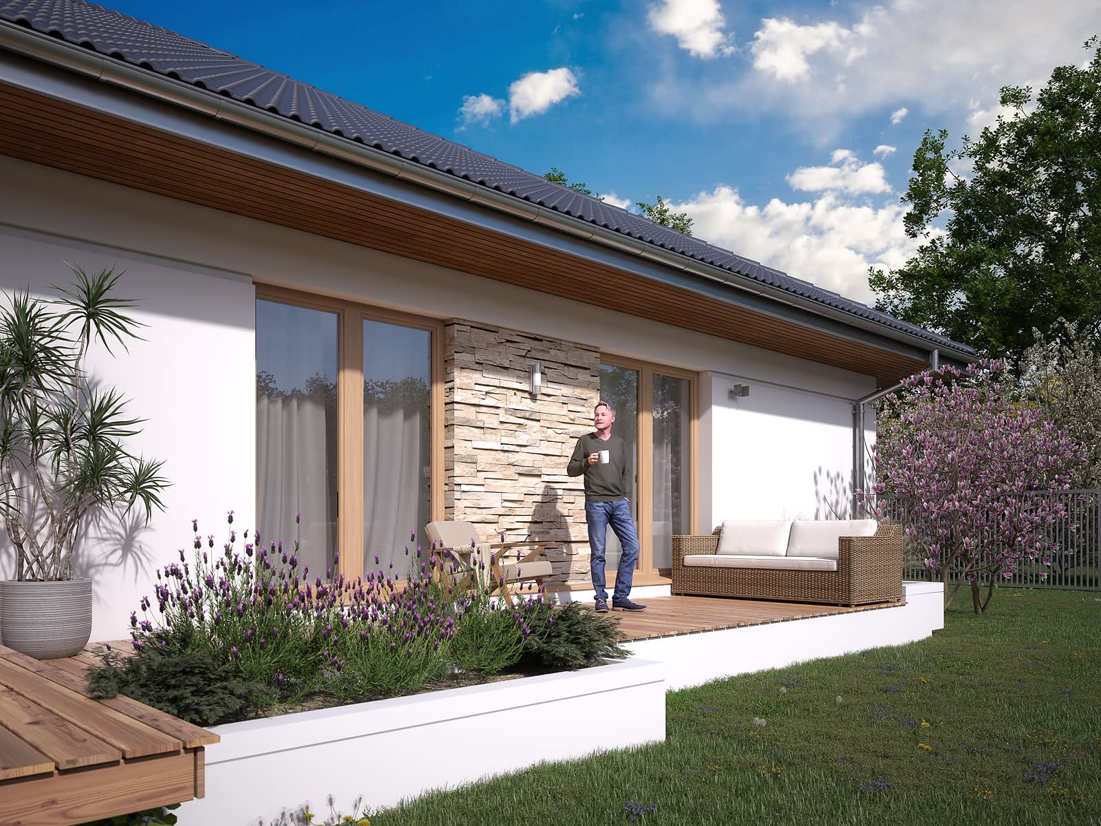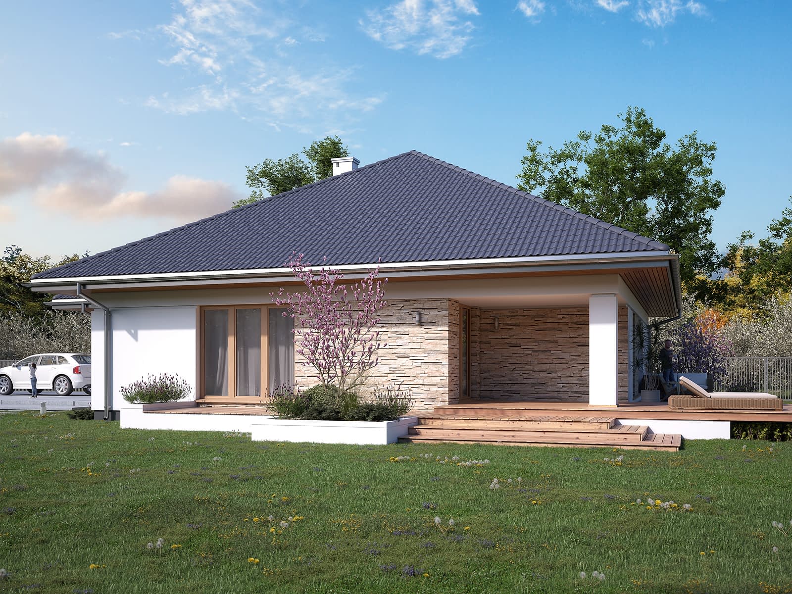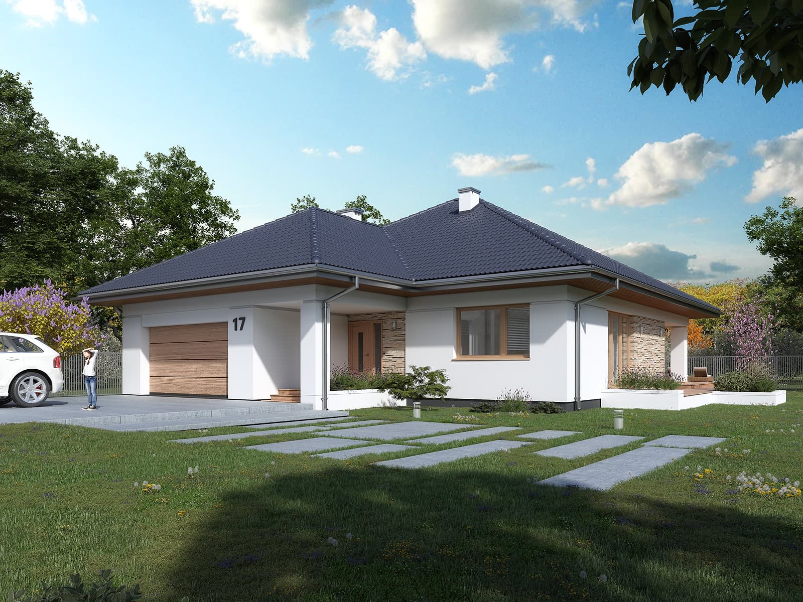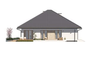Ariel 9 to projekt domu parterowego, charakteryzujący się nowoczesną bryłą przykrytą wielospadowym dachem. W projekcie zaprojektowano piwnicę, w której poza kotłownią znajdują się dwa pomieszczenia gospodarcze. Układ funkcjonalny na parterze został podzielony na część dzienną oraz nocną. W części dziennej znajduje się przestronny salon z kominkiem i wyjściem na zadaszony taras. Salon płynnie łączy się z jadalnia oraz otwartą kuchnią ze spiżarnią. W części nocnej zaprojektowano trzy sypialnie, rodzinną łazienkę oraz WC. Dwie sypialnie posiadają wyjście na taras, który biegnie wzdłuż dwóch ścian budynku. Główna sypialnia tworzy apartament gospodarzy z własną łazienką oraz garderobą.Konstrukcja