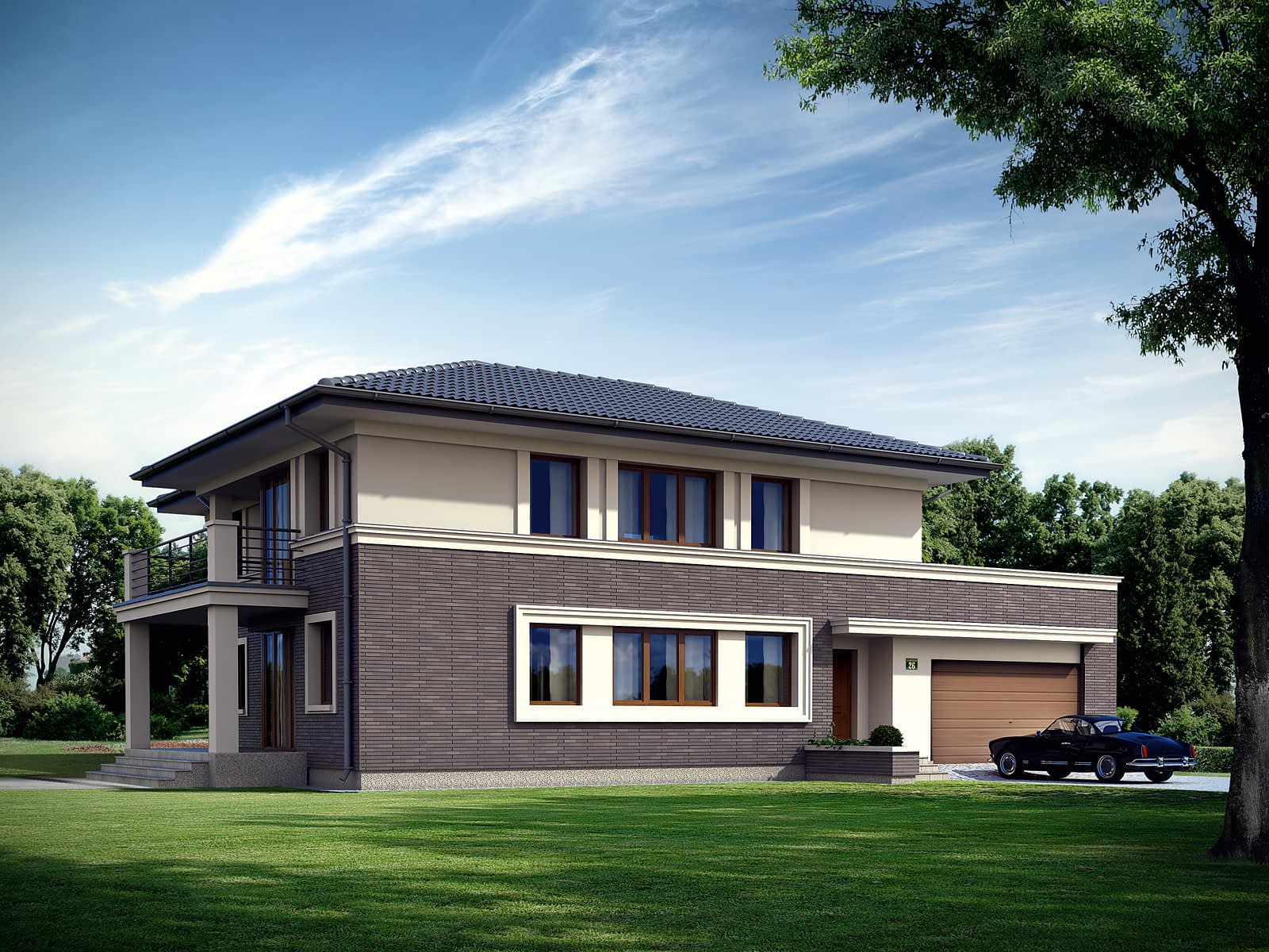 Dom dwurodzinny z niezależnymi mieszkaniami o jednakowym układzie, każde na innej kondygnacji. Mieszkanie na piętrze posiada duży taras nad garażem. Oba mieszkania mają wyjście z salonu na zadaszone tarasy.Konstrukcja