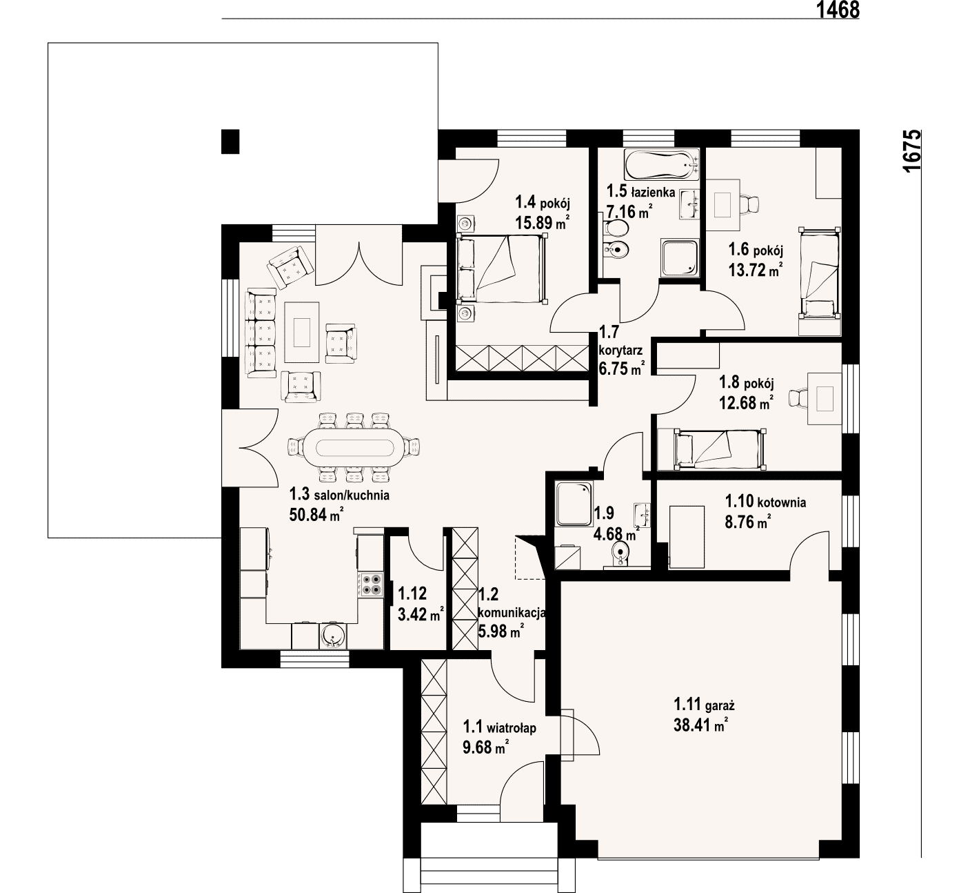 Dom parterowy z garażem na dwa samochody. Duży salon z aneksem kuchennym, kominkiem i wyjściem na taras. Spiżarka, komunikacja, wiatrołap, trzy pokoje, dwie łazienki, korytarz, garaż i kotłownia.Rzuty