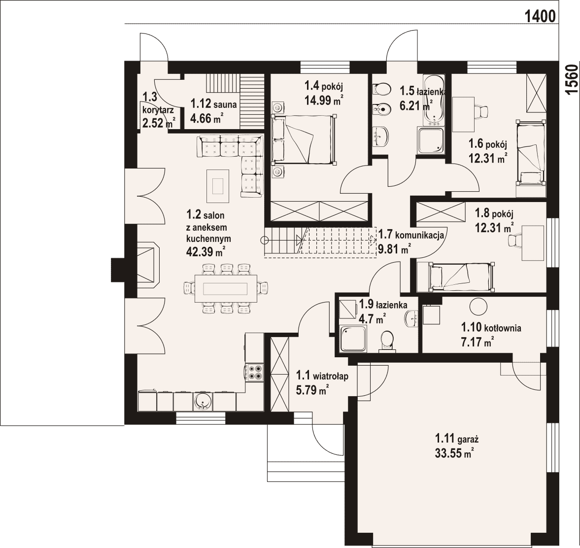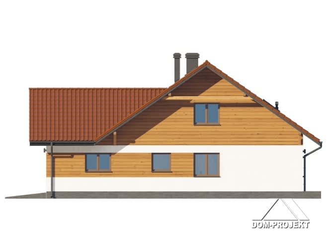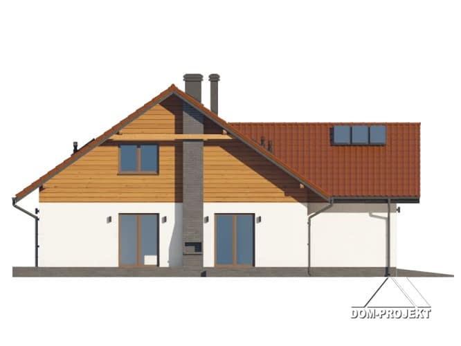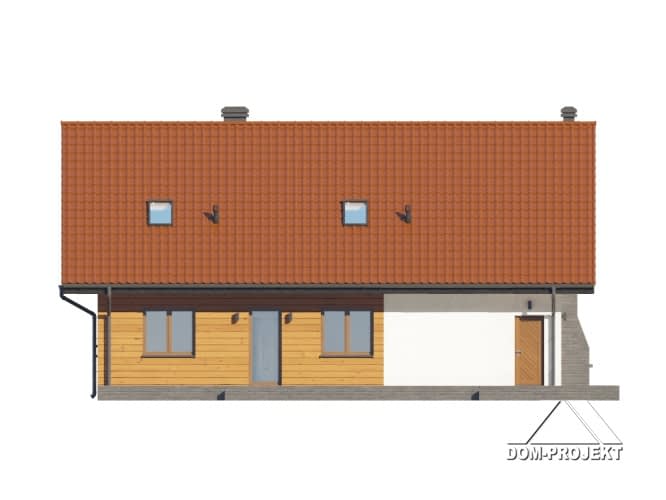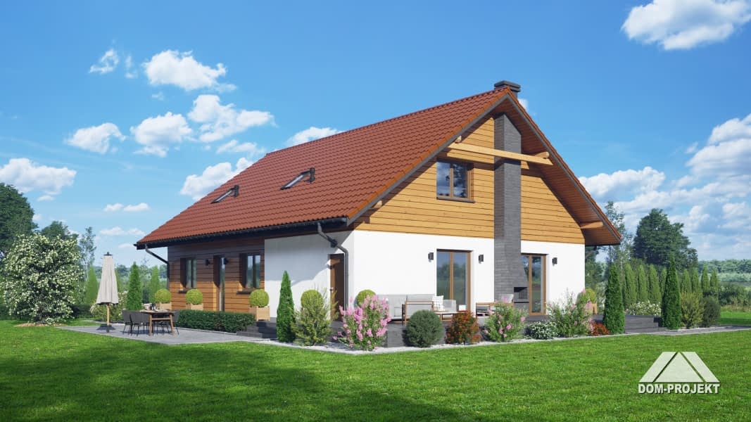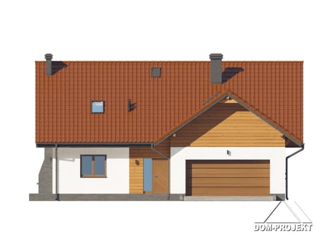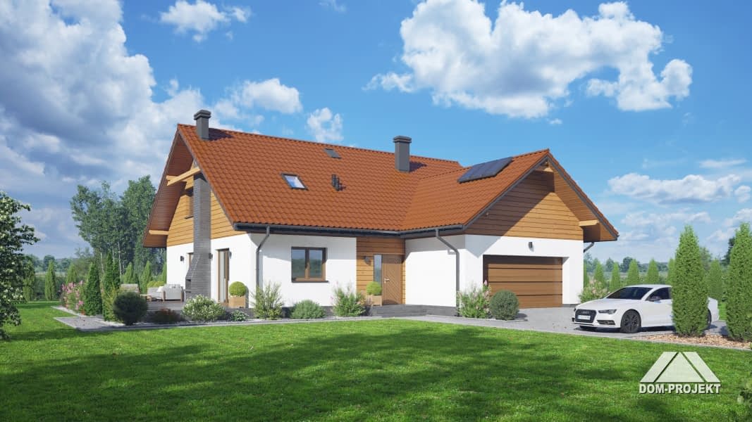 Dom parterowy z garażem na dwa samochody. Duży salon z aneksem kuchennym, kominkiem, wyjściem na taras i schodami na poddasze. Trzy pokoje, dwie łazienki, komunikacja, wiatrołap, kotłownia. Na poddaszu pomieszczenie rekreacyjne.Rzuty