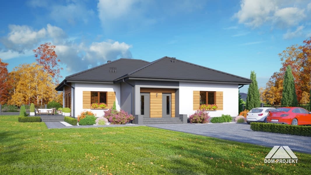 Wygodny dom jednorodzinny z odrębnym mieszkaniem na wynajem. Duży salon z aneksem kuchennym, kominkiem i wyjściem na taras. Trzy pokoje, dwie łazienki, korytarz, komunikacja i wiatrołap. W części do wynajmu salon z aneksem kuchennym, pokój, łazienka, wiatrołap.Rzuty