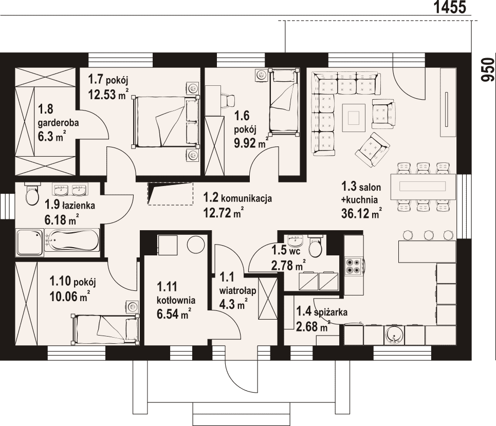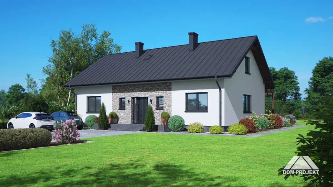 Wygodny dom parterowy, murowany. W części dziennej duży, dobrze doświetlony salon z kominkiem i wyjściem na taras, otwarta kuchnia ma dostęp do spiżarki. W części prywatnej trzy pokoje - główny z dostępem do własnej garderoby oraz wspólna łazienka z miejscem na wannę. Program użytkowy uzupełnia praktyczny wiatrołap, kotłownia oraz wc z miejscem na pralkę i suszarkę.Rzuty