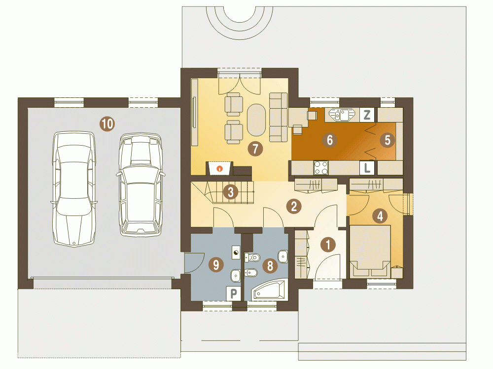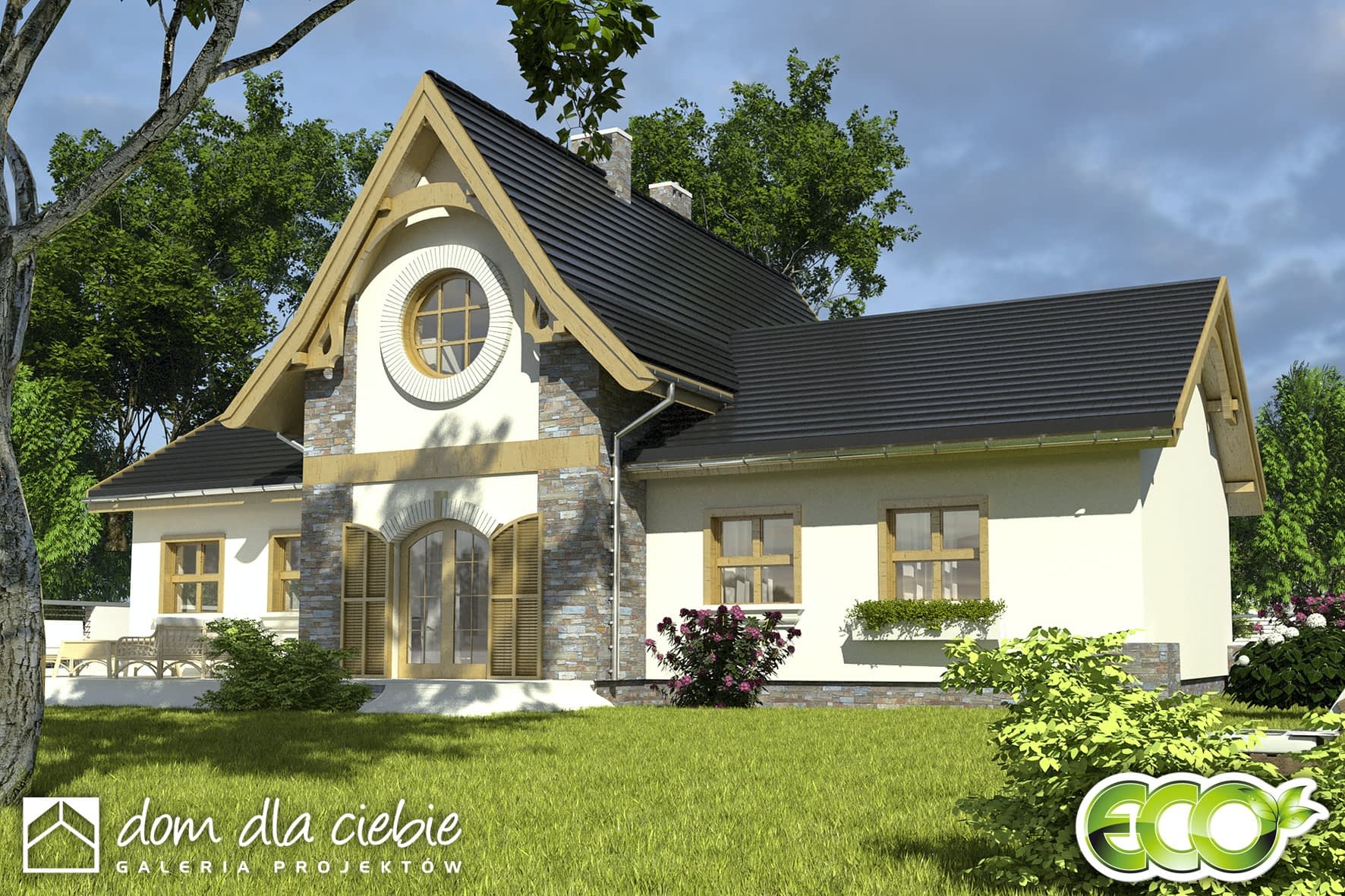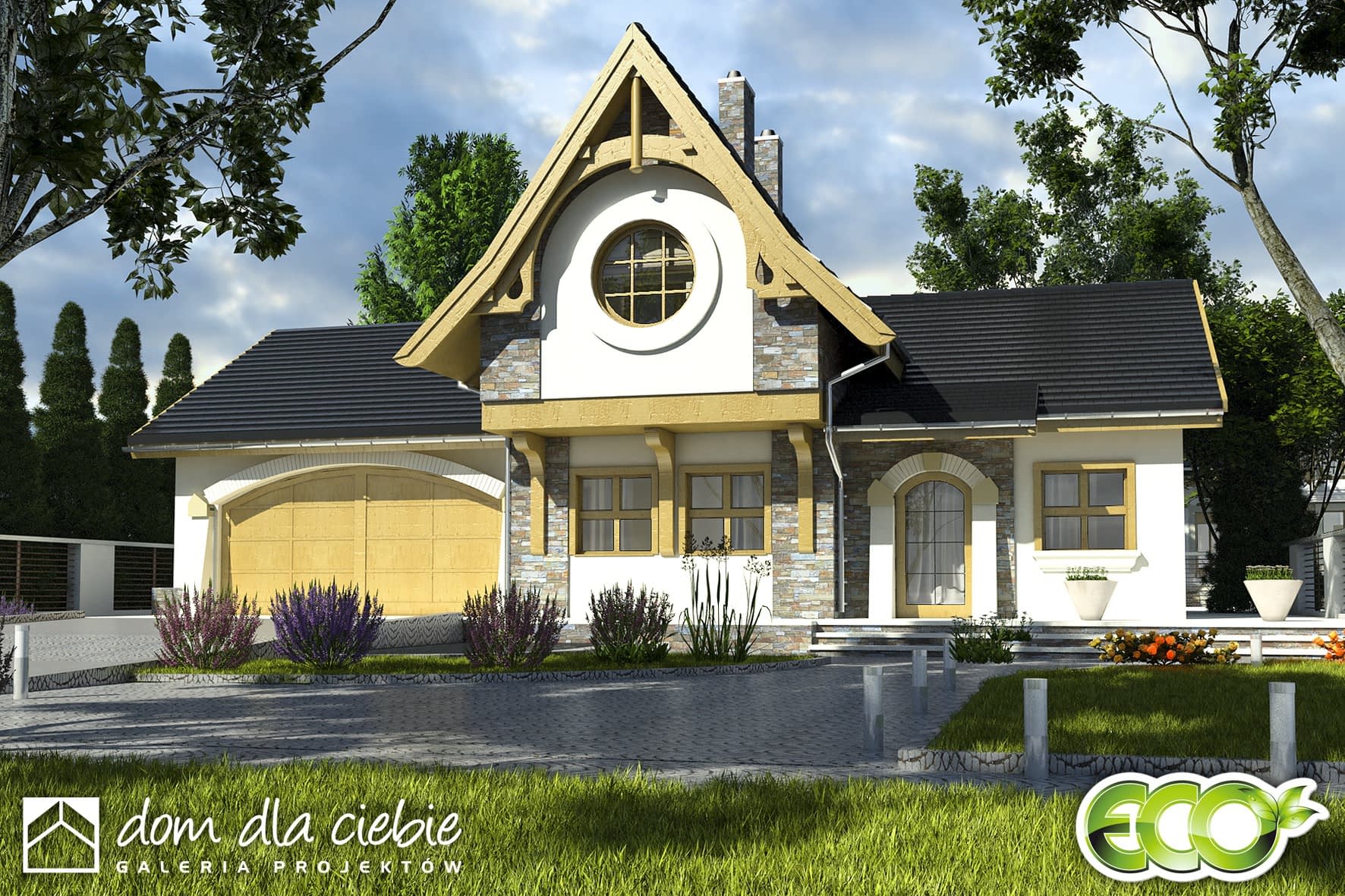 Tradycyjny, ciekawy dom rodzinny dla 3 do 4-ro osobowej rodziny. Parter jako część ogólna obejmuje: pokój, salon z kominkiem oraz miejscem do spożywania posiłków i otwartą wygodną kuchnią, przy której znajduje się spiżarnia; wygodny hol i schody na górę oraz łazienkę i pomieszczenie techniczne z piecem CO na paliwo stałe lub na gaz. Pomieszczenie CO spełnia równocześnie funkcję łącznika komunikacyjnego między garażem a częścią mieszkalną. Na piętrze znajdują się dwie sypialnie z łazienkami oraz hol. Budynek posiada atrakcyjny wygląd. ... Sprawdź inne projekty domów - Zapraszamy !