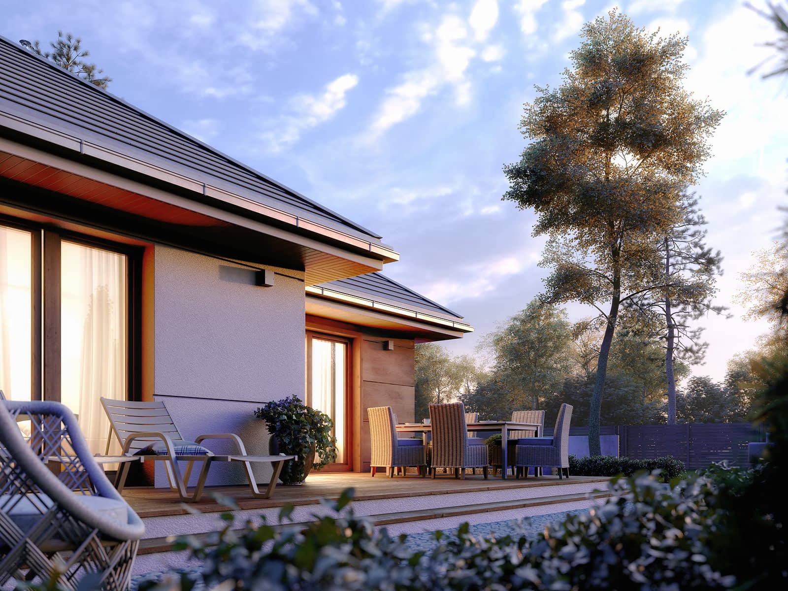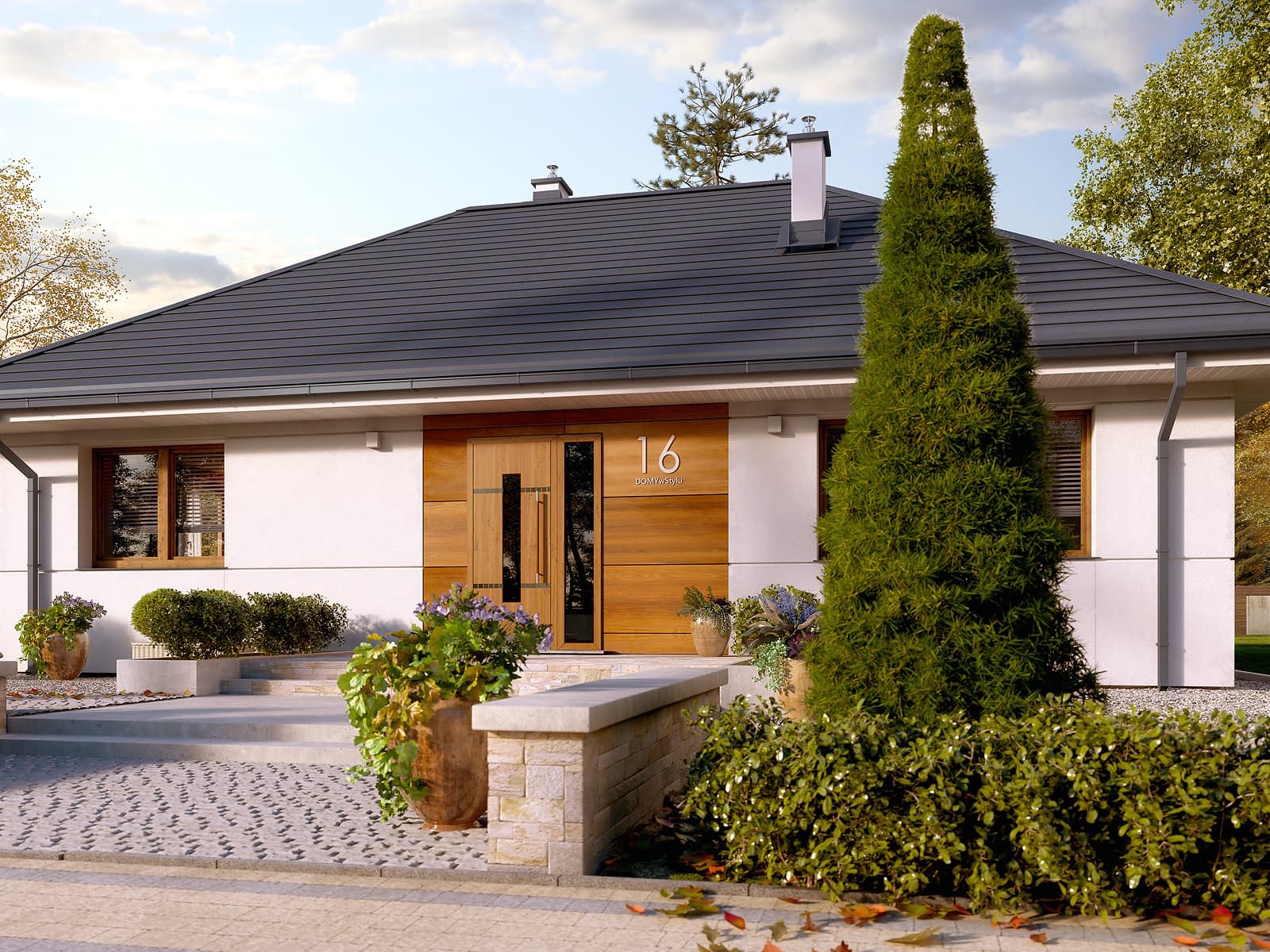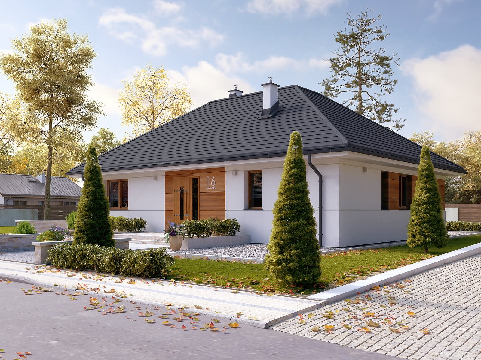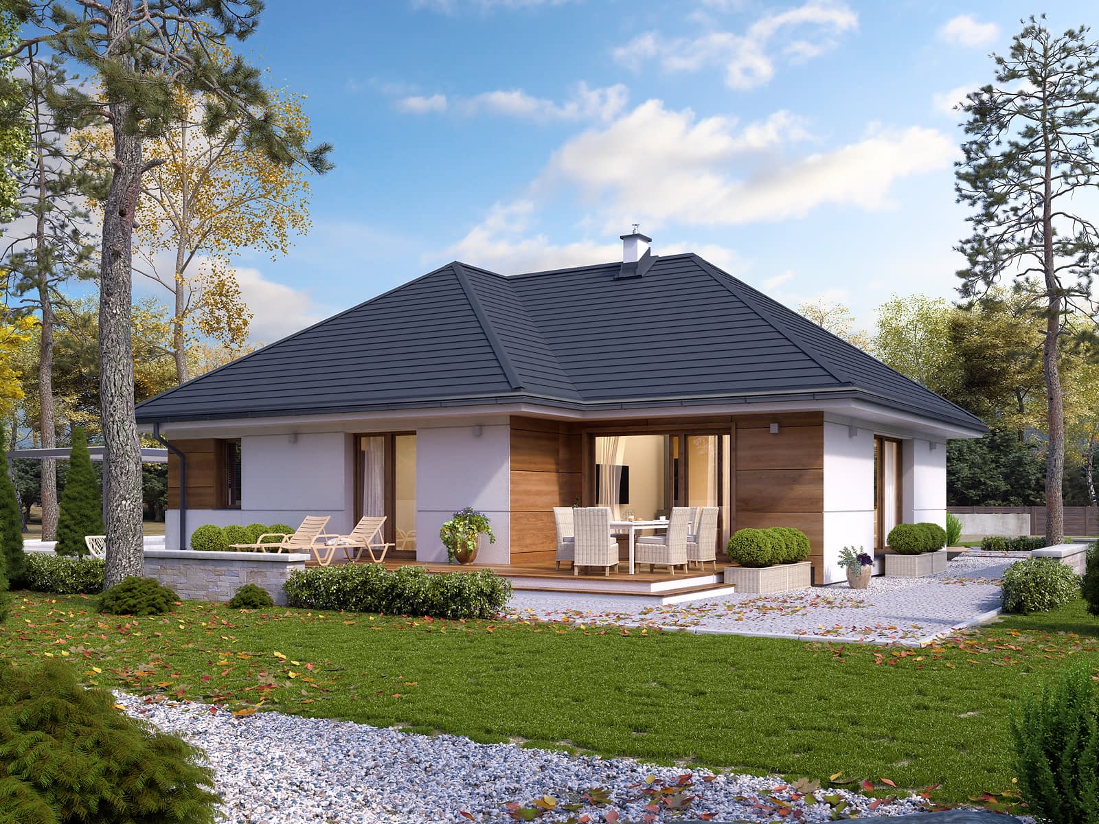 Parterowy projekt domu łączący nowoczesną estetykę z tradycyjną sprawdzoną funkcją. Biała bryła obiektu z drewnianymi akcentami na elewacji w połączeniu z grafitowym dachem i stolarką tworzy elegancką kolorystykę. Układ funkcjonalny to sprawdzony podział na strefę dzienną i nocną. Rozległy salon ze wspaniałym oknem może być miejscem wypoczynku całej rodziny. Kuchnia mimo iż połączona funkcjonalnie z salonem jest jednocześnie wizualnie wydzielona. W kuchni zaprojektowano spiżarnię. W części nocnej znajdziemy dwie sypialnie jedna z nich została zaprojektowana z oddzielną garderobą i łazienką. Na uwagę zasługuje wydzielona funkcjonalnie pralnia oraz duża kotłownia.Konstrukcja
