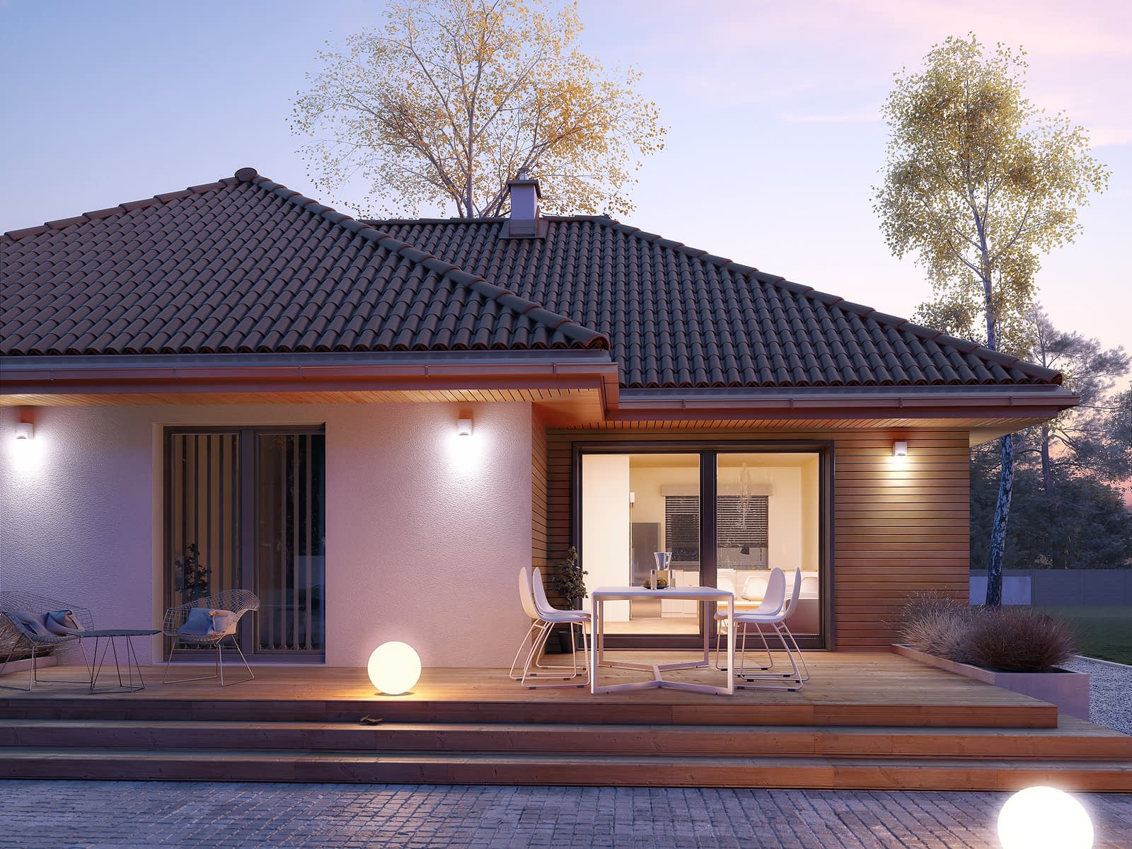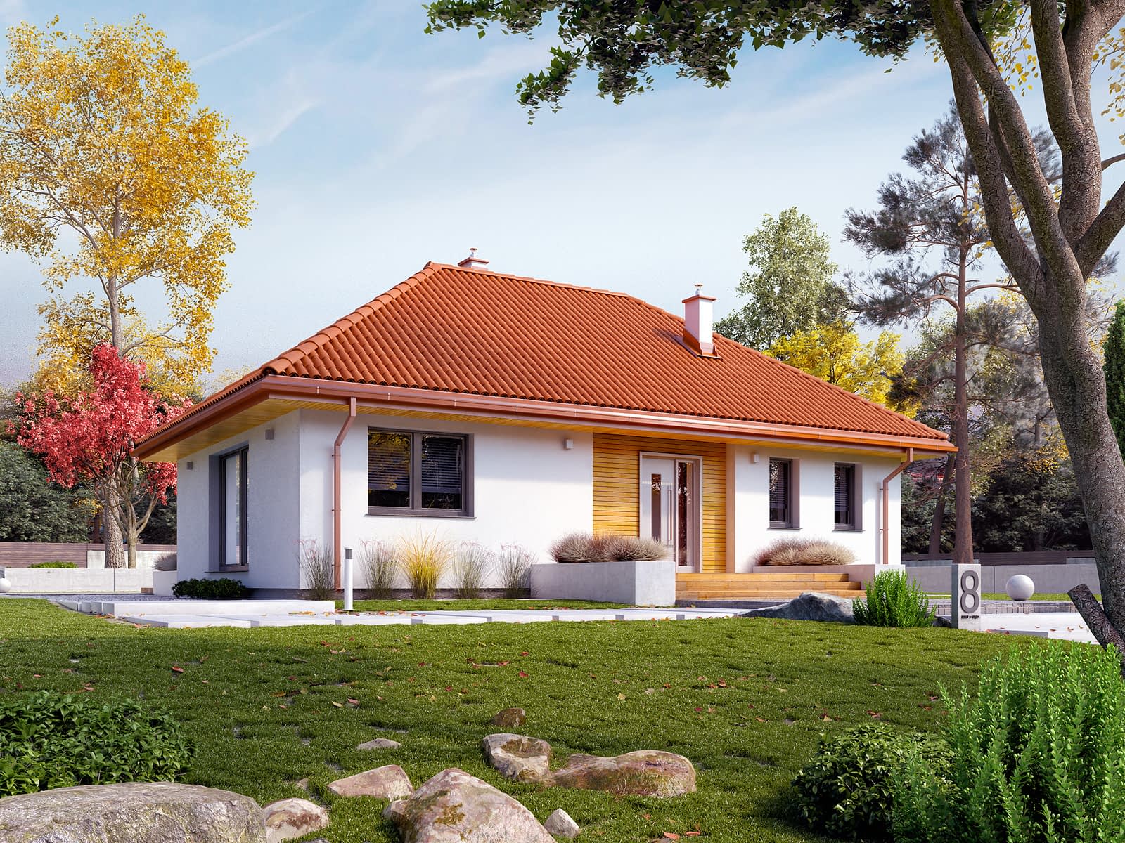 Parterowy projekt niewielkiego domu łączący tradycyjną sprawdzoną estetykę z nowoczesną funkcją. Biała bryła obiektu z drewnianymi akcentami na elewacji w połączeniu z ceglastym tradycyjnym dachem i stolarką tworzy elegancką kolorystykę. Układ funkcjonalny to sprawdzony podział na strefę dzienną i nocną. Rozległy salon ze wspaniałym oknem może być miejscem wypoczynku całej rodziny. Kuchnia mimo iż połączona funkcjonalnie z salonem jest jednocześnie wizualnie wydzielona. W kuchni zaprojektowano spiżarnię. W części nocnej znajdziemy trzy sypialnie jedna z nich została zaprojektowana z oddzielną garderobą i łazienką. W tym niewielkim domu nie zabrakło pomieszczenia kotłowni z pralnią.Konstrukcja