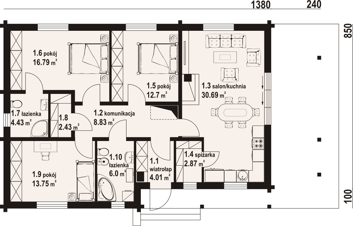 - 1.3 - kuchnia, salon30.69 m²