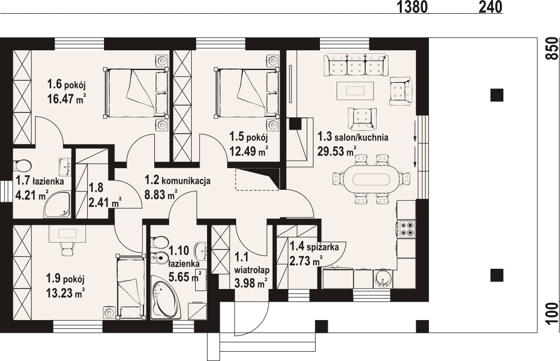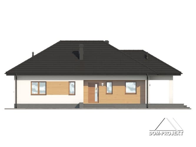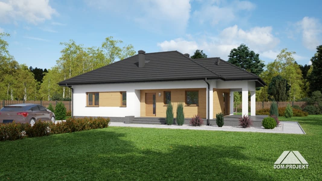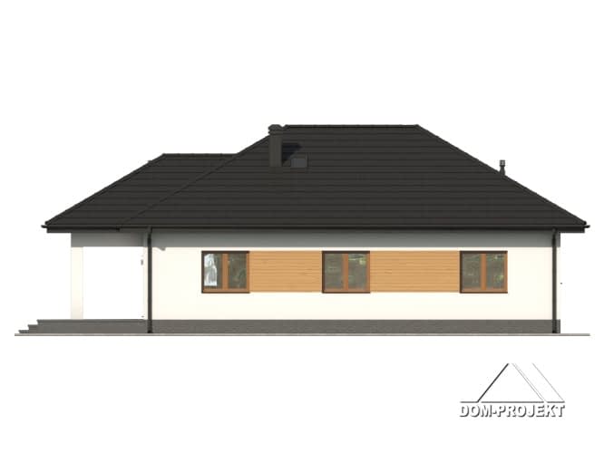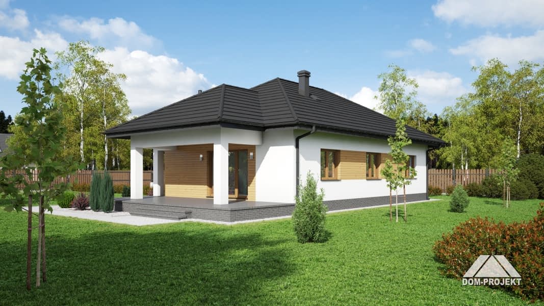 Dom parterowy. Duży salon z aneksem kuchennym, kominkiem i wyjściem na zadaszony taras. Trzy pokoje, łazienka, wc, komunikacja, garderoba i wiatrołap. Wyjście na poddasze schodami strychowymi rozkładanymi.Rzuty