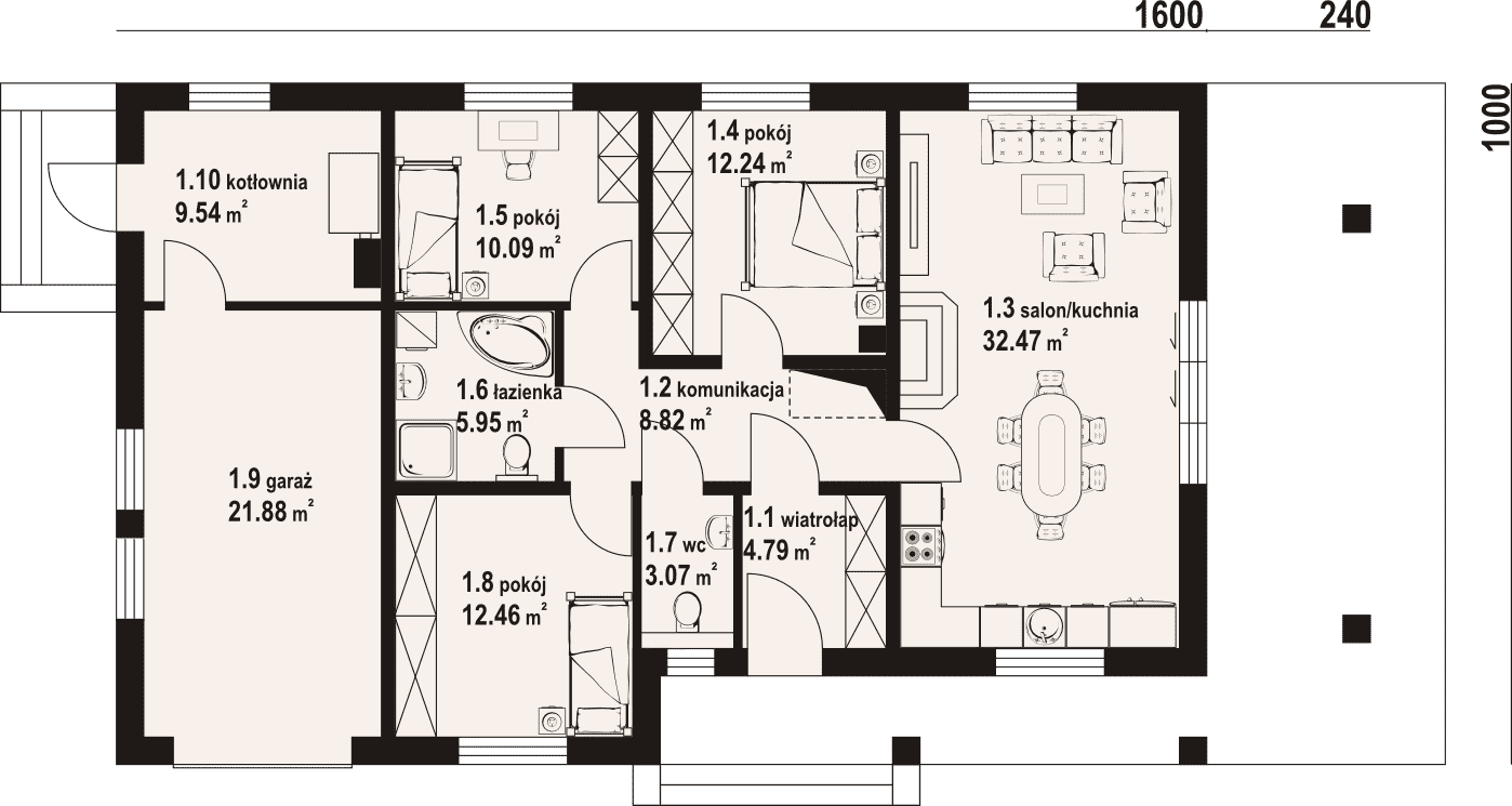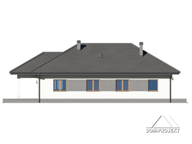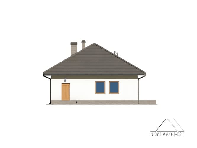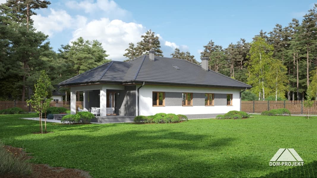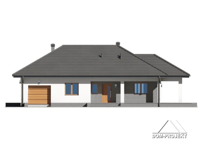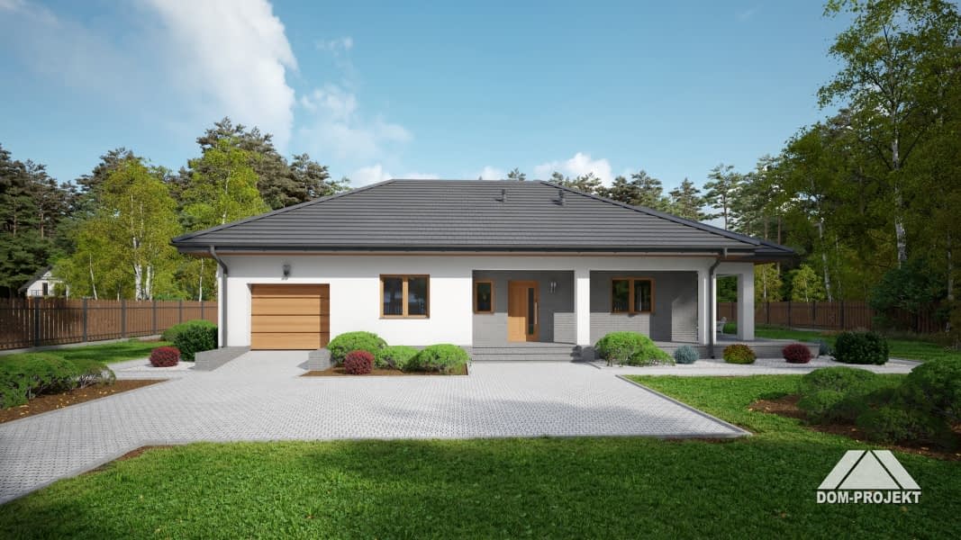 Dom parterowy z garażem. Duży salon z aneksem kuchennym, kominkiem i wyjściem na zadaszony taras. Trzy pokoje, łazienka, wc,wiatrołap, garaż i kotłownia. Wyjście na poddasze schodami strychowymi rozkładanymi.Rzuty