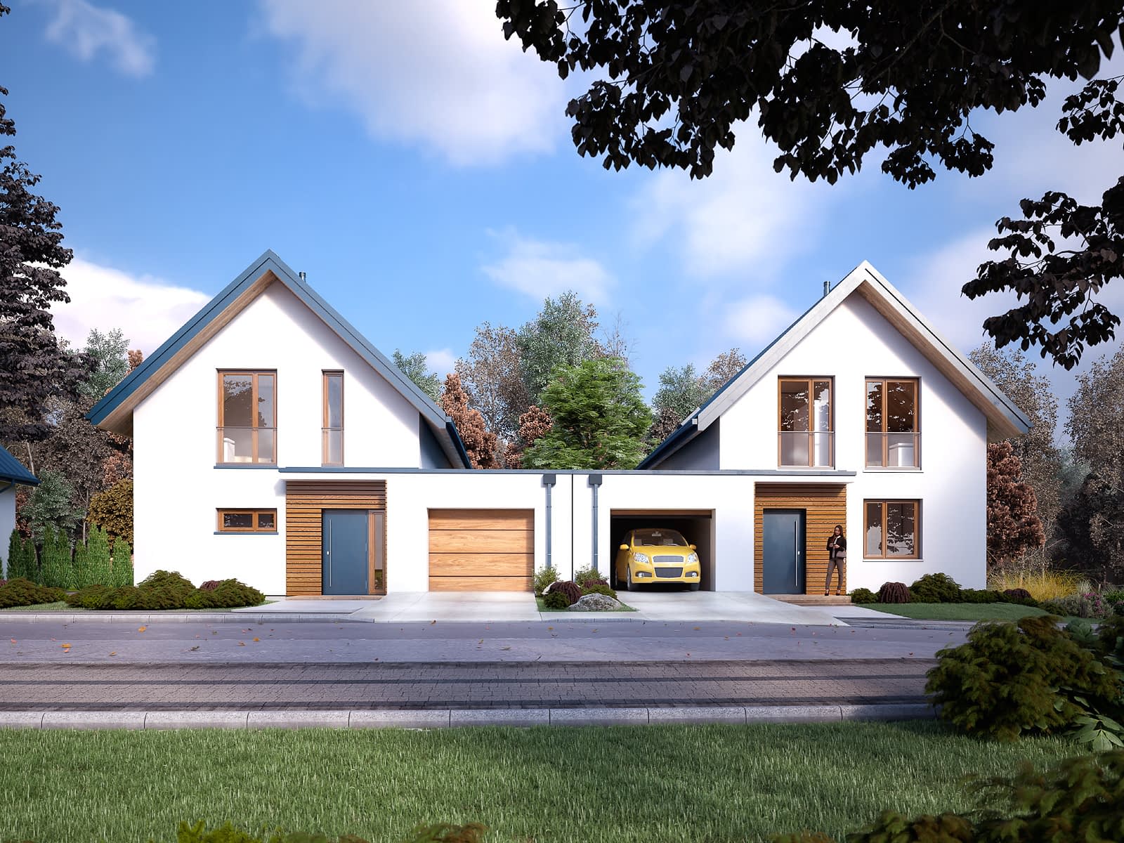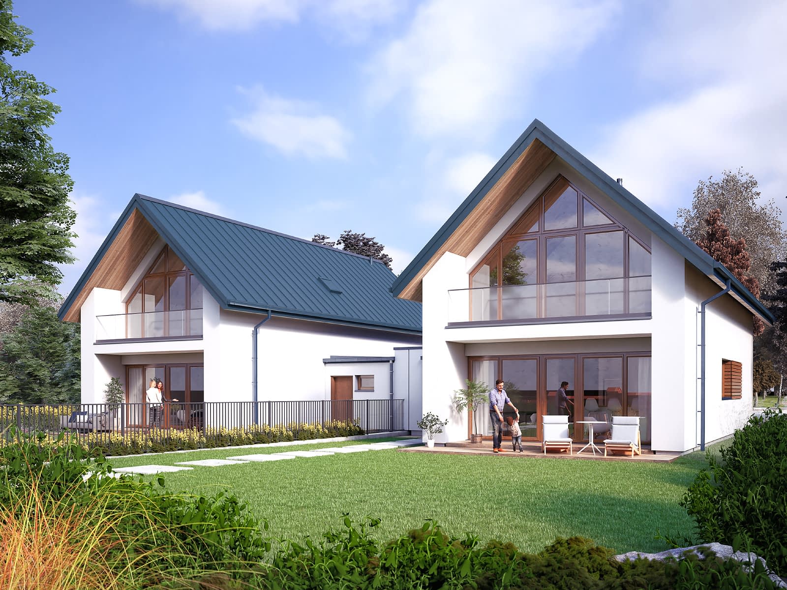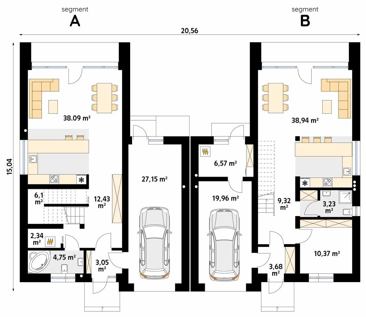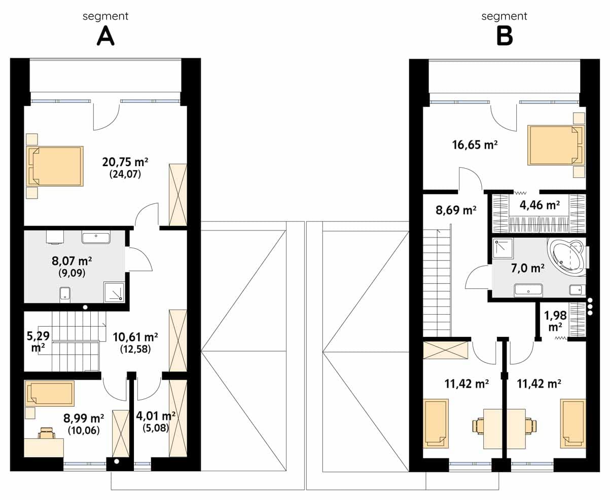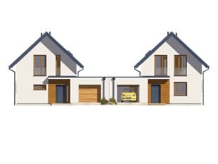 ASPEN to projekt domu w zabudowie bliźniaczej posiadający dwa różne segmenty. Projekt cechuje nowoczesne wykończenie oraz świetnie przemyślany układ funkcjonalny. Powierzchnia użytkowa obu segmentów jest bardzo podobna i wynosi ok. 150 m2. Segment lewy na parterze posiada otwartą część dzienną z salonem, jadalnią i kuchnią, pomieszczenie gospodarcze z miejscem na pompę ciepła oraz niewielką łazienkę. Na poddaszu zaprojektowano dwie sypialnie oraz rodzinną łazienkę. W segmencie prawym na parterze odnaleźć można otwartą część dzienną z salonem, jadalnią i kuchnią oraz dodatkowy pokój idealny do pracy i nauki. Część nocna to trzy wygodne sypialnie oraz ogólnodostępna łazienka.Konstrukcja