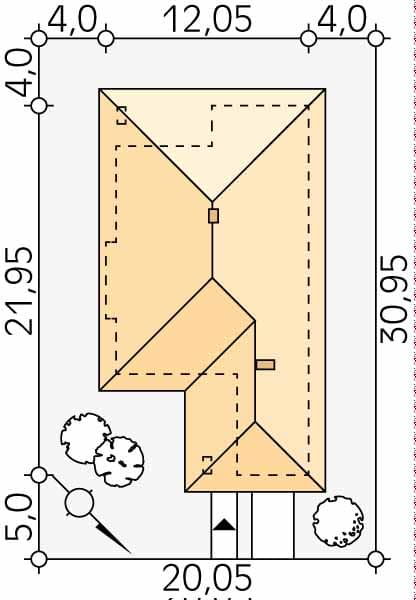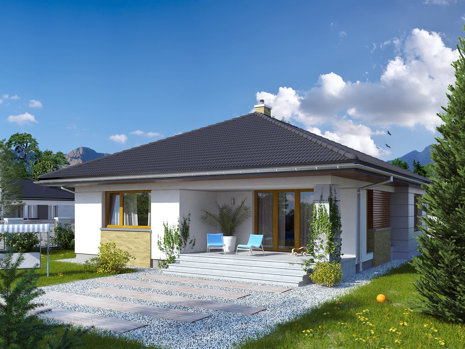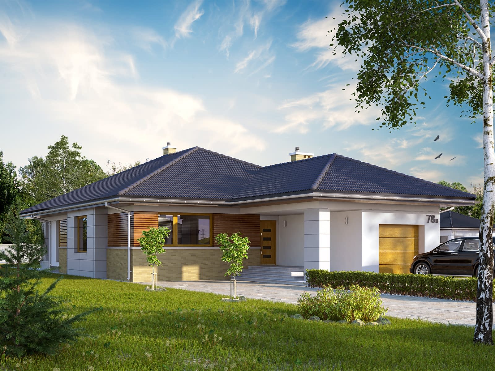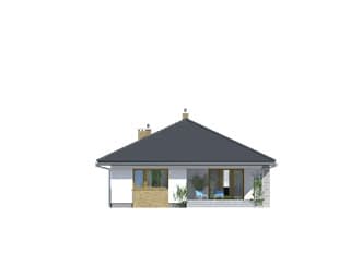 Przestronny dom jednorodzinny z dwoma łazienkami i trzema sypialniami w części nocnej oraz efektownym holem wejściowym, spiżarnią, dużą kuchnią, ciekawie zaakcentowaną jasną jadalnią, salonem, który otwiera sie na taras w części dziennej. Dodatkowym uzupełnieniem jest jednostanowiskowy garaż, spora kotłownia i wiatrołap połączony z wygodną szatnią. Bryłę wyróżnia podcieniowe wejście. Dom idealny na wąską działkę.Konstrukcja