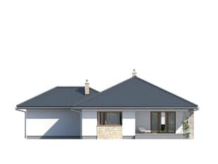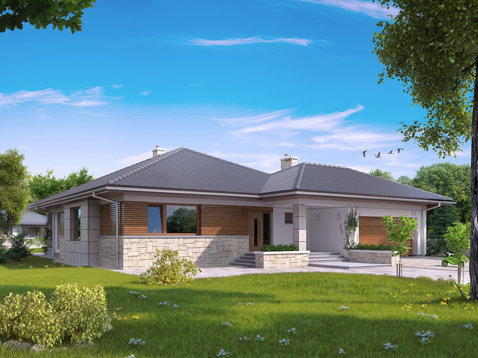 Bardzo wygodny dom jednorodzinny z dwustanowiskowym garażem interesująco ożywiającym bryłę budynku. Dodatkowymi atutami podnoszącymi komfort domu jest wydzielona jadalnia, spiżarnia, wc i przestronny hol wejściowy w części dziennej. Część nocną tworzą trzy sypialnie z dużą łazienką. Salon spełni rolę wypoczynkową zarówno zimą - dzięki kominkowi, jak i latem poprzez duże przeszklenia i otwarcie na zadaszony taras .Konstrukcja