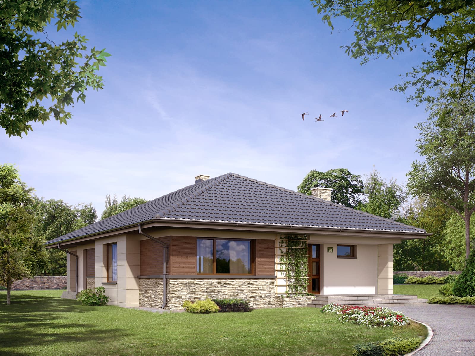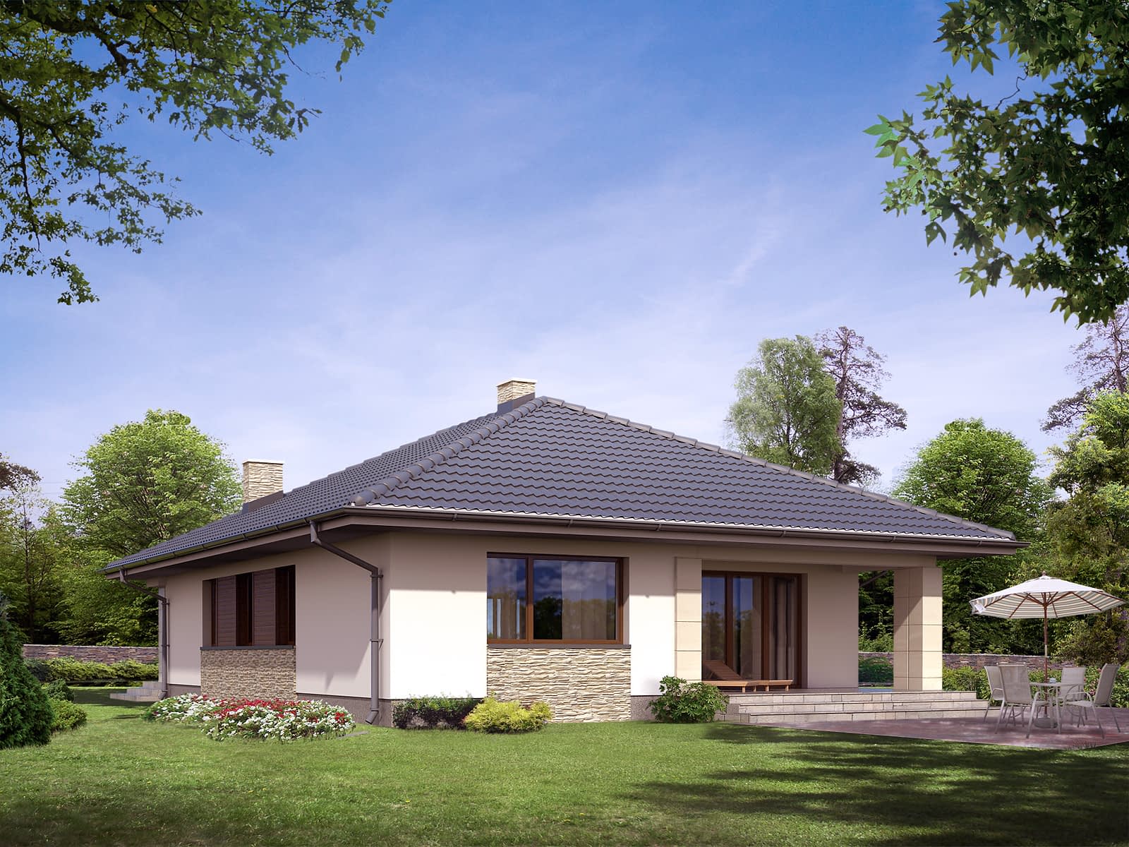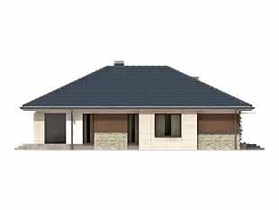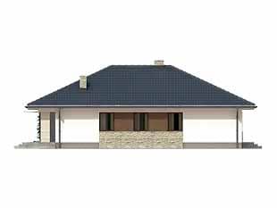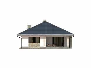 Dom jednorodzinny, parterowy. Posiada zadaszony taras dostępny z salonu. W projekcie zastosowano wyraźny podział na część dzienną i nocną. Dom idealny dla 4-osobowej rodziny.Konstrukcja