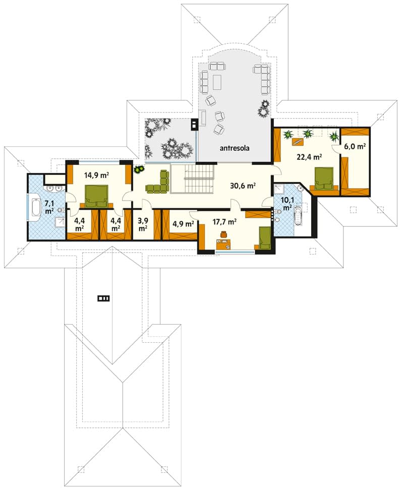 - rzuty poziome poszczególnych kondygnacji (parter, poddasze lub piętro),