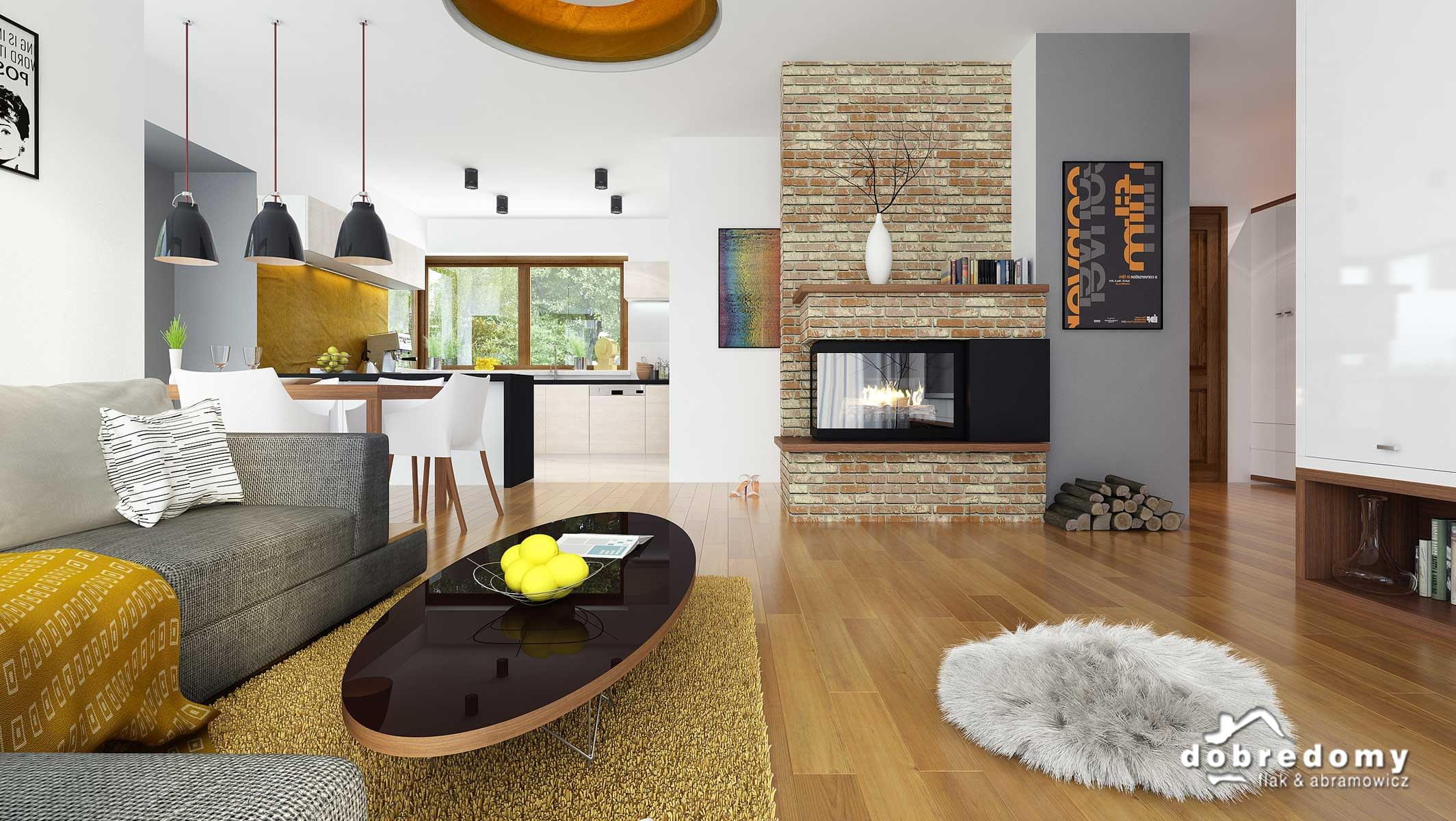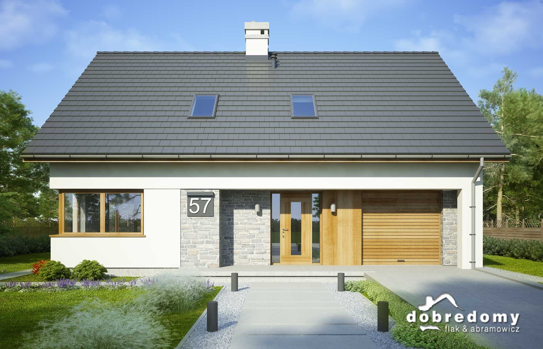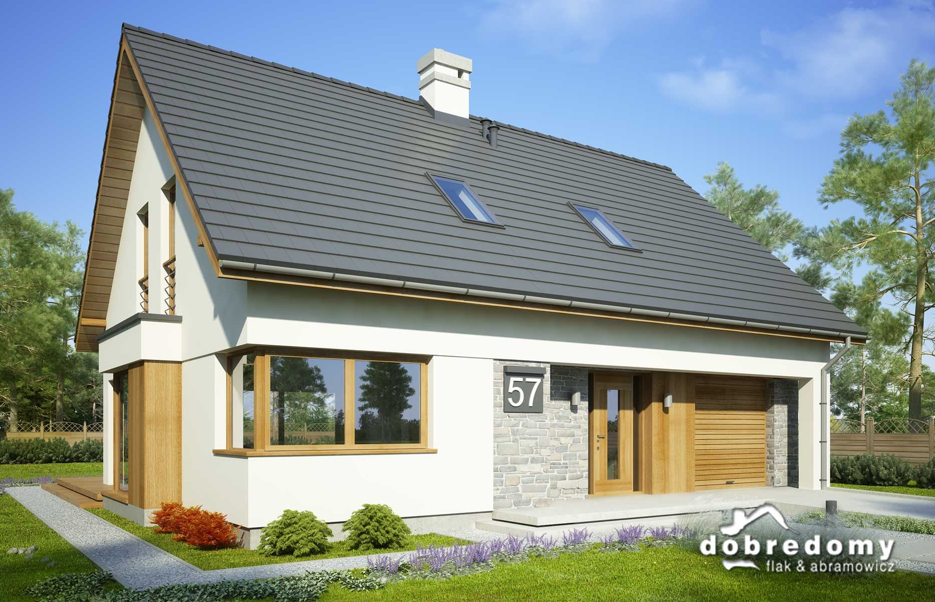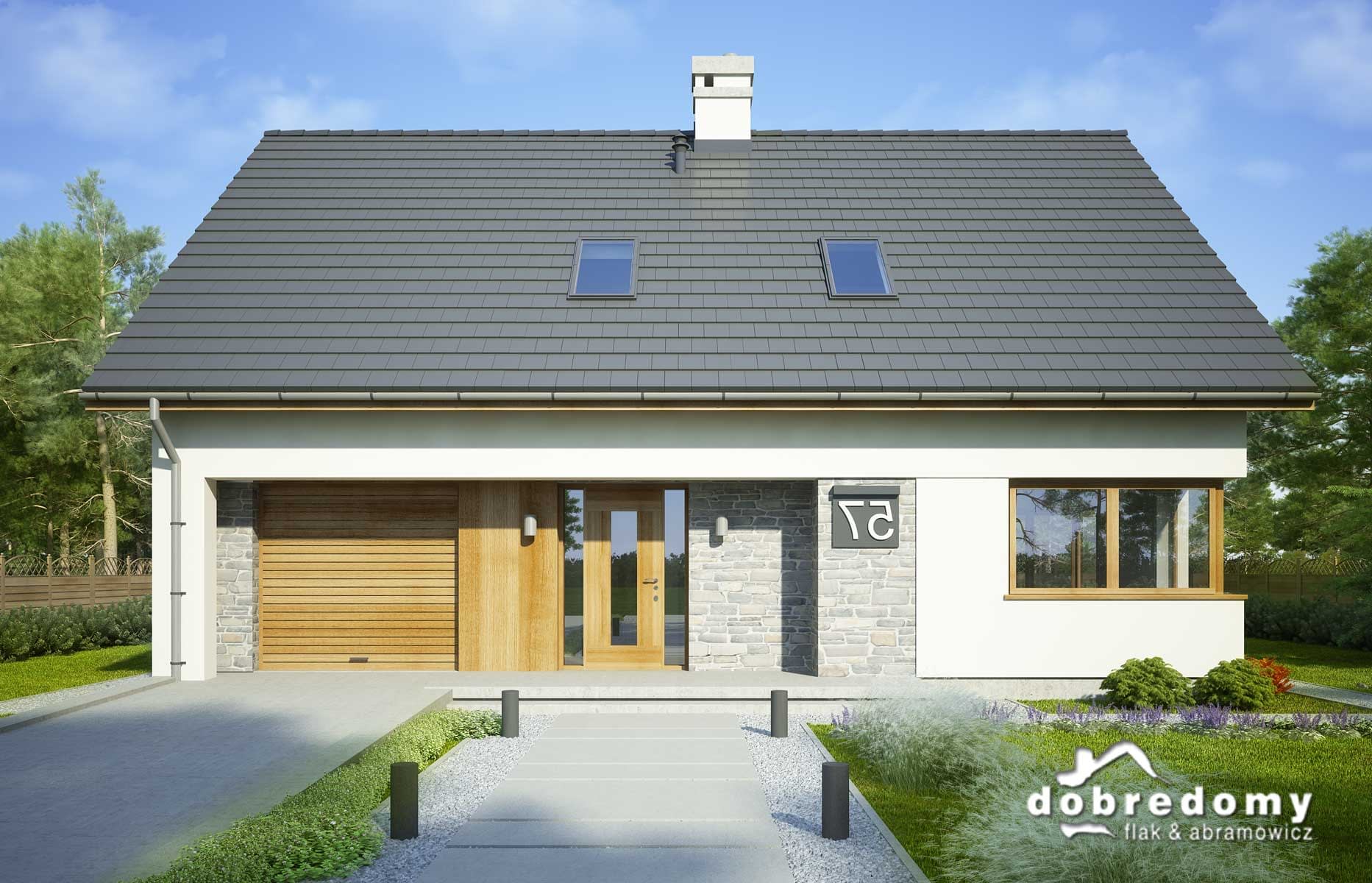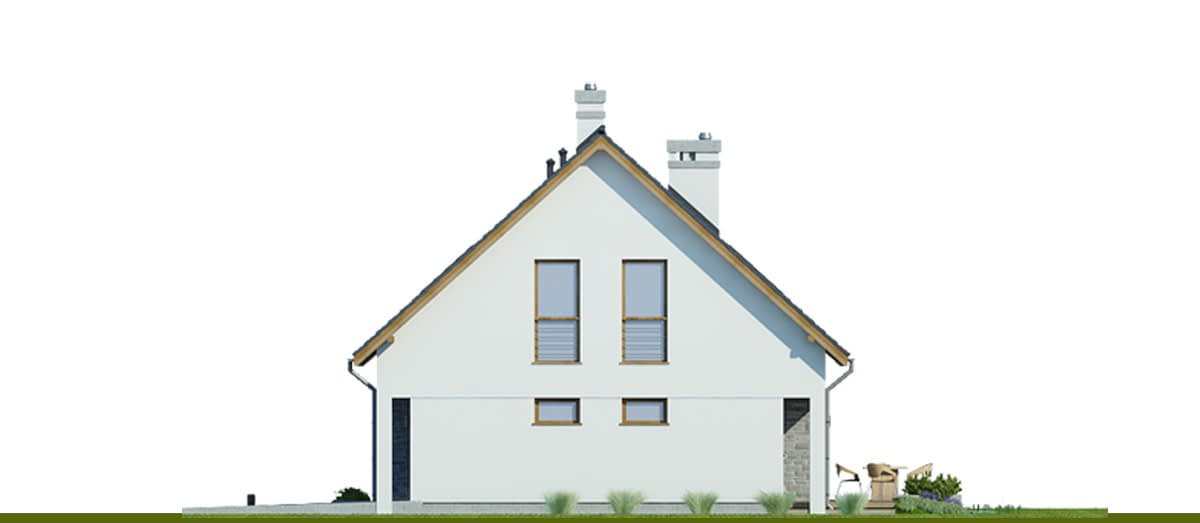 Projekt jednorodzinnego domu parterowego z poddaszem użytkowym i garażem 1-stanowiskowym, przeznaczony dla rodziny 4-5-osobowej. Układ funkcjonalny parteru obejmuje otwartą strefę dzienną (salon połączony z jadalnią i kuchnią) oraz gospodarczą (garaż i pom. gosp.). Dodatkowe pomieszczenia na tej kondygnacji to: spiżarnia, osobne wc, schowek. Na poddaszu zlokalizowano strefę nocną (4 sypialnie i łazienka).
