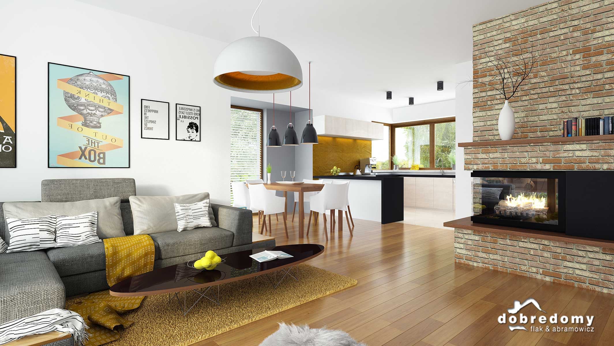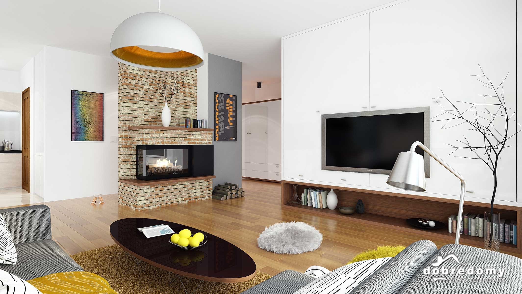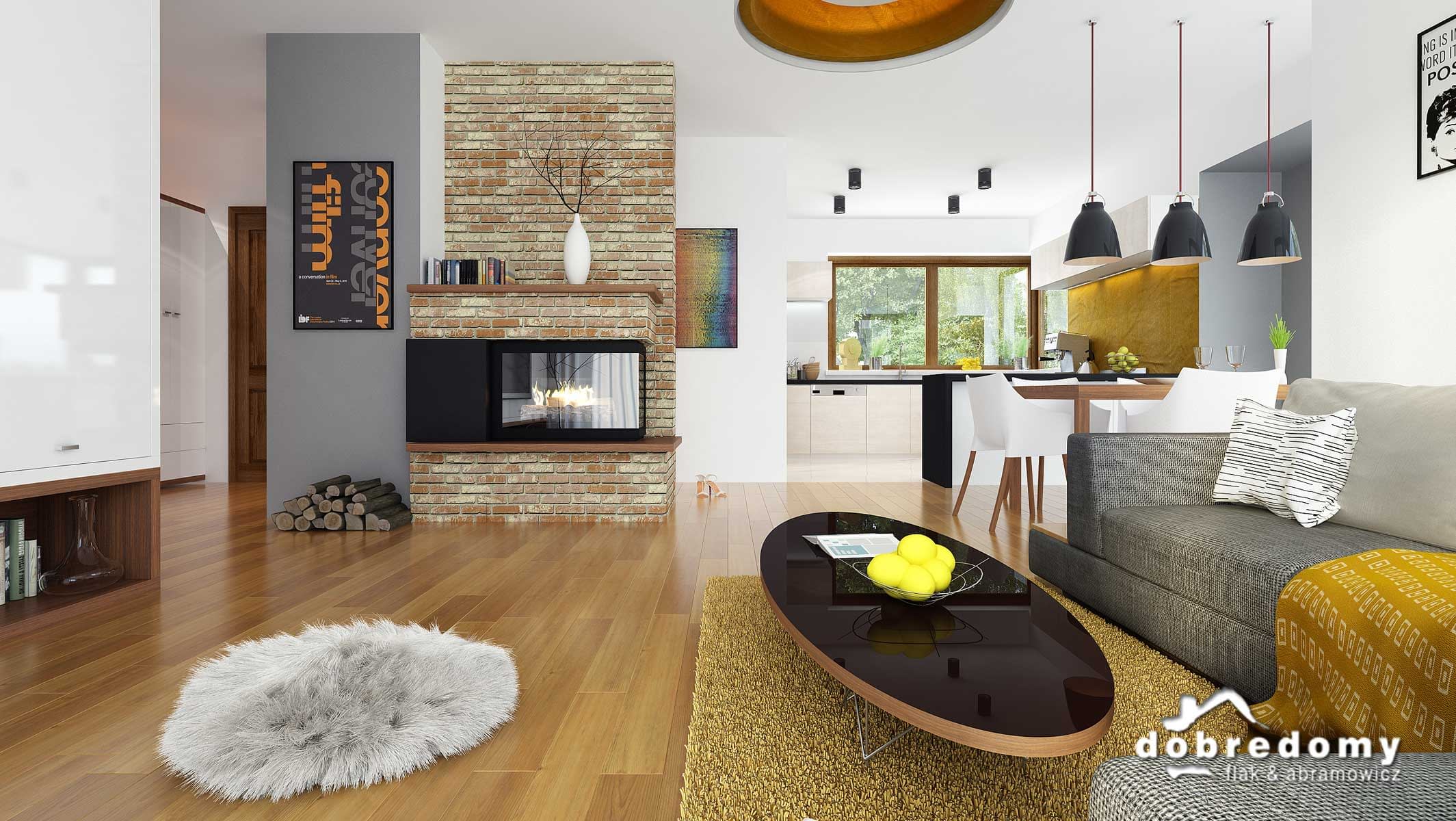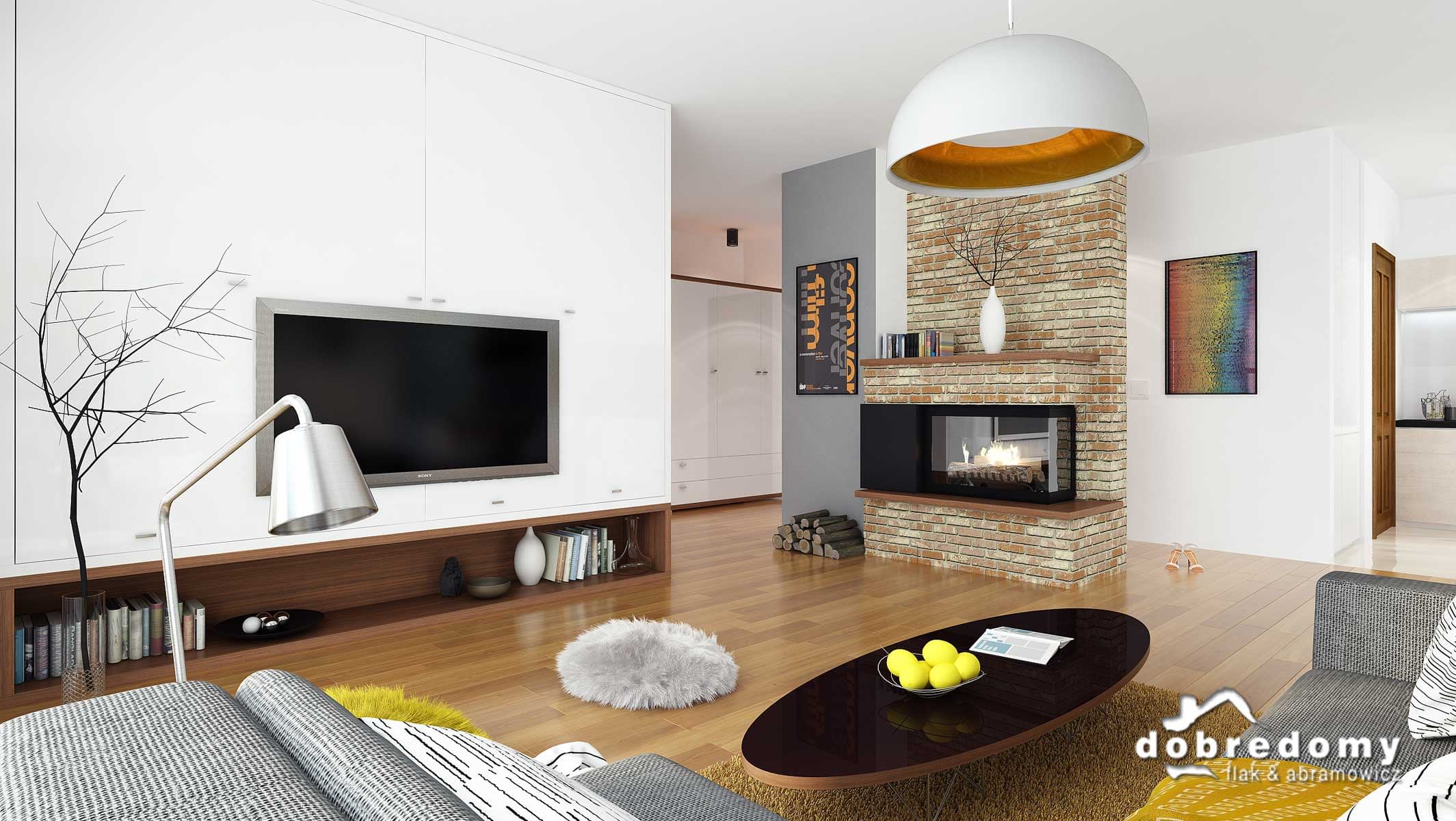 Projekt jednorodzinnego domu parterowego z poddaszem użytkowym i garażem 1-stanowiskowym, przeznaczony dla rodziny 4-5-osobowej. Układ funkcjonalny parteru obejmuje otwartą strefę dzienną (salon połączony z jadalnią i kuchnią) oraz gospodarczą (garaż i pom. gosp.). Dodatkowe pomieszczenia na tej kondygnacji to: spiżarnia, osobne wc, schowek. Na poddaszu zlokalizowano strefę nocną (4 sypialnie i łazienka).