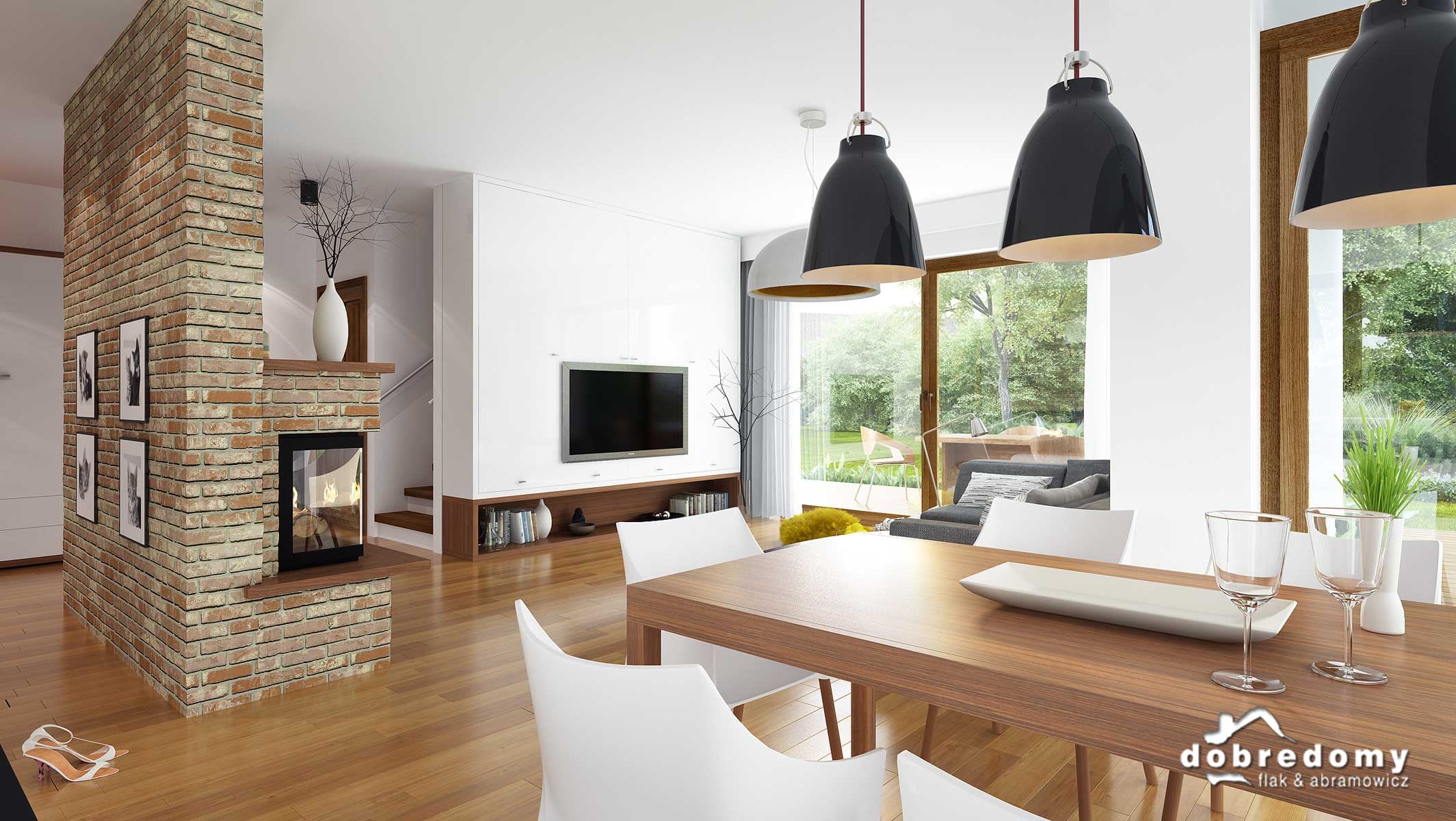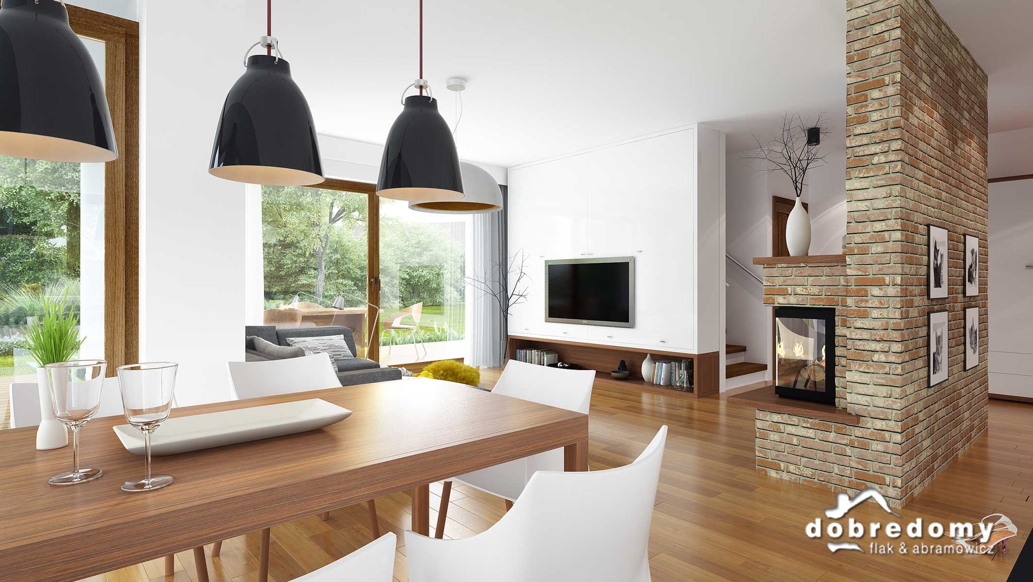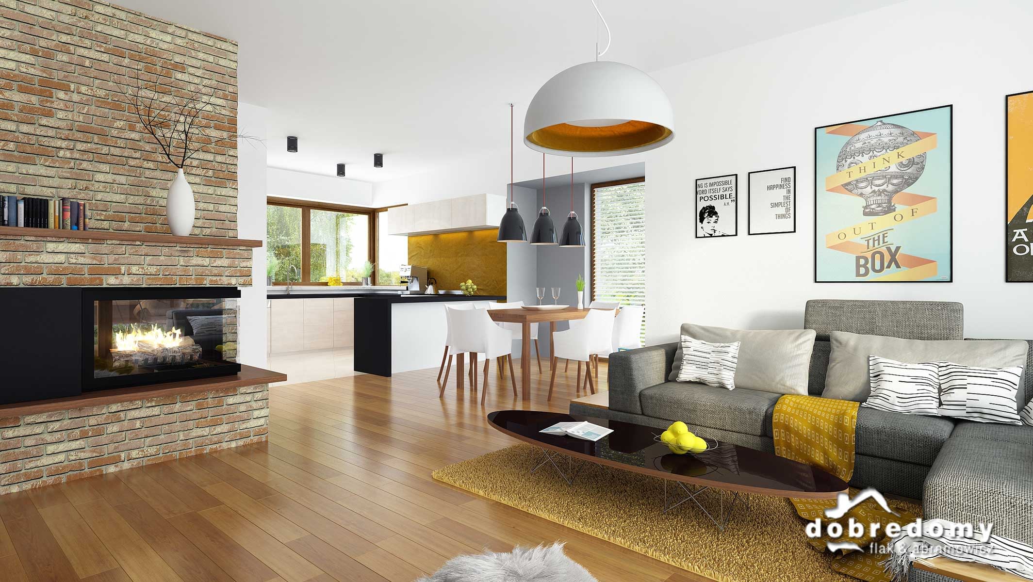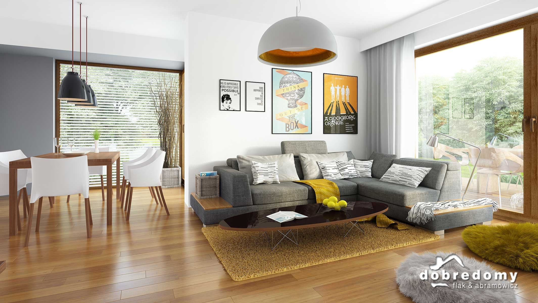 Projekt jednorodzinnego domu parterowego z poddaszem użytkowym i garażem 1-stanowiskowym, przeznaczony dla rodziny 4-5-osobowej. Układ funkcjonalny parteru obejmuje otwartą strefę dzienną (salon połączony z jadalnią i kuchnią) oraz gospodarczą (garaż i pom. gosp.). Dodatkowe pomieszczenia na tej kondygnacji to: spiżarnia, osobne wc, schowek. Na poddaszu zlokalizowano strefę nocną (4 sypialnie i łazienka).