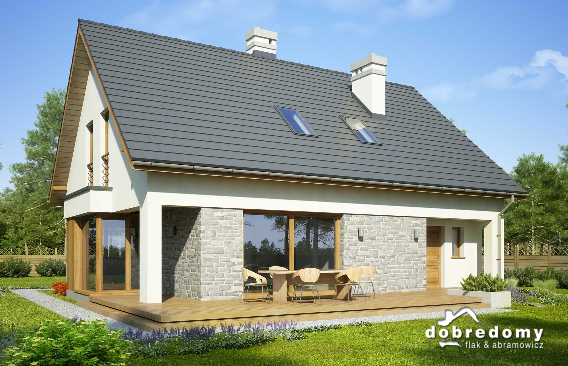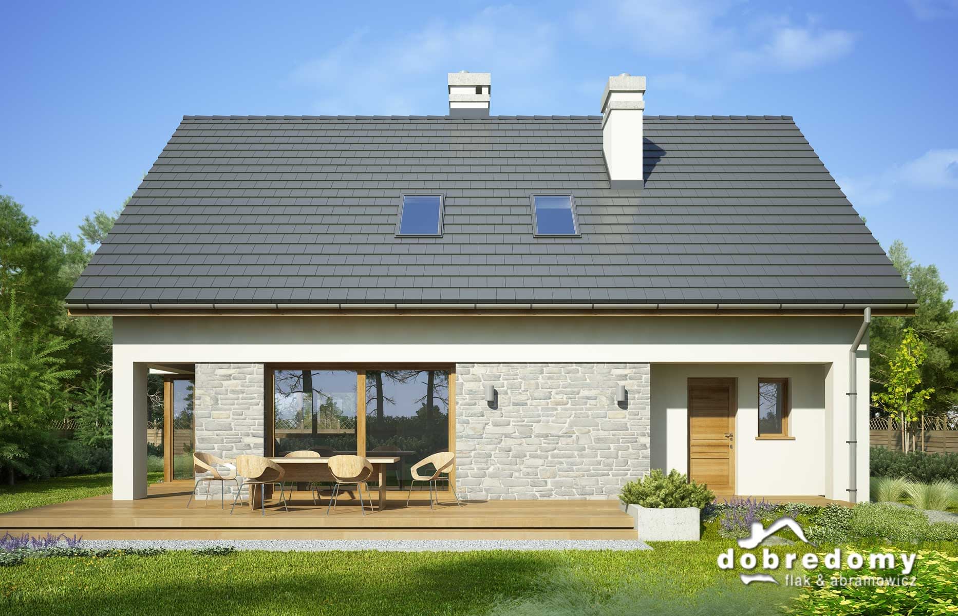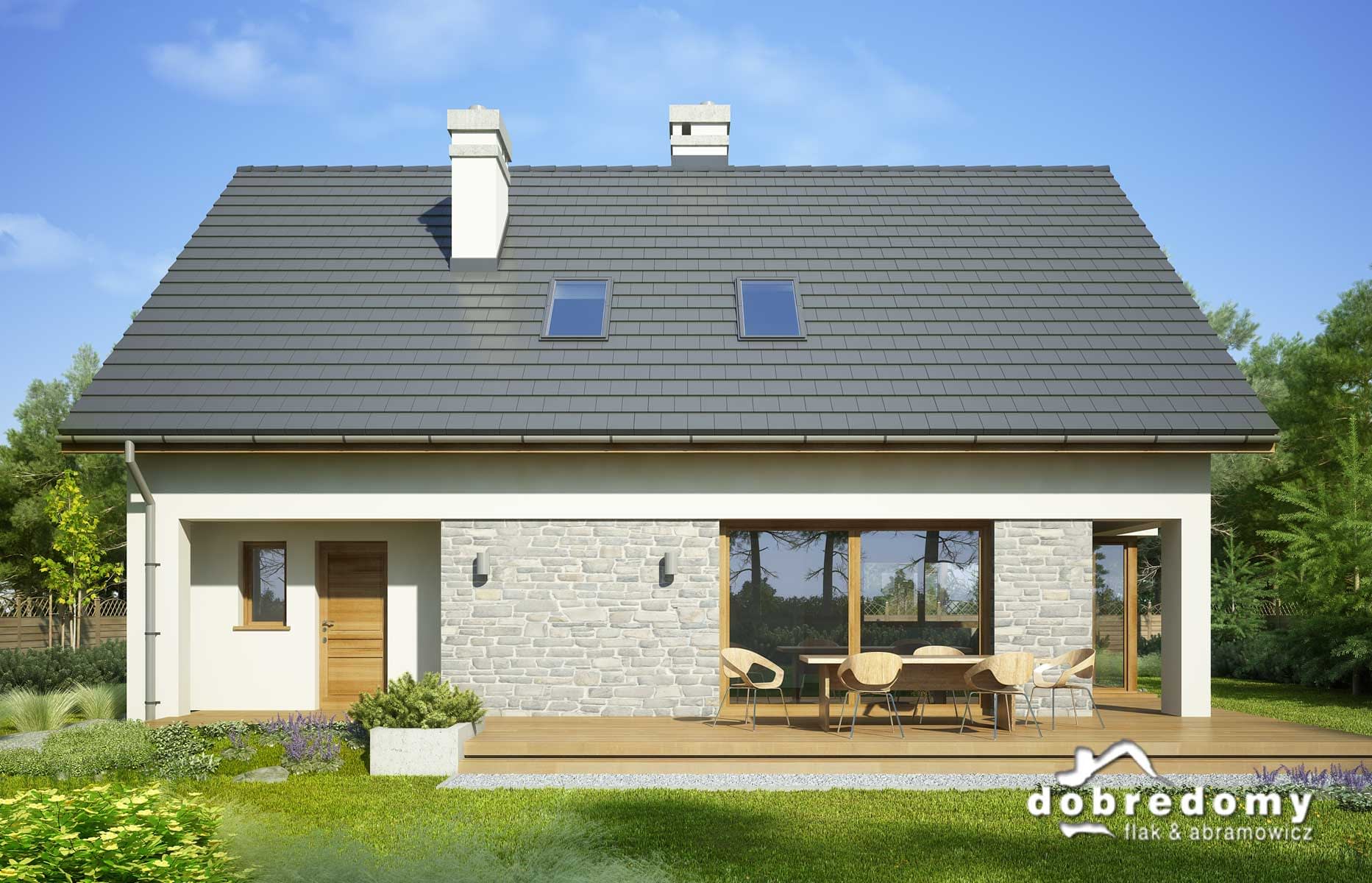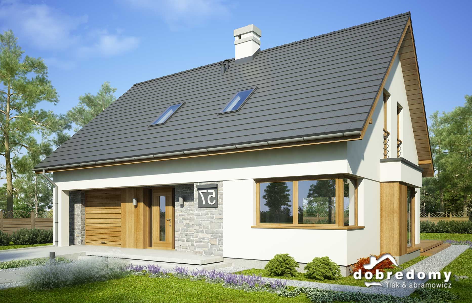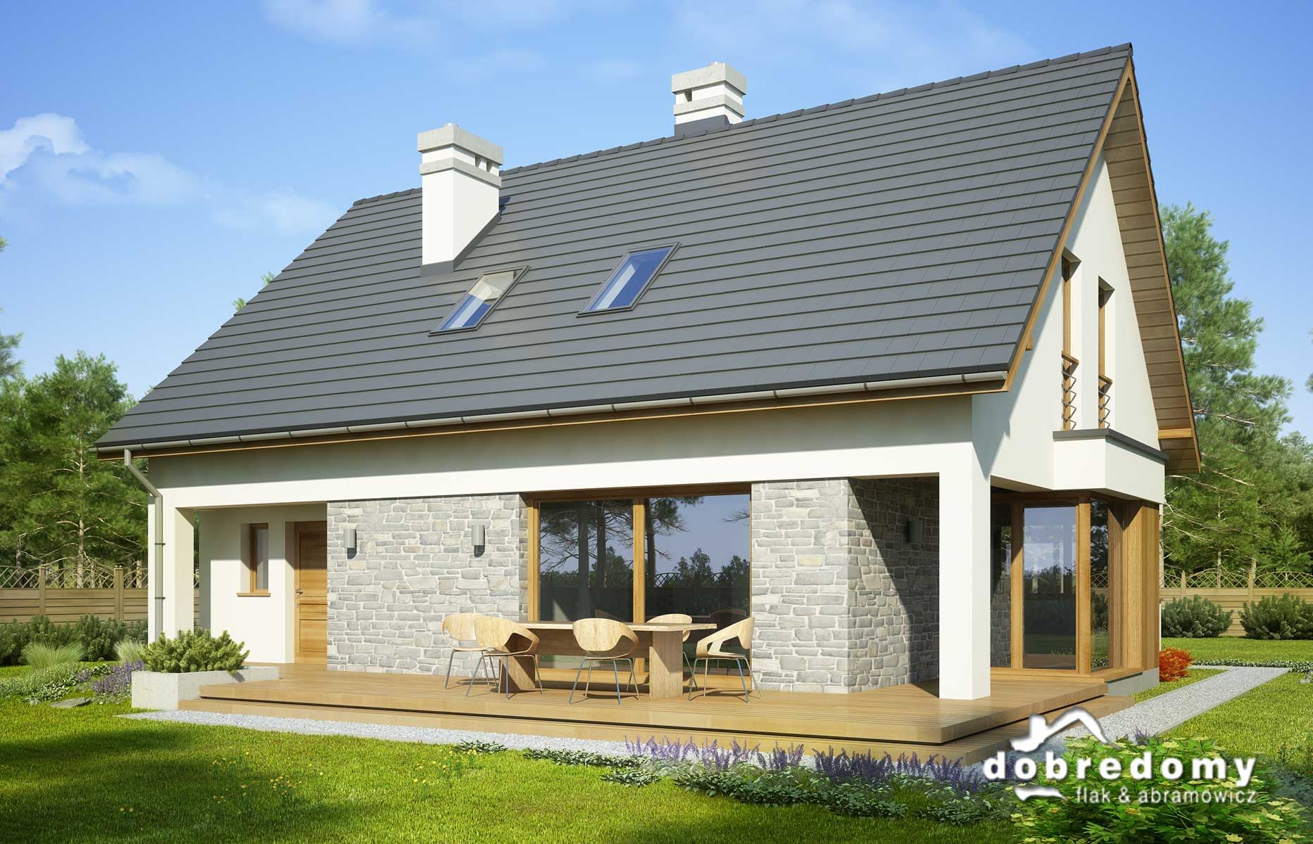 Elewacje pokryte tynkiem strukturalnym w systemie ociepleń Termo Organika oraz okładziną drewnianą i kamienną. W projekcie zastosowano okna dachowe marki FAKRO. Pokrycie dachu - dachówka ceramiczna lub cementowa CREATON.