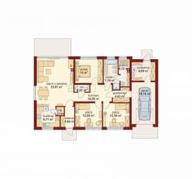 ATLANT PS to projekt stworzony z myślą o 4-osobowej rodzinie. Przez wygodny przedsionek z miejscem na szafę, wchodzimy do przestronnego salonu połączonego z jadalnią. Kuchnię, można otworzyć na część dzienną, lub pozostawić oddzieloną meblami, natomiast spiżarnię w zależności od upodobań można przeznaczyć na miejsce dla dodatkowych szaf kuchennych czy powiększenie przestrzeni na odzież w wiatrołapie. Przy przejściu do zacisznej części nocnej znajduje się dogodnie umiejscowiona toaleta, za którą znajdują się trzy obszerne sypialnie, kompleksowo wyposażona łazienka z przejściem do pralni, oraz garaż dostępny przez praktycznie usytuowane pomieszczenie gospodarcze. Z garażu dostępna jest obszerna kotłownia z wyjściem do ogrodu. Zastosowanie stopu gęstożebrowego umożliwia ponadto bezproblemową aranżację pomieszczeń na poddaszu projektując schody w miejscu obecnego WC.