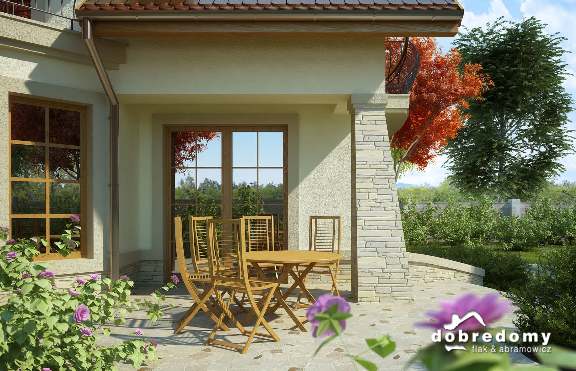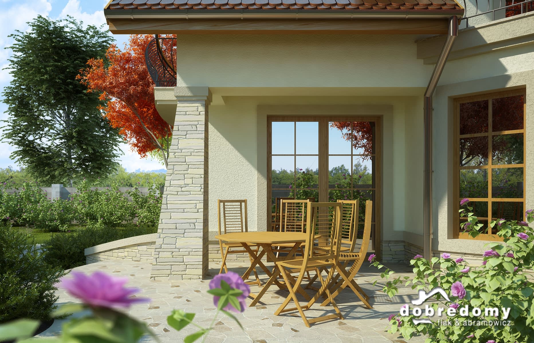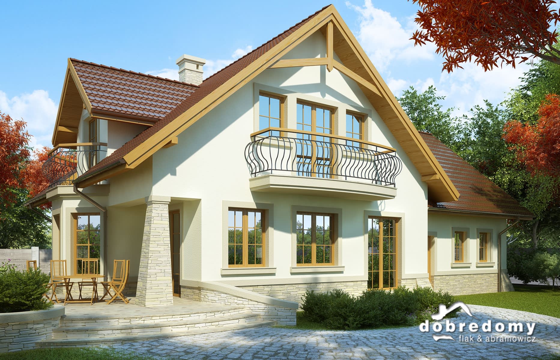 Elewacje pokryte tynkiem strukturalnym w systemie ociepleń Termo Organika i okładziną kamienna. Pokrycie dachu - dachówka ceramiczna lub cementowa.