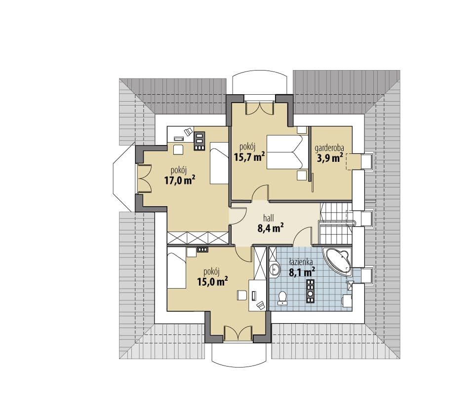 Dom z poddaszem użytkowym, niepodpiwniczony, przeznaczony dla 4-6-osobowej rodziny. Na parterze znajduje się część dzienna z obszernym salonem połączonym z jadalnią i bezpośrednim dostępem do kuchni, część gospodarcza oraz gabinet. Na poddaszu zlokalizowano część nocną z sypialniami dzieci, ogólnodostępną łazienką oraz sypialnią rodziców z odddzielną garderobą. W ramach adaptacji można powiększyć salon kosztem gabinetu oraz wydzielić kuchnię i jadalnię. Projekt dostępny w wersji z garażem dwustanowiskowym – Atlas II oraz w wersji z garażem jednostanowiskowym - Atlas.