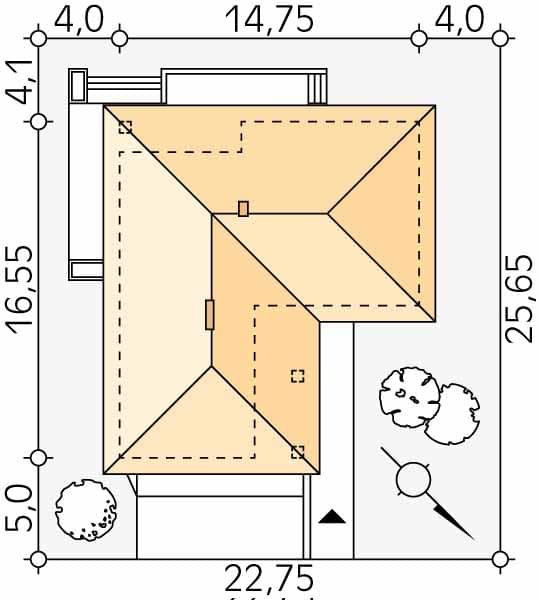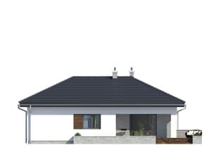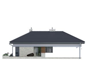 Wygodny i przestronny dom dla 4-osobowej rodziny z dwustanowiskowym garażem. Dodatkowo, dla podwyższenia komfortu zaprojektowano w nim spiżarnię i dwie łazienki. Pochylnia połączona z podjazdem nadaje bryle nowoczesny i otwarty charakter. Część dzienna wychodzi na przestronny taras wykończony donicami do uprawy ziół. Część nocną stanowią trzy sypialnie z dwiema łazienkami.Konstrukcja