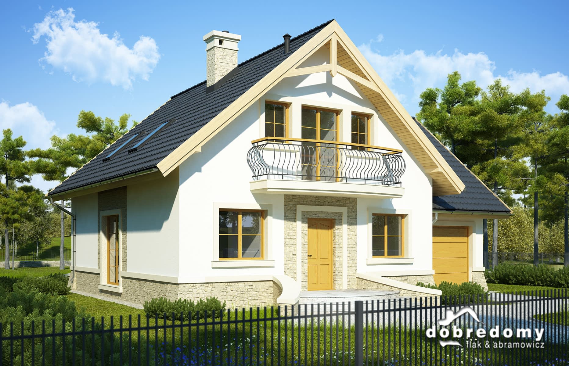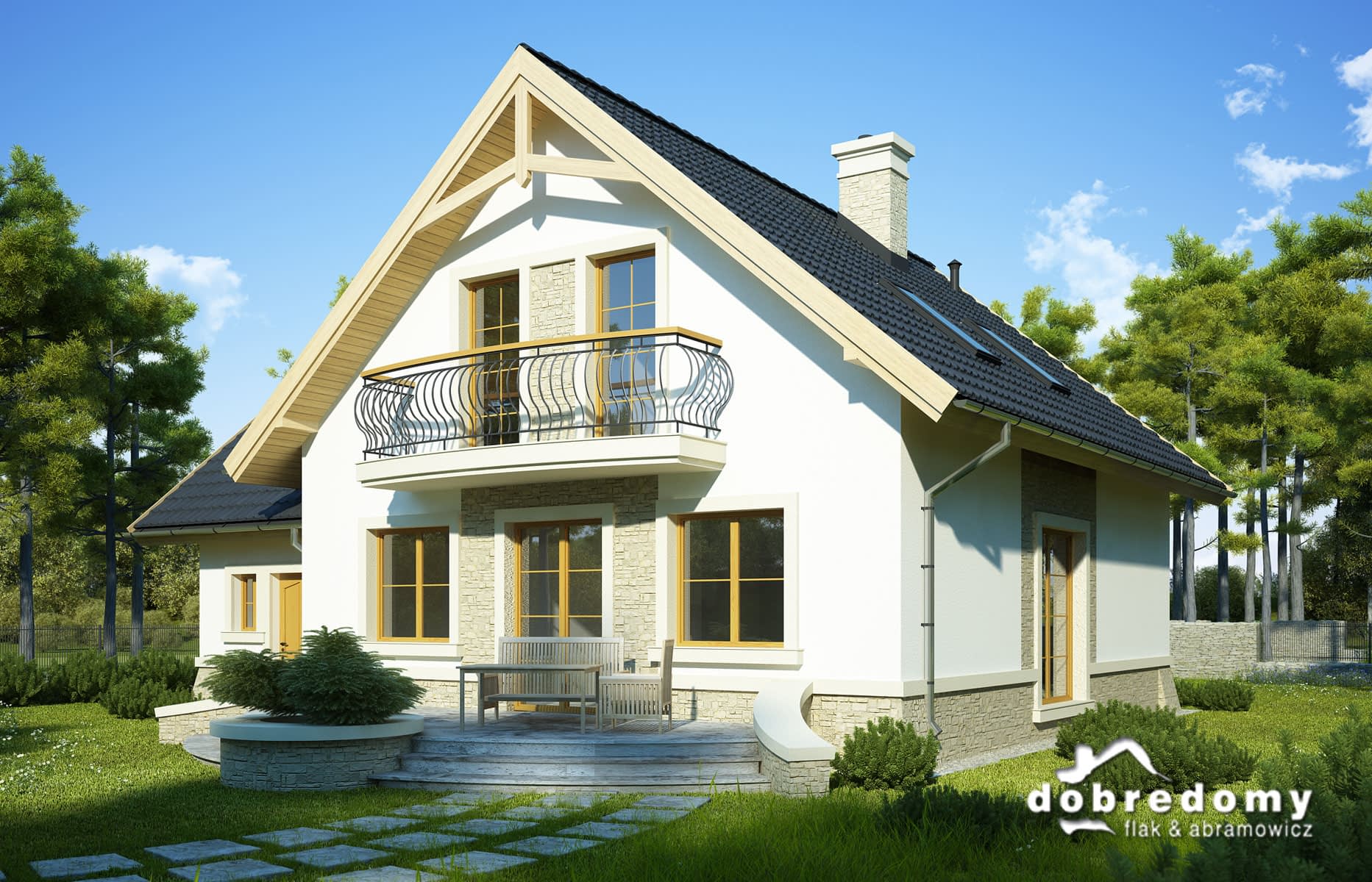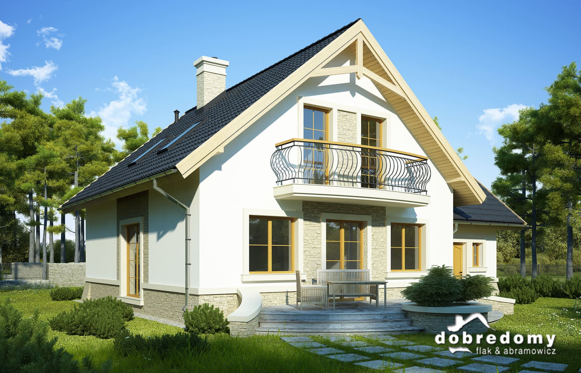 Elewacje pokryte tynkiem strukturalnym w systemie ociepleń Termo Organika oraz okładziną kamienną. W projekcie zastosowano okna dachowe marki FAKRO. Pokrycie dachu - dachówka ceramiczna lub cementowa CREATON.
