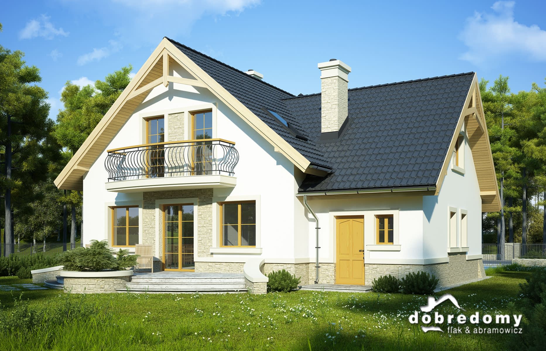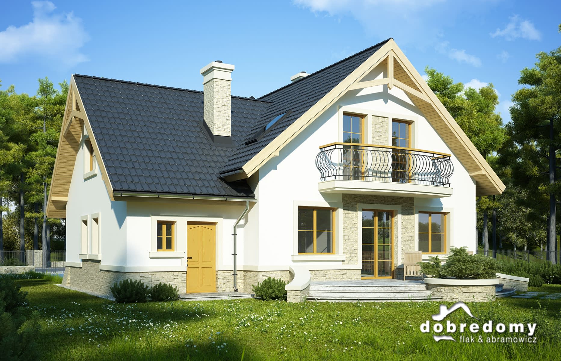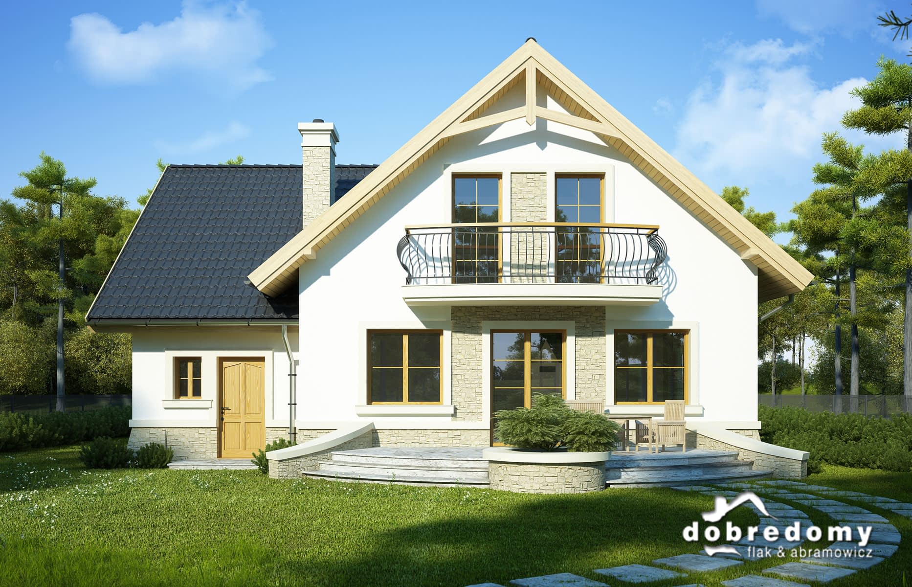 Elewacje pokryte tynkiem strukturalnym w systemie ociepleń Termo Organika oraz okładziną kamienną. W projekcie zastosowano okna dachowe marki FAKRO. Pokrycie dachu - dachówka ceramiczna lub cementowa CREATON.