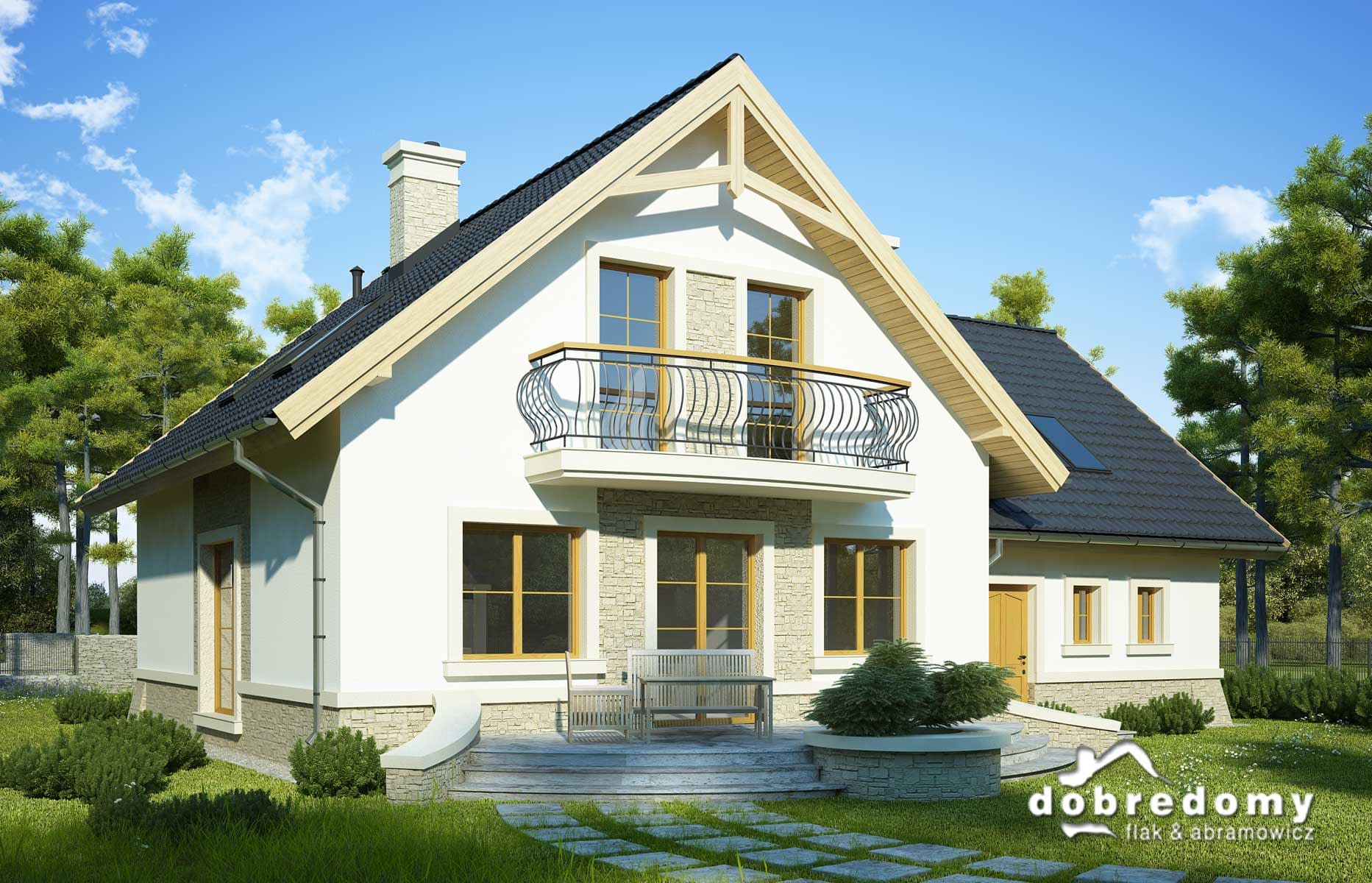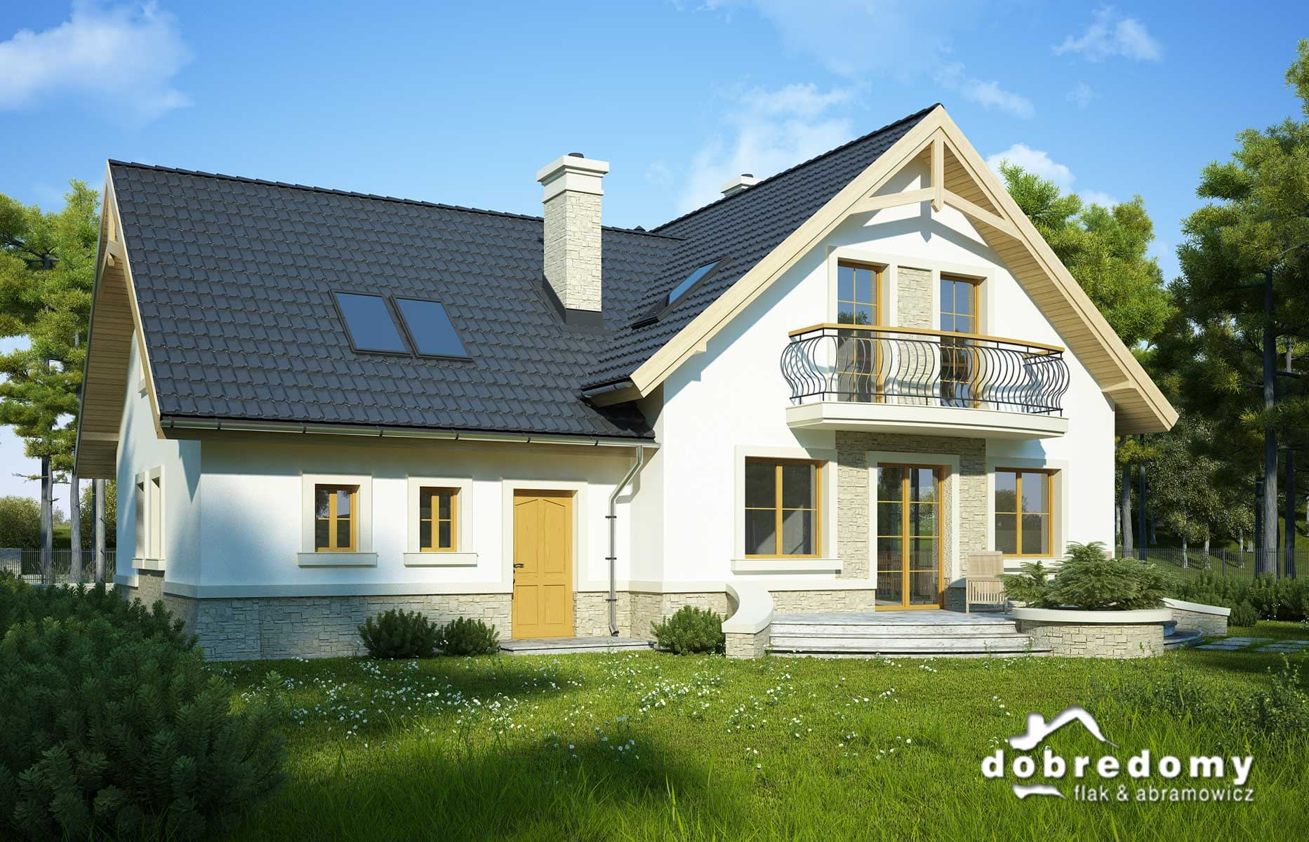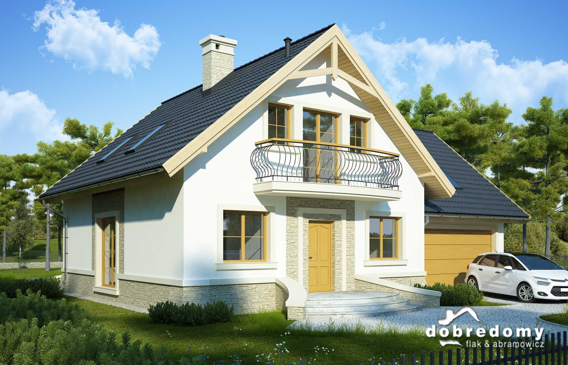 Elewacje pokryte tynkiem strukturalnym w systemie ociepleń Termo Organika oraz okładziną kamienną. W projekcie zastosowano okna dachowe marki FAKRO. Pokrycie dachu - dachówka ceramiczna lub cementowa CREATON.