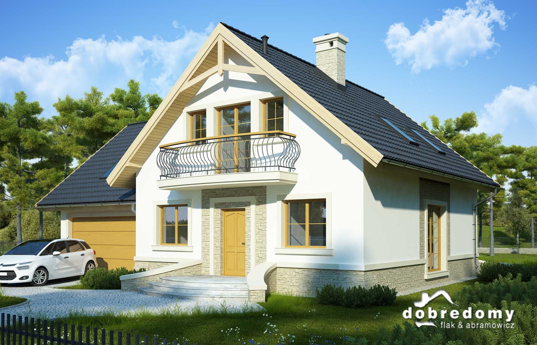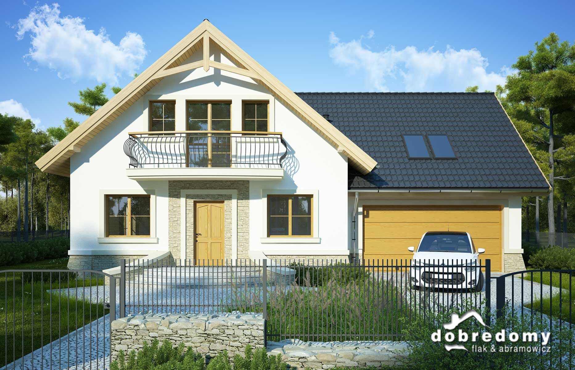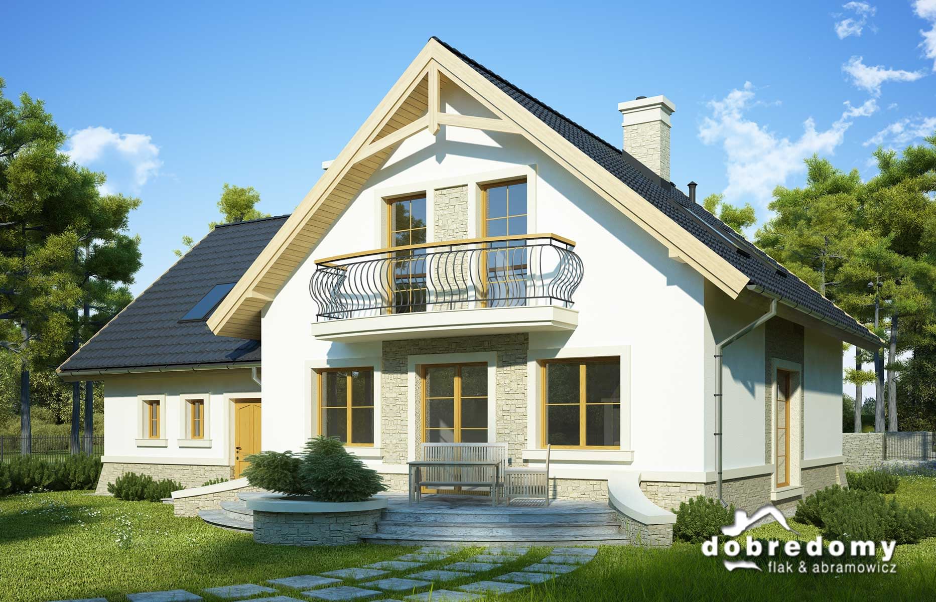 Elewacje pokryte tynkiem strukturalnym w systemie ociepleń Termo Organika oraz okładziną kamienną. W projekcie zastosowano okna dachowe marki FAKRO. Pokrycie dachu - dachówka ceramiczna lub cementowa CREATON.