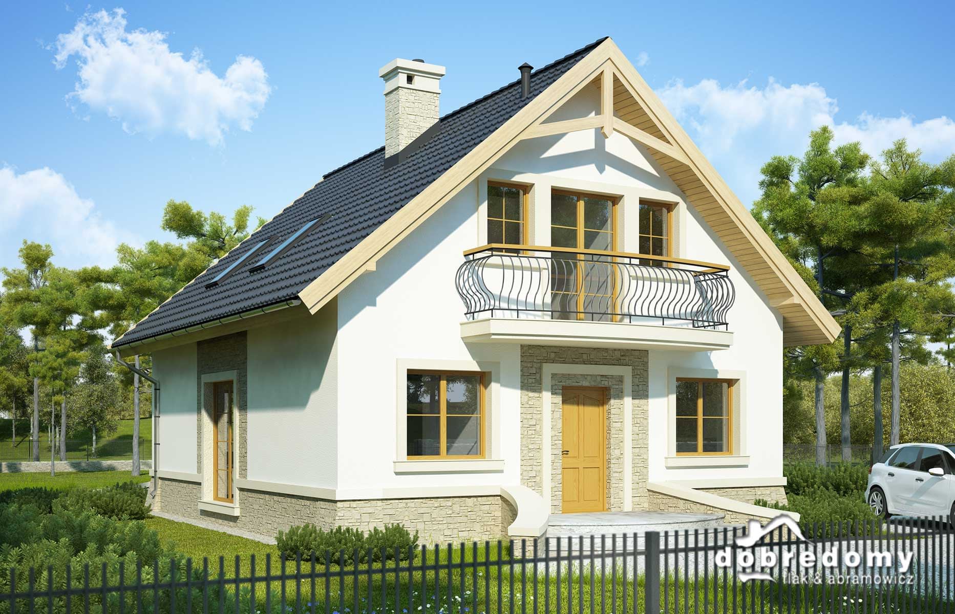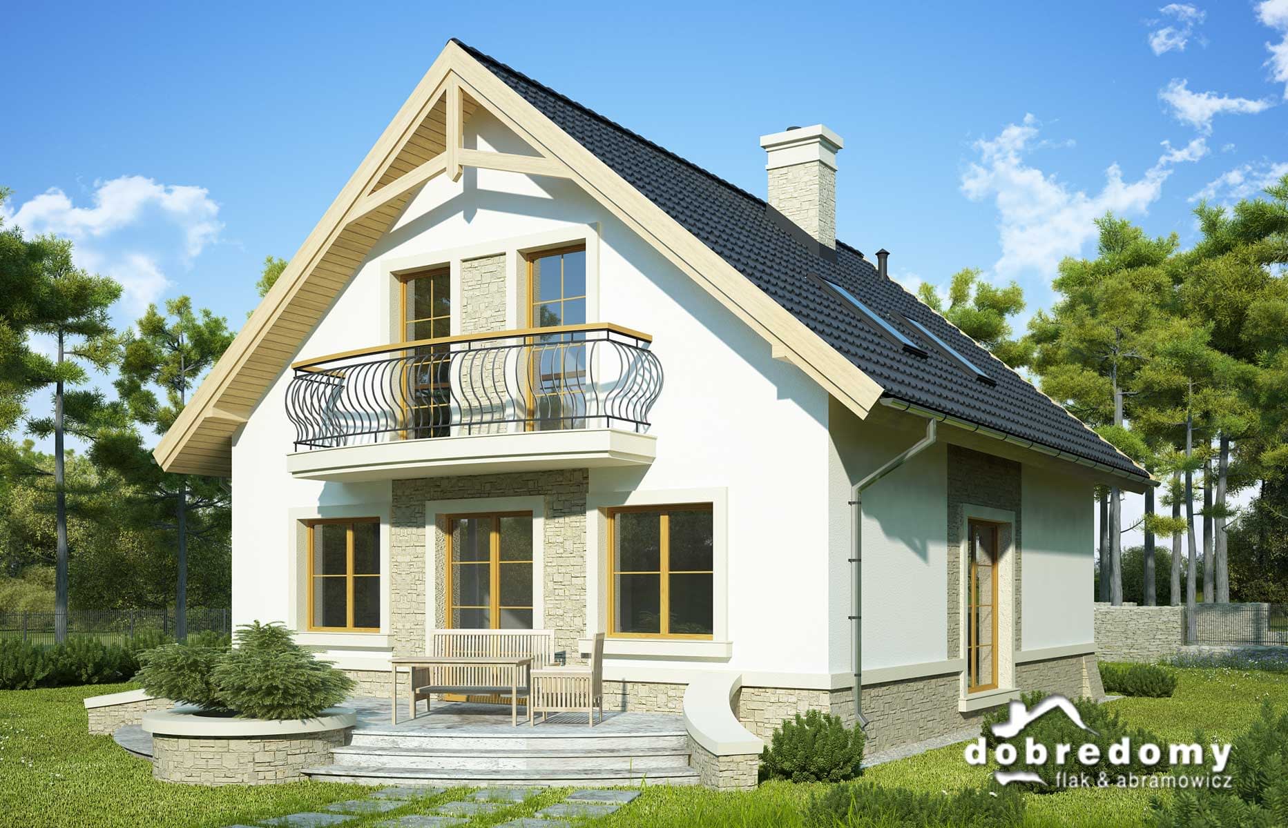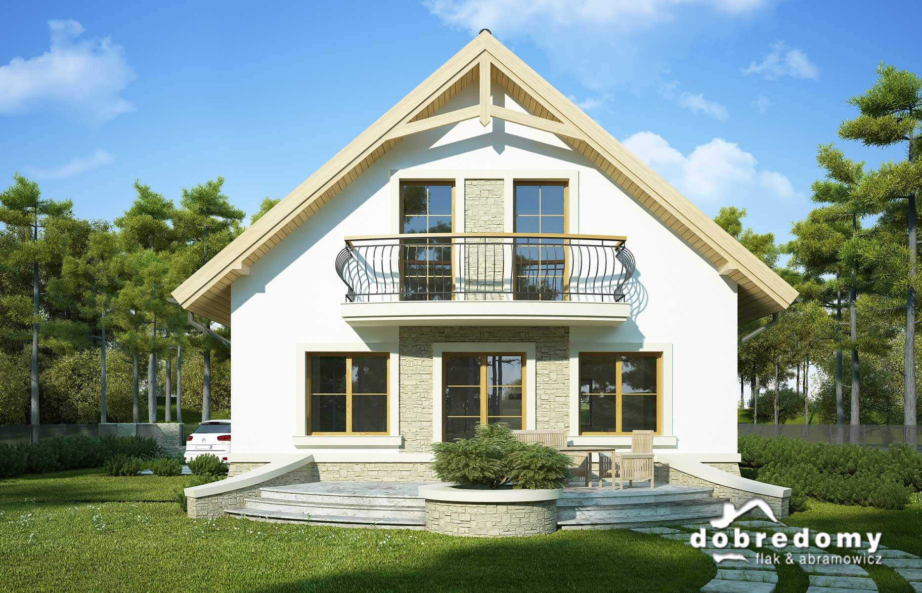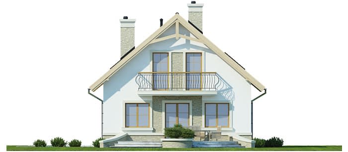 Elewacje pokryte tynkiem strukturalnym w systemie ociepleń Termo Organika oraz okładziną kamienną. W projekcie zastosowano okna dachowe marki FAKRO. Pokrycie dachu - dachówka ceramiczna lub cementowa CREATON.