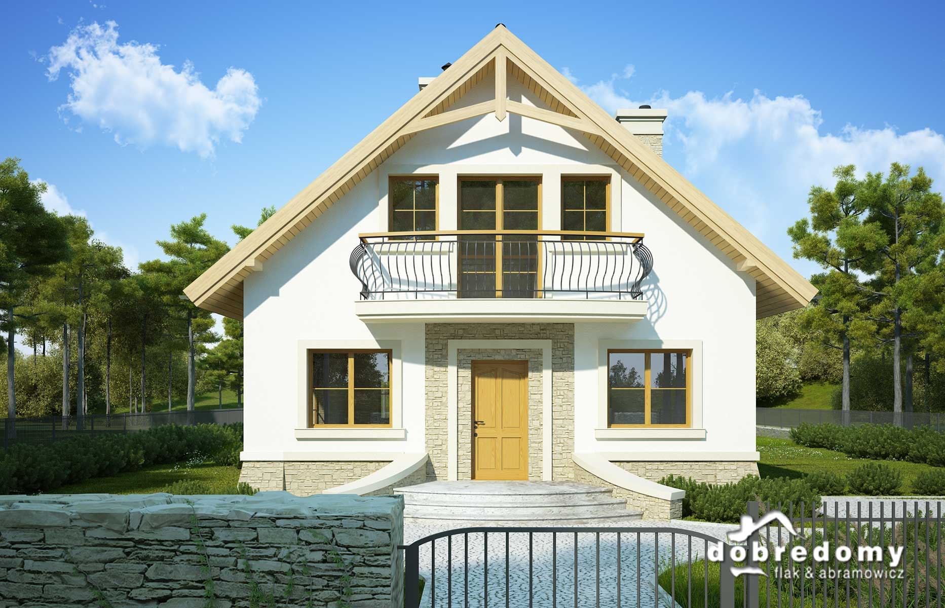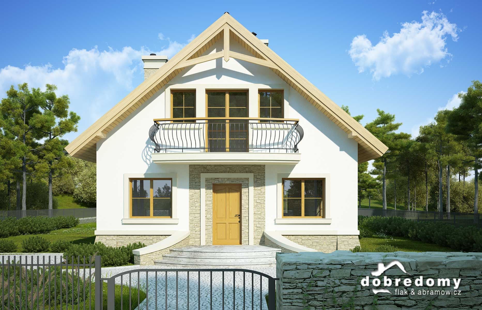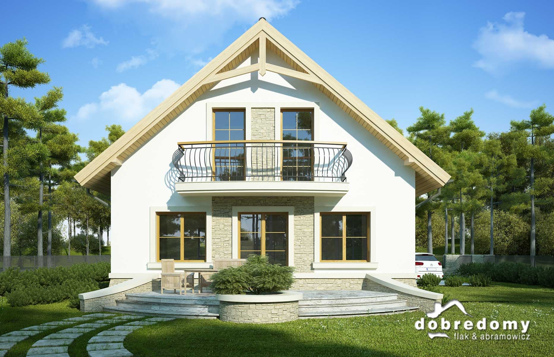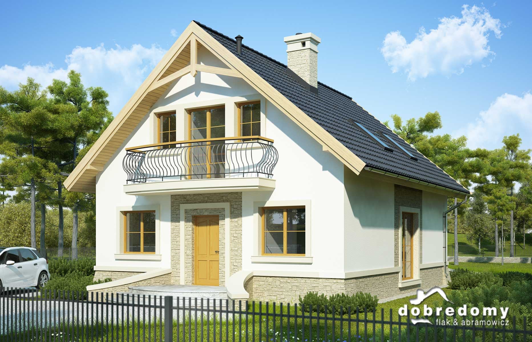 Elewacje pokryte tynkiem strukturalnym w systemie ociepleń Termo Organika oraz okładziną kamienną. W projekcie zastosowano okna dachowe marki FAKRO. Pokrycie dachu - dachówka ceramiczna lub cementowa CREATON.