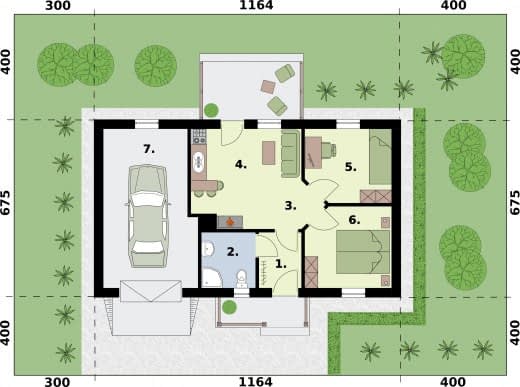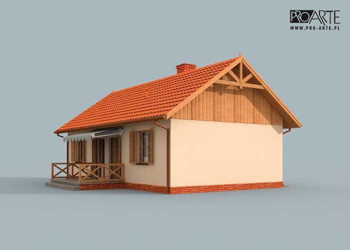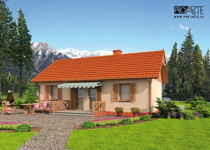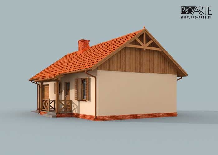 Averno będzie wyborem dla wszystkich żądających praktycznych rozwiązań w rozsądnej cenie. Domek świetnie nadaje się do wybudowania na łonie przyrody, z dala od zgiełku miasta. Od frontu budynku znajduje się garaż połączony dwuspadowym dachem z domem, po jego prawej stronie usytuowany jest zadaszony drewniany ganek, będący przedłużeniem dachu budynku. Przez ganek wchodzi się do domu. Na północnej ścianie Averny znajdziemy taras, świetnie sprawdzający się w czasie pięknej pogody jako miejsce odpoczynku w gronie bliskich. Bryła budynku urzeka prostotą, wyważeniem proporcji, objawiającym się m.in. w braku zbędnych elementów. Na załączonej wizualizacji świetnie widać, jak z gustem i harmonijnie dobrano kolor ścian, dachówki i cokoliku. Urokliwy i ciepły charakter elewacji jest tylko zapowiedzią przytulnych oraz komfortowych wnętrz. Weranda wiedzie do wiatrołapu, z którego przechodzi się do komunikacji. Po lewej stronie znajduje się łazienka, natomiast po prawej stronie komunikacji jest dość obszerna sypialnia. Za nią znajduje się jeszcze jeden pokój sypialny, np. dla dziecka, lub gości. Od komunikacji na wprost usytuowany jest pokój dzienny z aneksem kuchennym, w którym znajduje się kominek. Jest to miejsce, które z pewnością w zimowe wieczory będzie skupiać życie wypoczywających w domu ludzi.