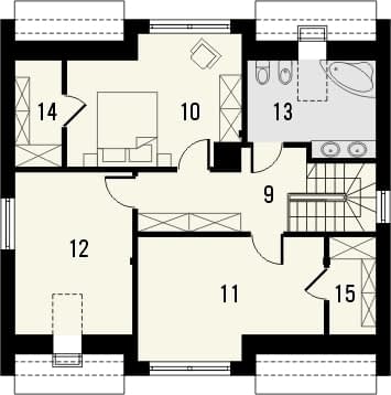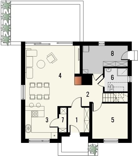 Darmowy zielony pakiet do projektu oznacza, że w tej samej cenie można otrzymać wariant z ogrzewaniem przy zastosowaniu ekologicznej pompy ciepła powietrze-woda i podłogówką we wszystkich pomieszczeniach, zamiast standardowego pieca gazowego zasilającego stalowe grzejniki płytowe.