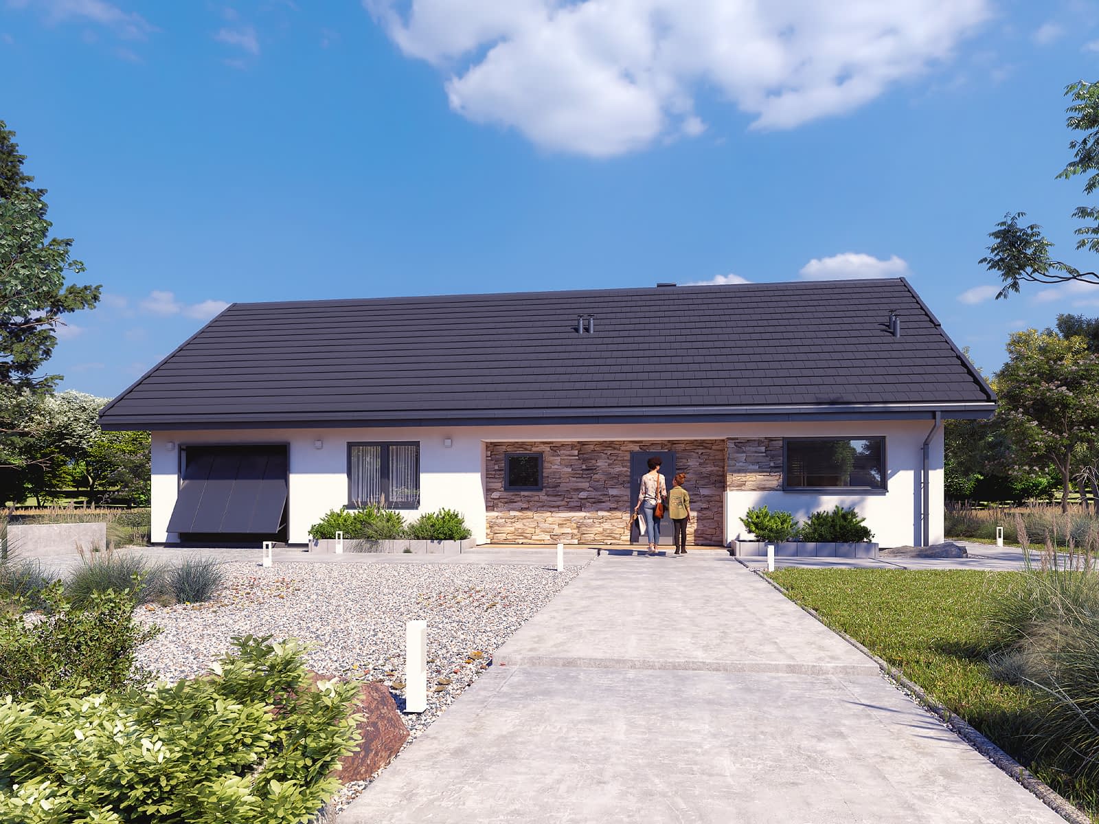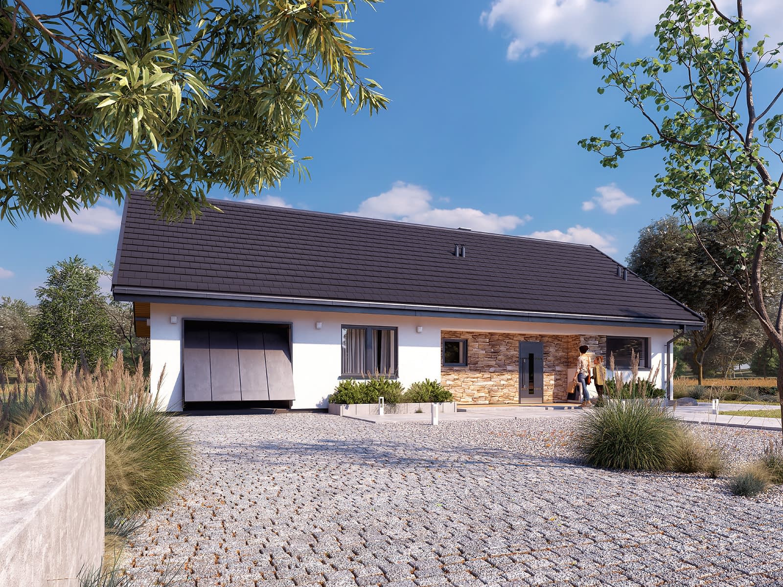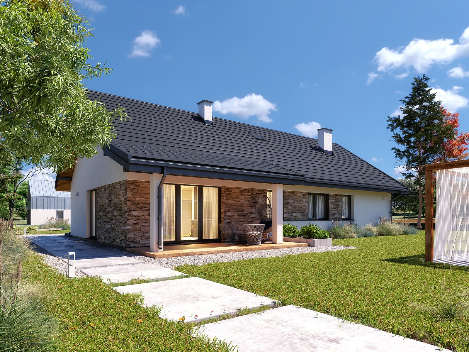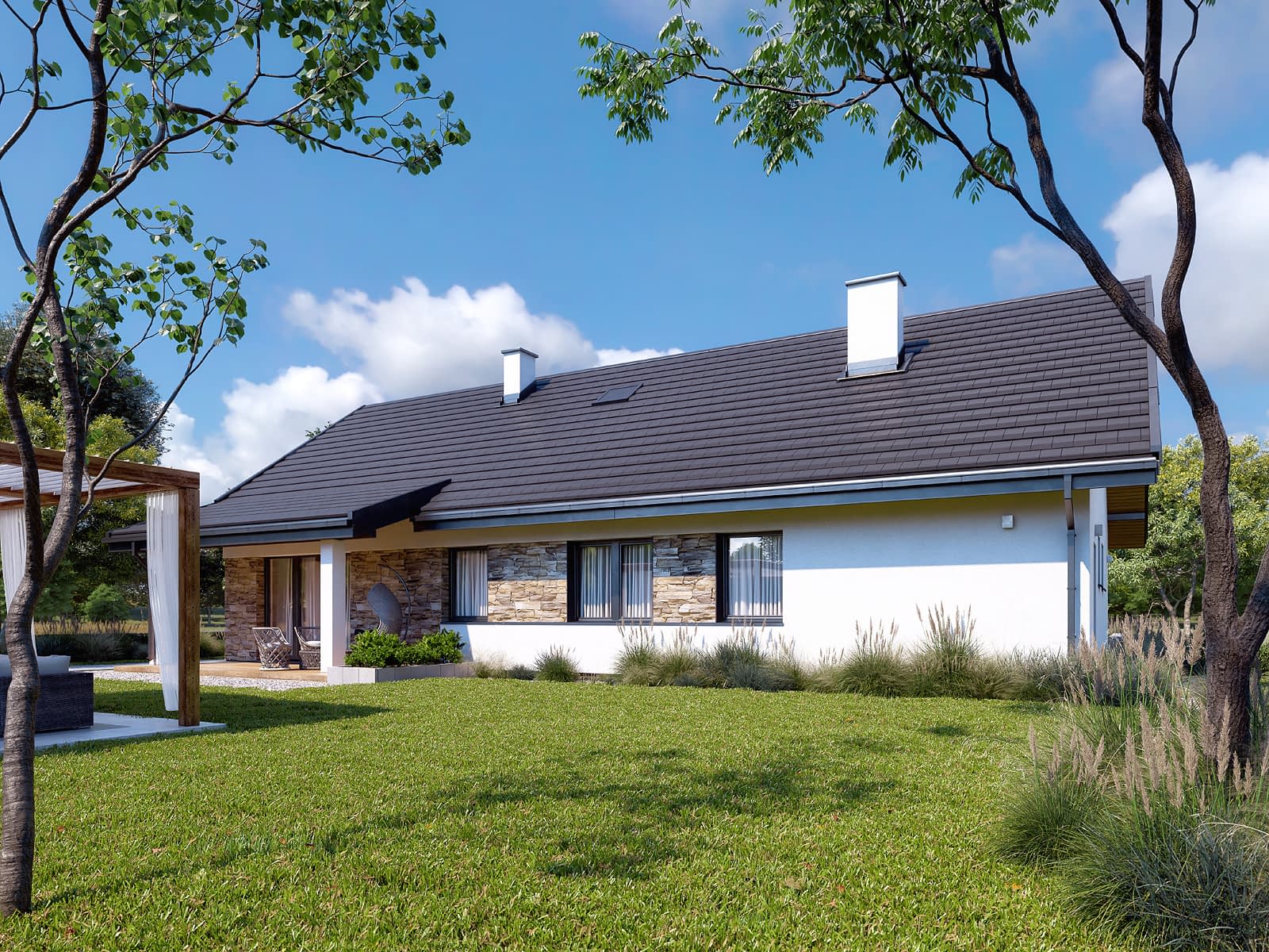 Awokado 4 to projekt domu parterowego z jednostanowiskowym garażem. Układ funkcjonalny został podzielony na strefę dzienną, nocną i gospodarczą. Strefa dzienna to otwarta kuchnia ze spiżarnią i przestronny salon z miejscem na duży stół jadalniany. Strefa nocna to ogólnodostępna łazienka, trzy sypialnie, w tym jedna z prywatną łazienką i garderobą. W strefie gospodarczej znajduje się niewielkie pomieszczenie gospodarcze, które pełni funkcję przejścia do garażu oraz kotłowni. Z kotłowni zaprojektowano oddzielne wejście z zewnątrz do domu. Głównym atutem projektu jest zadaszony taras dostępny z salonu.Konstrukcja