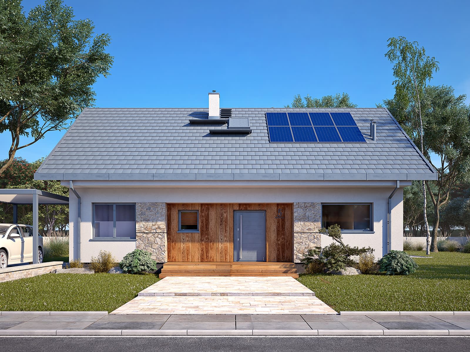 Awokado 5 to projekt domu z poddaszem użytkowym, który łączy nowoczesny design z praktycznymi rozwiązaniami. Układ funkcjonalny został podzielony na strefy: dzienną, nocną i gospodarczą, co sprzyja komfortowemu użytkowaniu. Strefa dzienna obejmuje przestronny salon z jadalnią oraz otwartą kuchnię ze spiżarnią, tworząc komfortowe miejsce do życia codziennego. Duże przeszklenia prowadzą na zadaszony taras, który stanowi przedłużenie strefy wypoczynkowej. Strefa nocna składa się z czterech sypialni, w tym jednej głównej z prywatną garderobą. Dodatkowo do dyspozycji domowników znajduje się przestronna łazienka oraz osobne WC, co podnosi komfort użytkowania. Strefa gospodarcza obejmuje pomieszczenie techniczne oraz kotłownię. Atutem projektu jest przemyślany układ pomieszczeń, który zapewnia funkcjonalność oraz komfort na co dzień.Konstrukcja