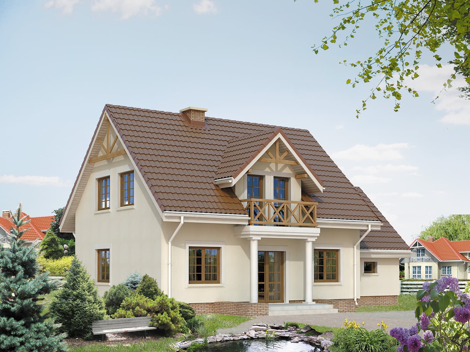 Ściany: 2-warstwowe - pustak ceramiczny + styropian, Stropy: żelbetowe, wylewane, Dach: dachówka ceramiczna CREATON,Rzuty