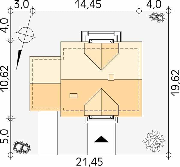 Dom jednorodzinny z poddaszem użytkowym, garażem i piwnicą. Na parterze oprócz części dziennej znajdziemy dodatkowy pokój. W piwnicy zaprojektowano kotłownię i dwa pomieszczenia gospodarcze. Na poddaszu znajdują się trzy sypialnie, łazienka i garderoba.Konstrukcja